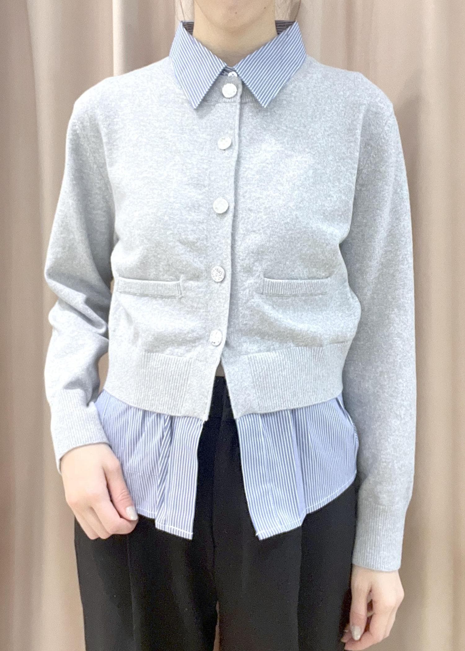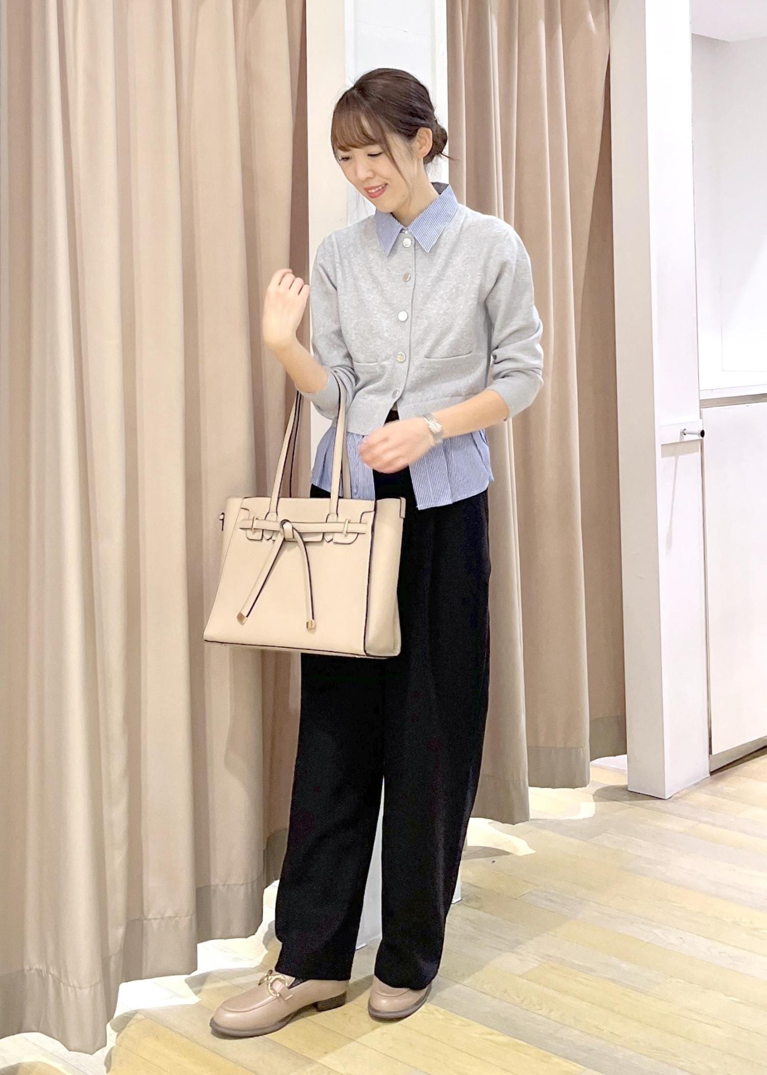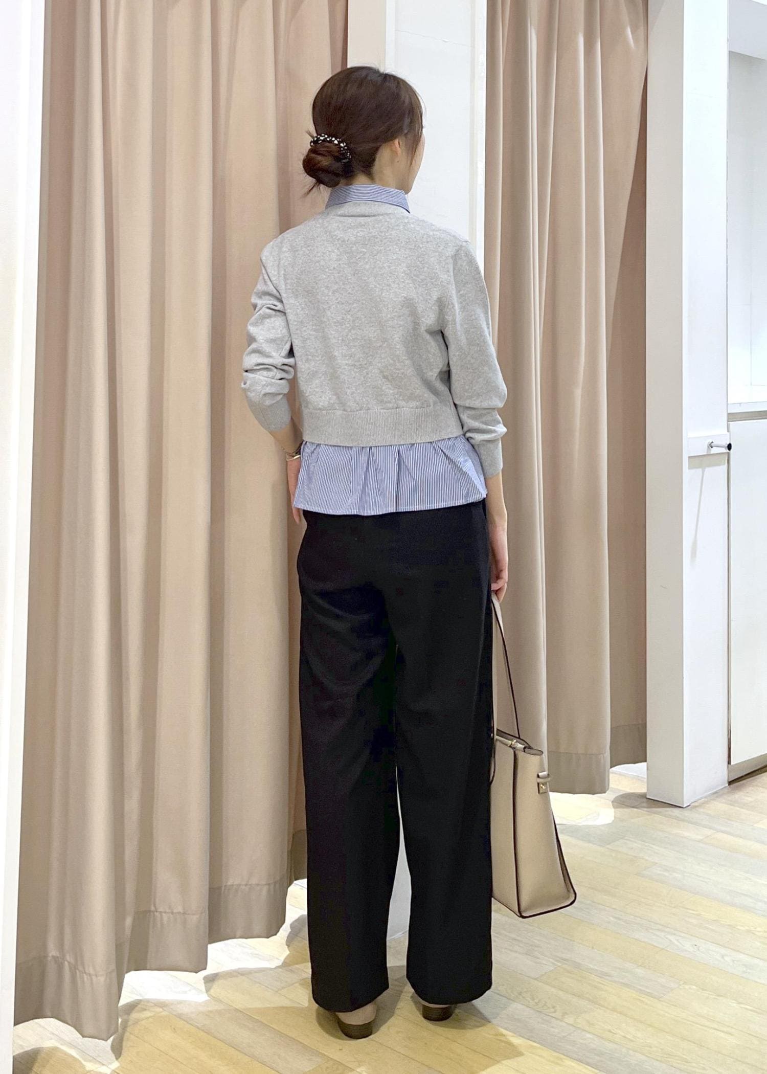 シャツレイヤード風メタルボタンカーディガンのお仕事コーデ