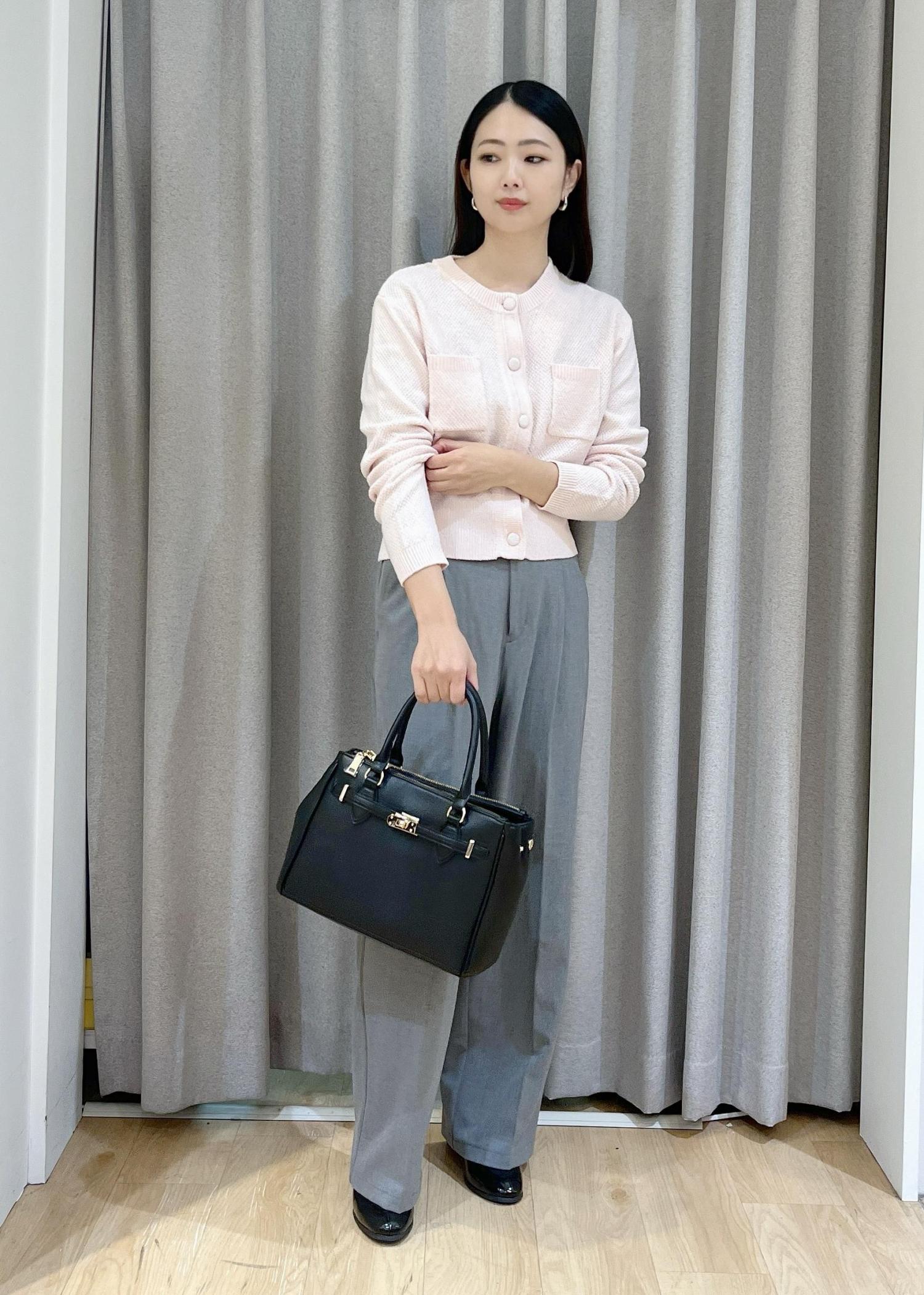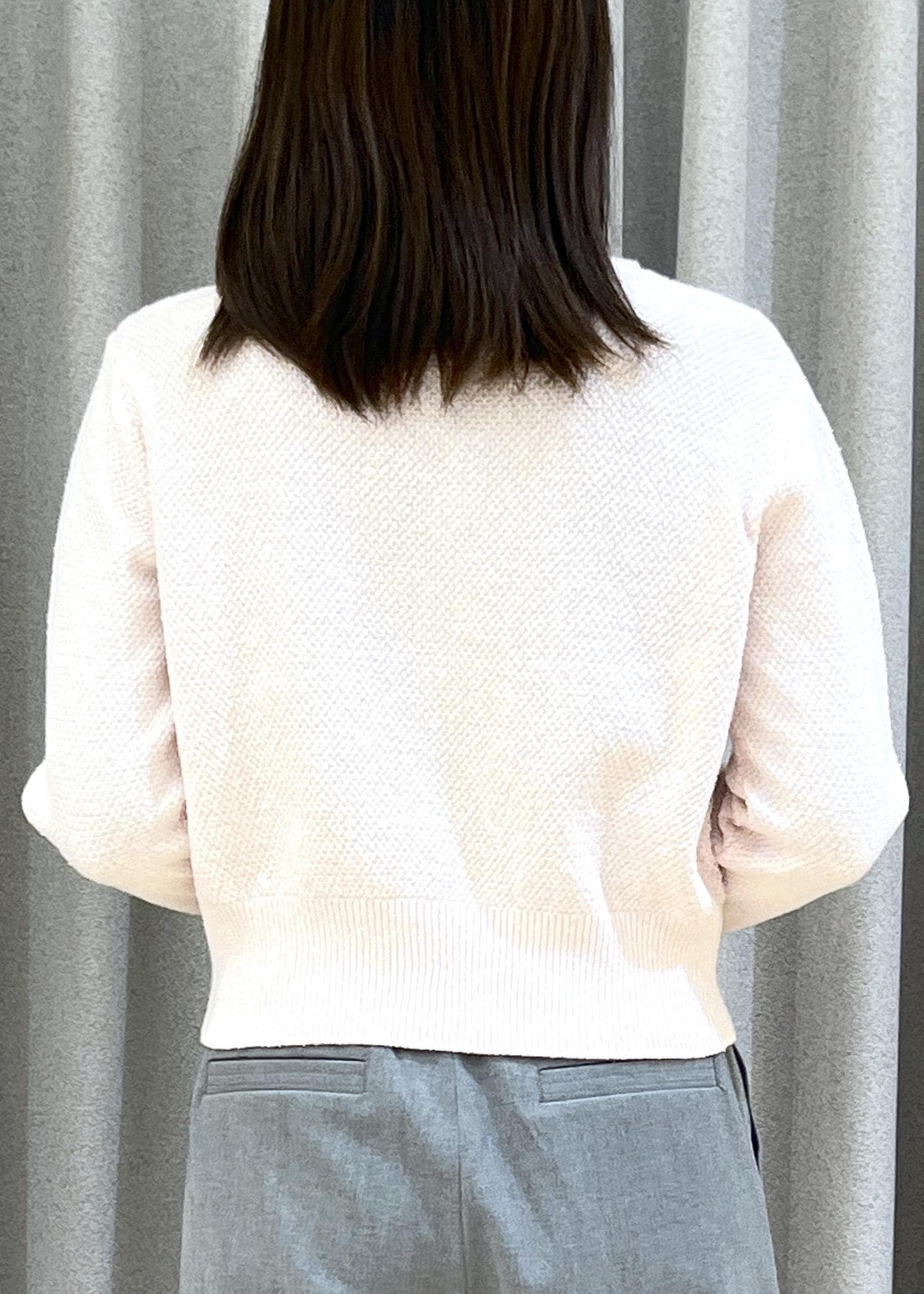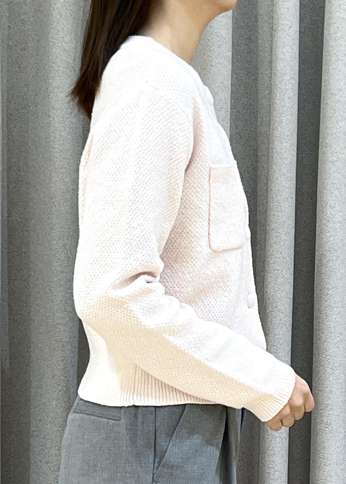 柔らかなニット素材で着心地がよく、くるみボタンが上品な印象に◎ -