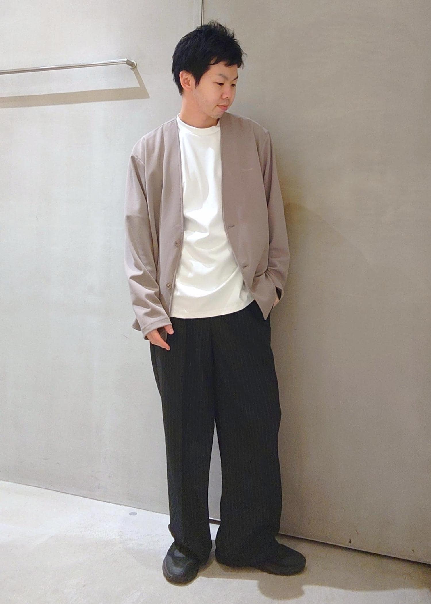 ジップとスナップボタンが付いていますので、今回のように一番上だけとめて着用すると格好良くきまります。
