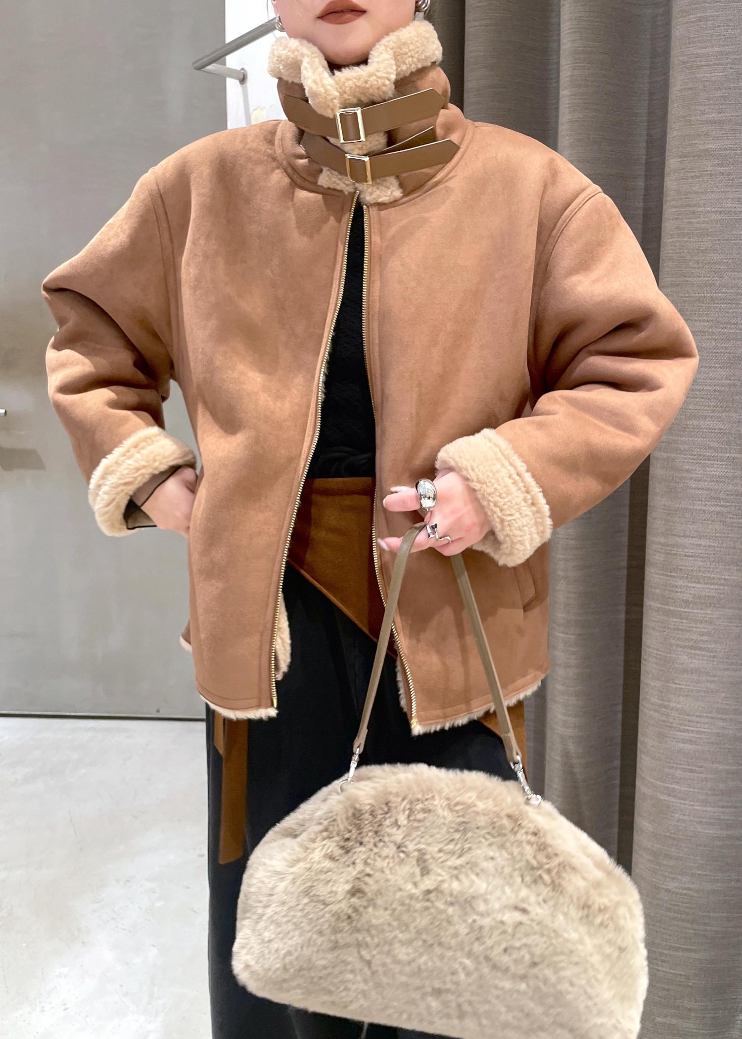 ジップのゴールドに華やかさを感じ、アクセサリーと合わせるのもおすすめです。スタンドカラーにすればマフラーが不要で風通しも防ぎます -