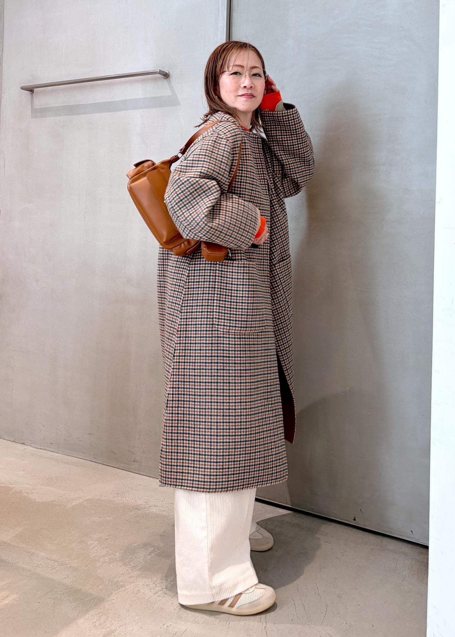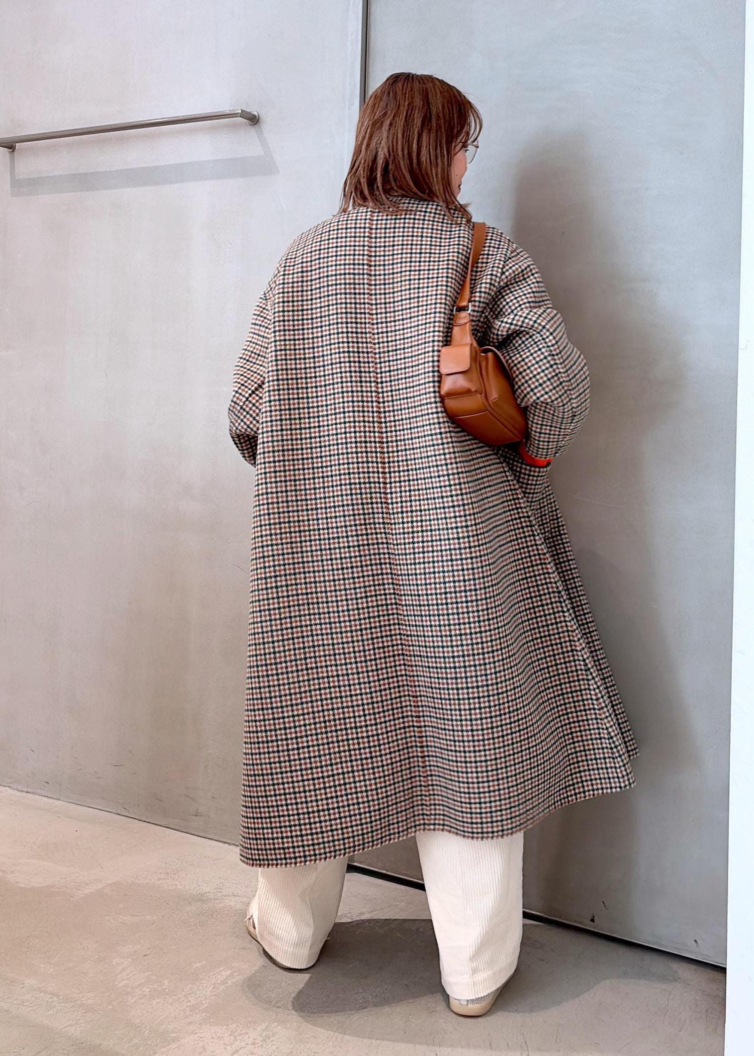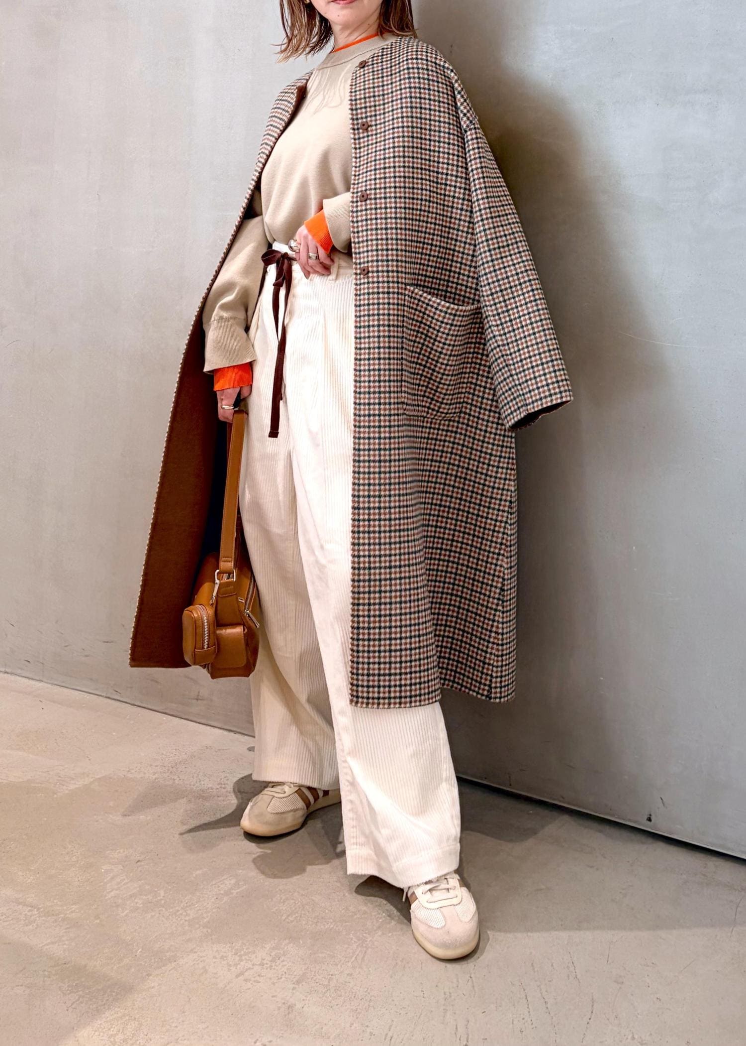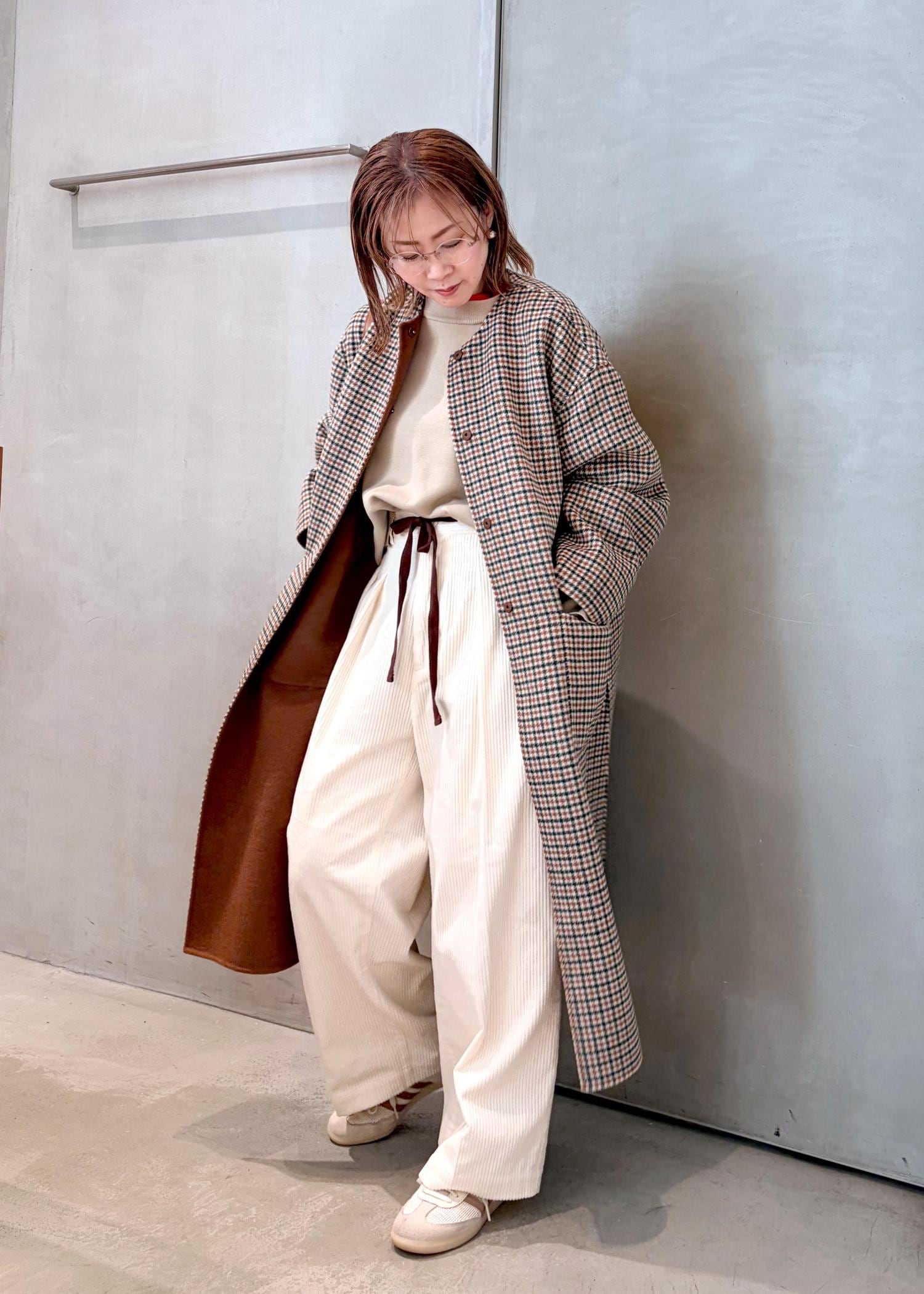 ブラウンチェックのコートで、ワントーンにまとめてマニッシュな雰囲気にしてみました。