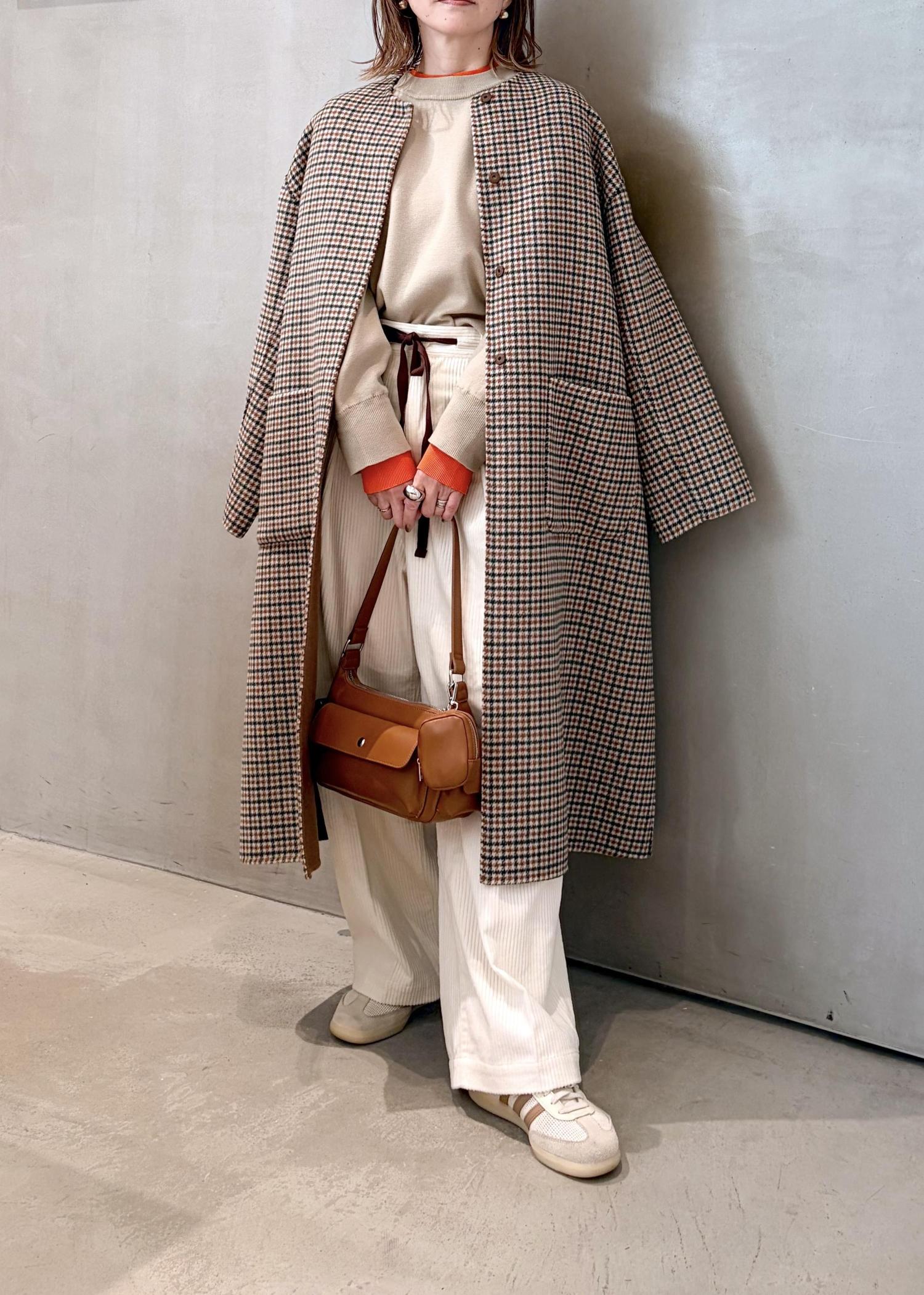 柄物のコートですが、シックなカラーと細かいチェックなので取り入れやすく、さっと羽織るだけで、いつものコーディネートに変化をつけられますよ。