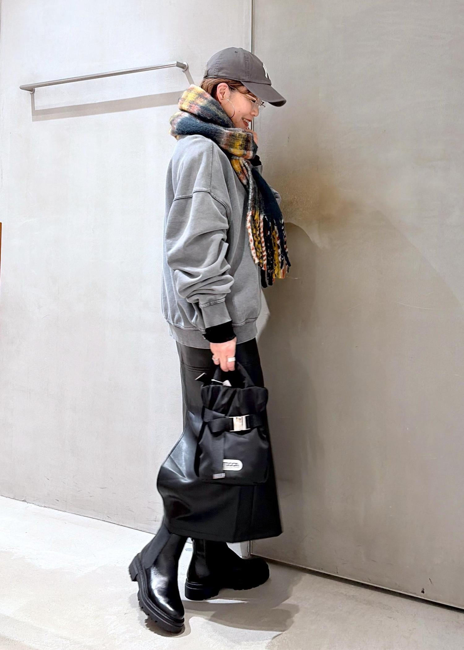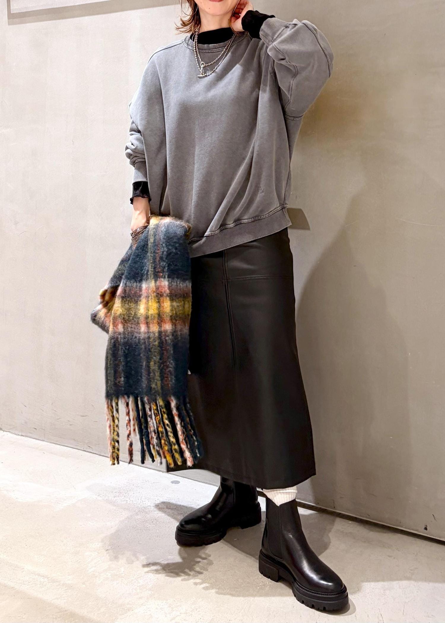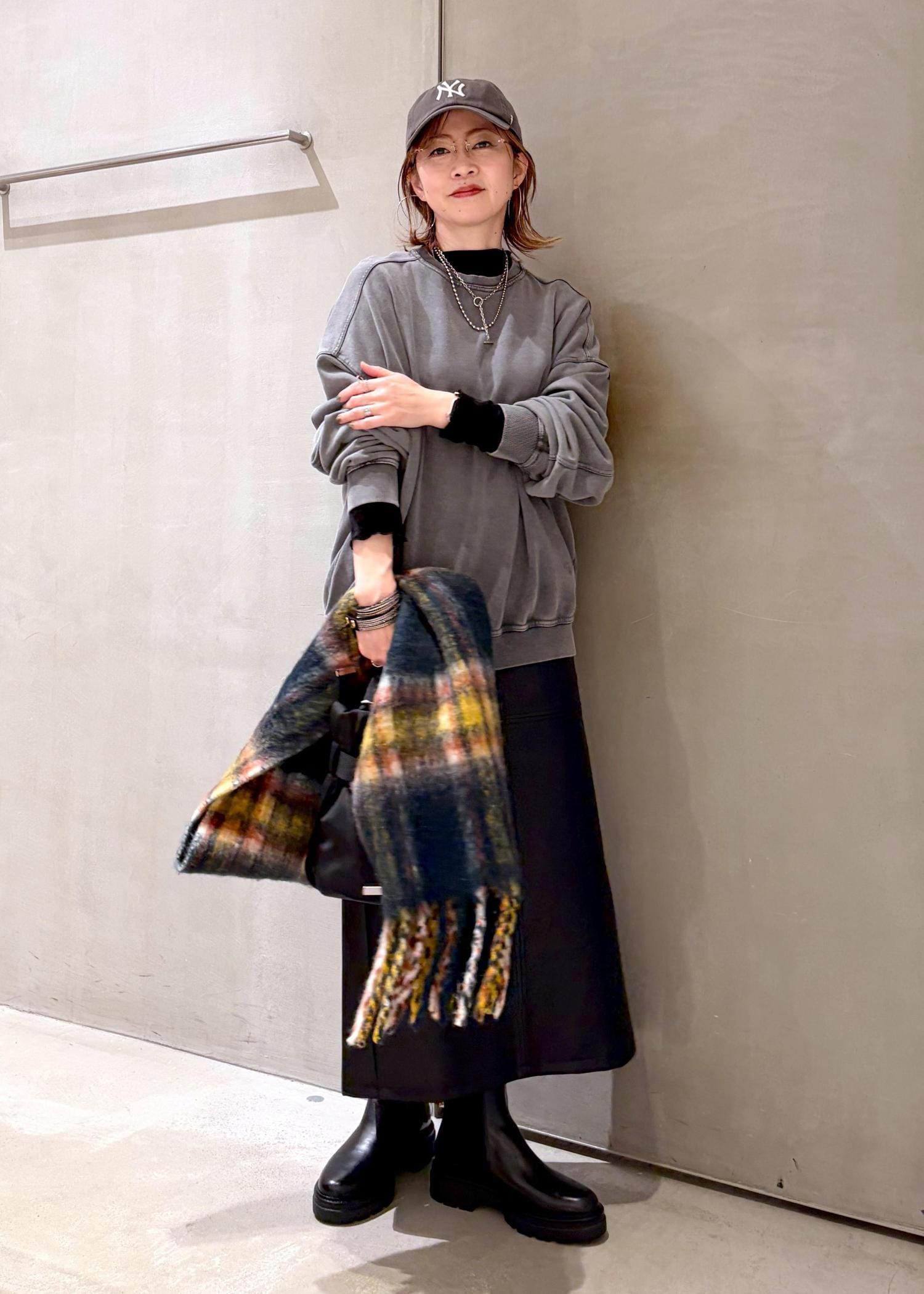 ヴィンテージ感のあるスウェットをチェック柄のマフラーでアクセントをつけて、大人カジュアルにまとめました。