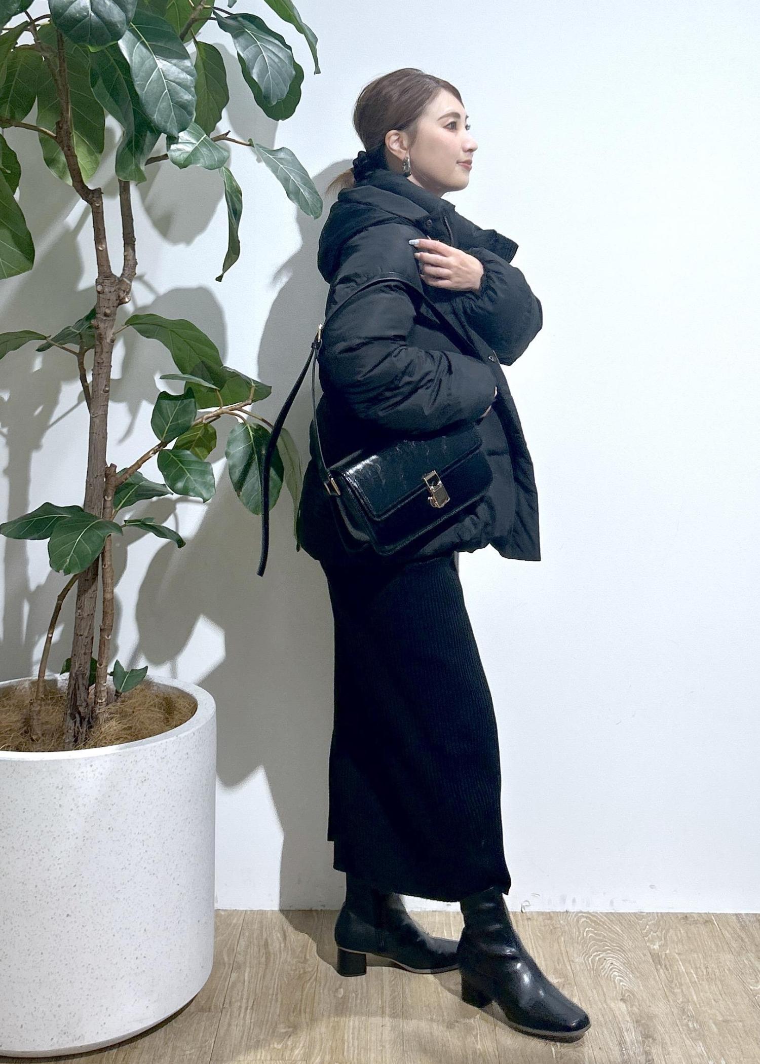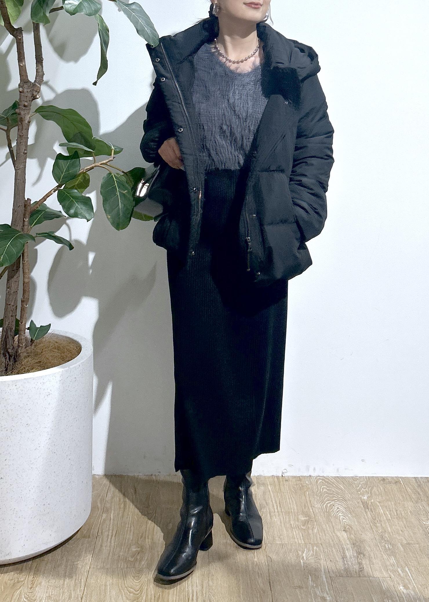 軽くてあたたかいダウンのインナーには毛足の長いフェザーニットを合わせました。Vネックトップスなのでアクセサリーやストールを巻いて細部までオシャレを楽しめるコーデです♪