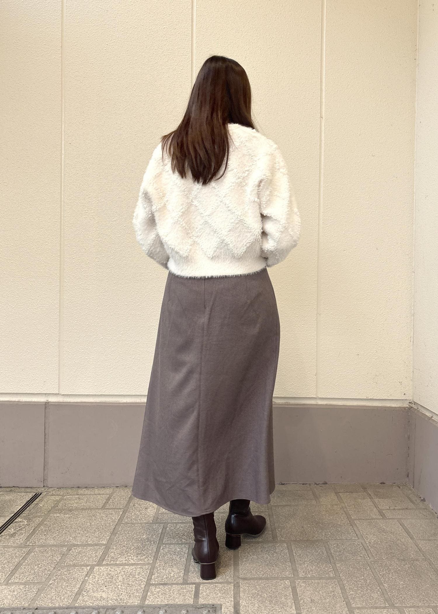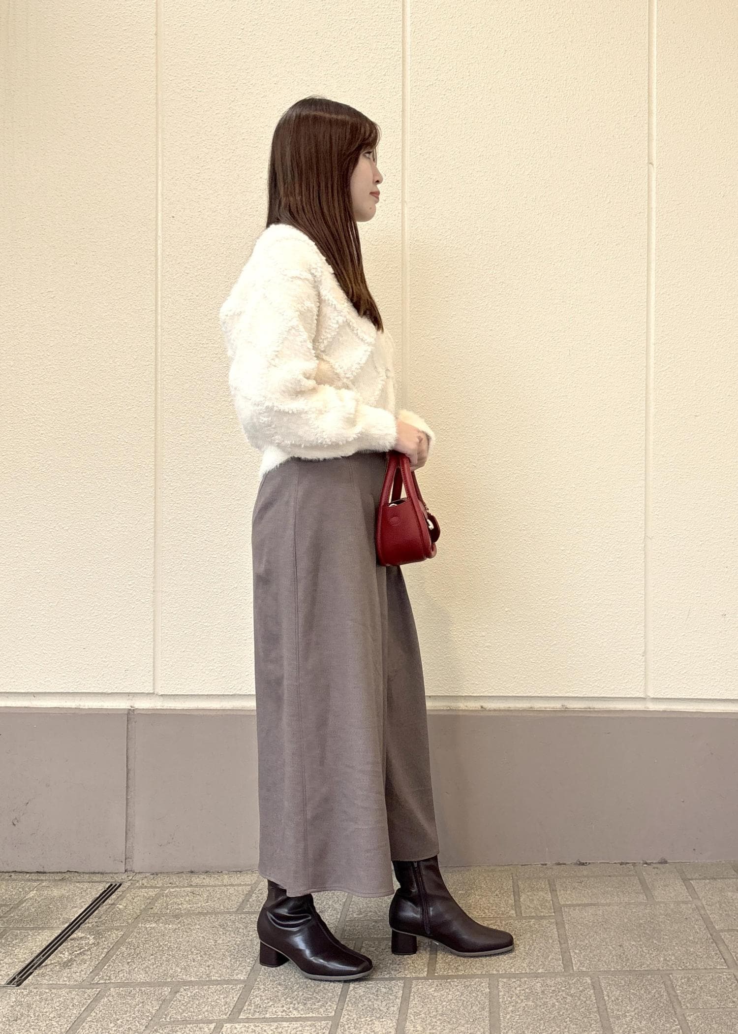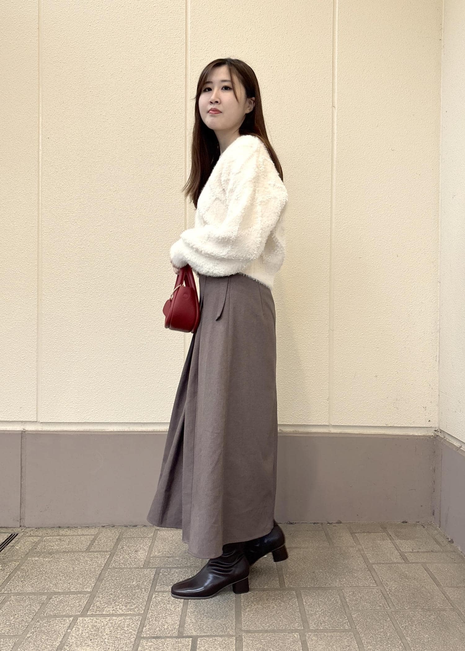 また、ショート丈のカーディガンにロング丈のスカートを合わせ、全体のバランスを整えました!