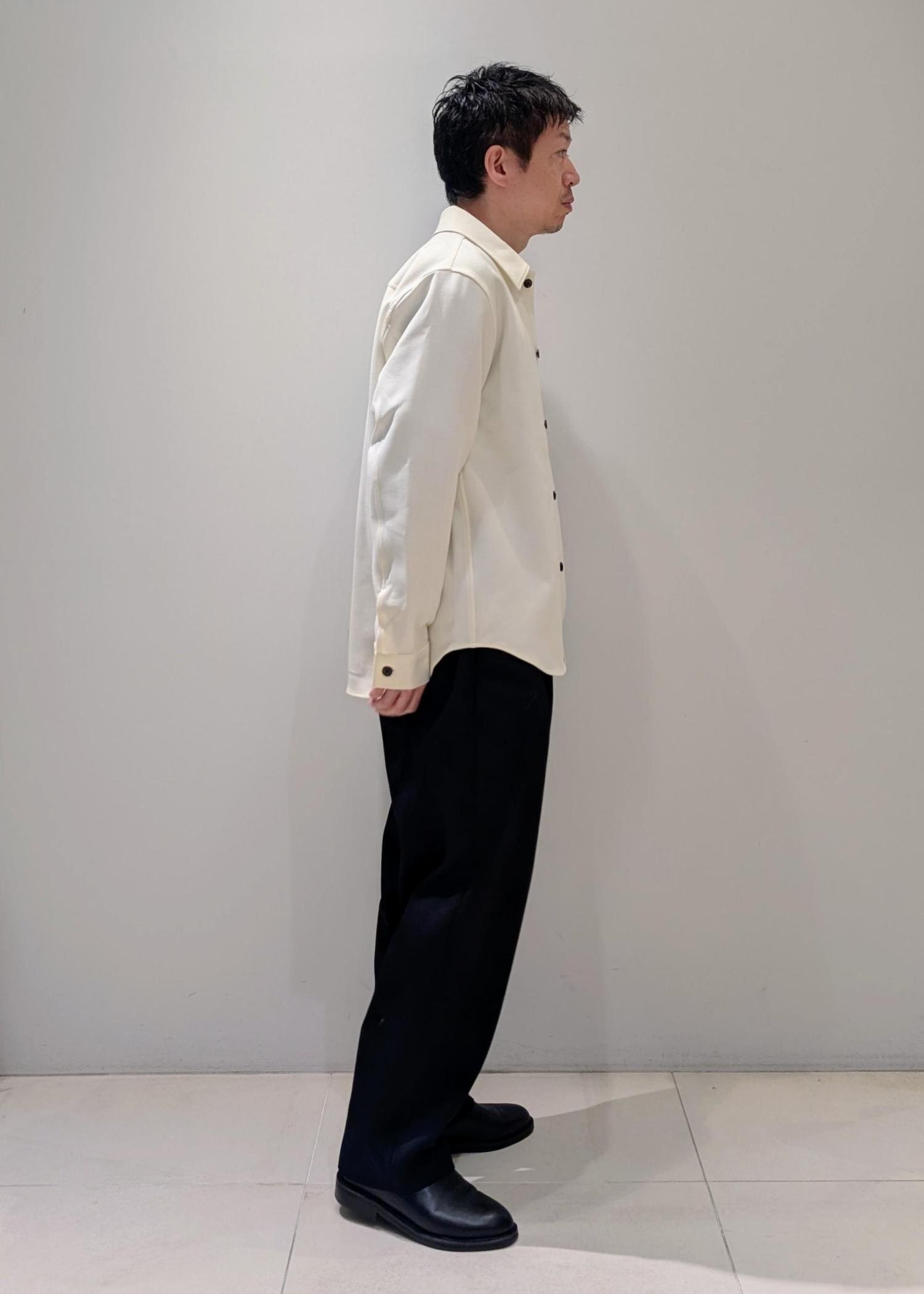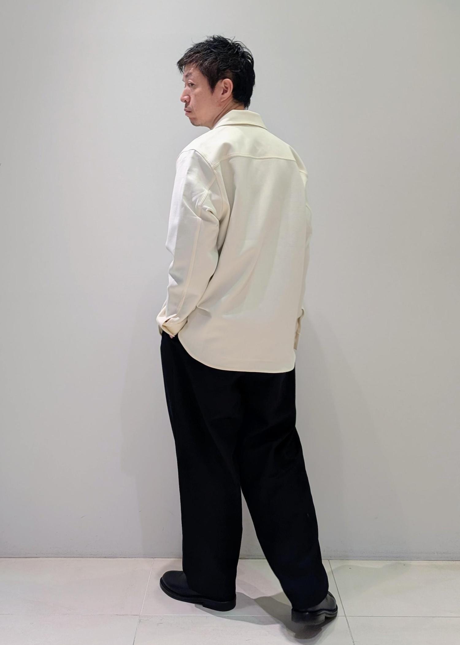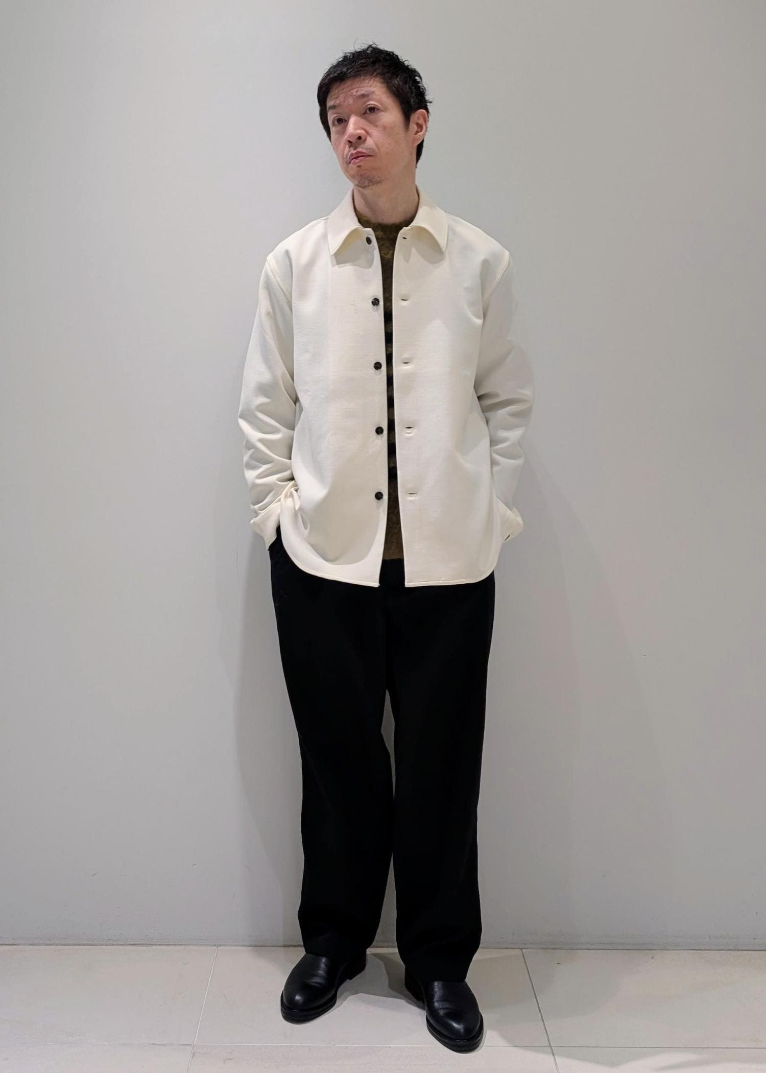 ウール×ポリエステル混紡の二重織りストレッチ素材。滑らかな光沢とシワになりにくさが特徴。オーバーサイズながらスマートに着られる羽織りシャツ。裾パイピング仕様で型崩れ防止。シャツとブルゾンの良さを併せ持つ上質な一枚です。