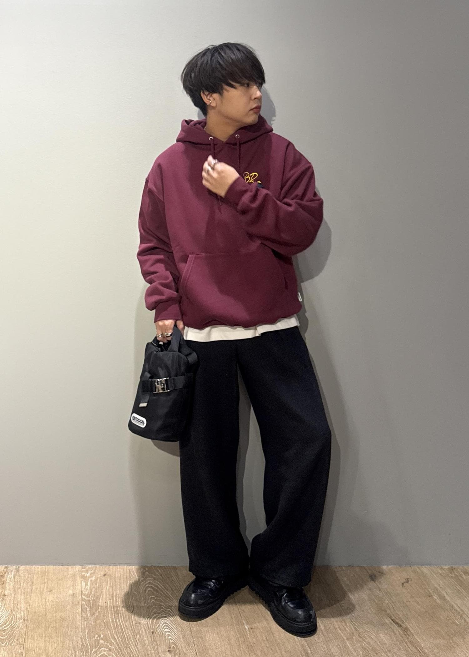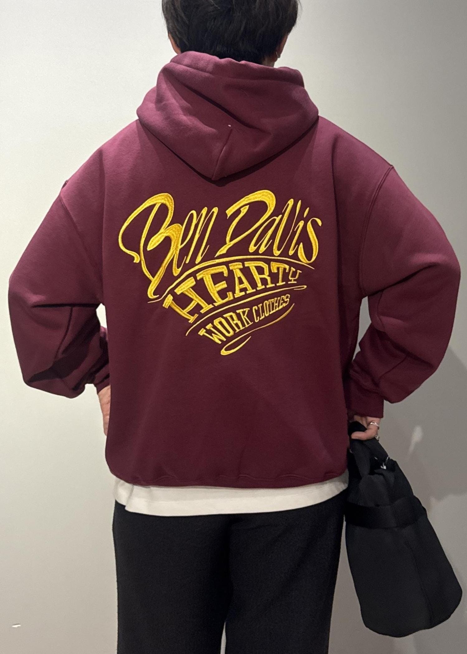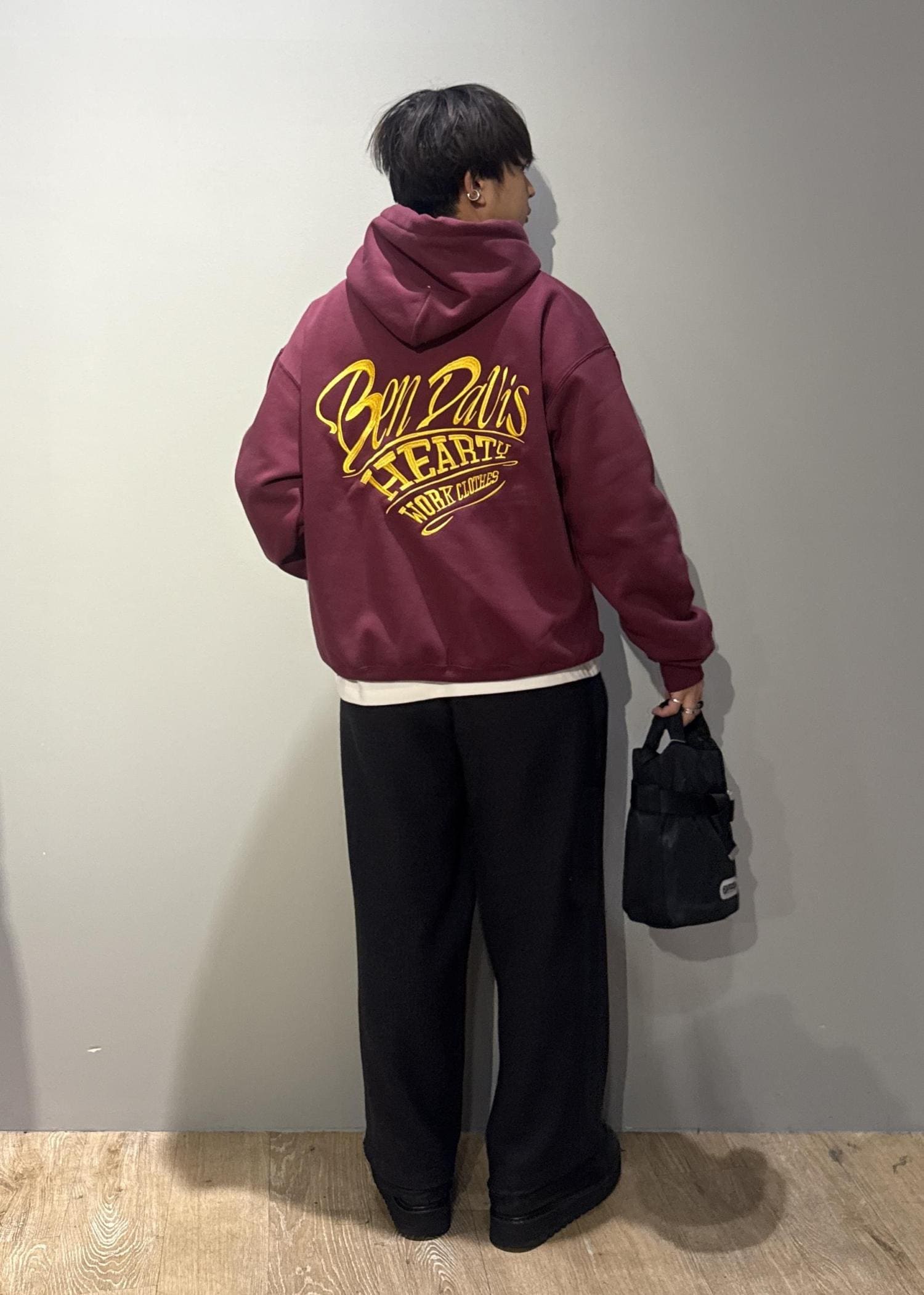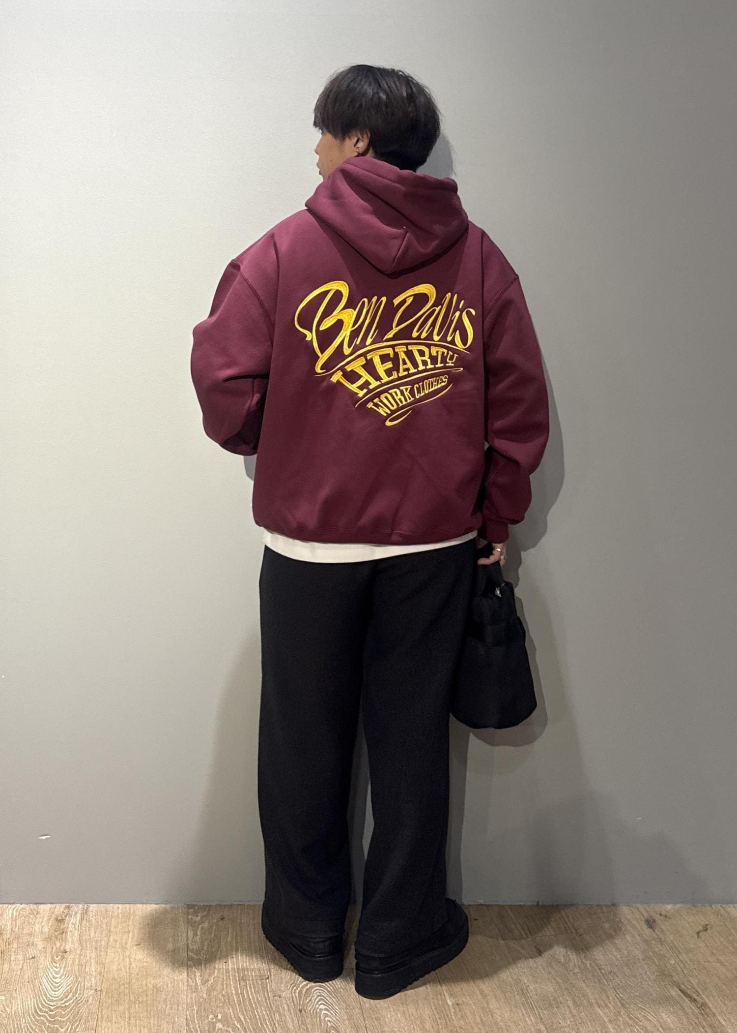 今回は【BENDAVIS別注】ハートモチーフプルオーバーを使ったコーデです。胸元のワンポイント、バック刺繍がインパクトのある1枚。インナーでも1枚着でも存在感の出るアイテムです。