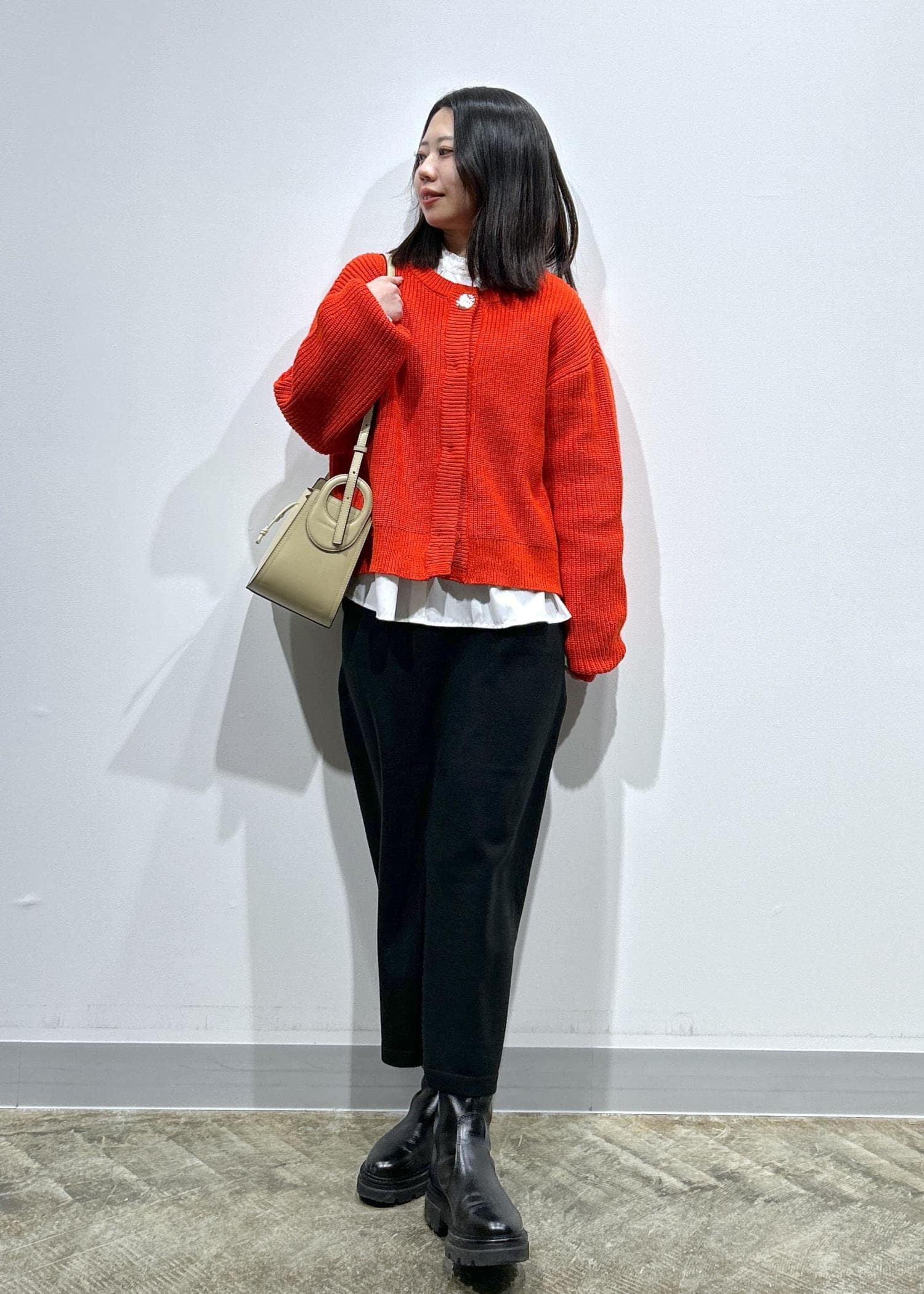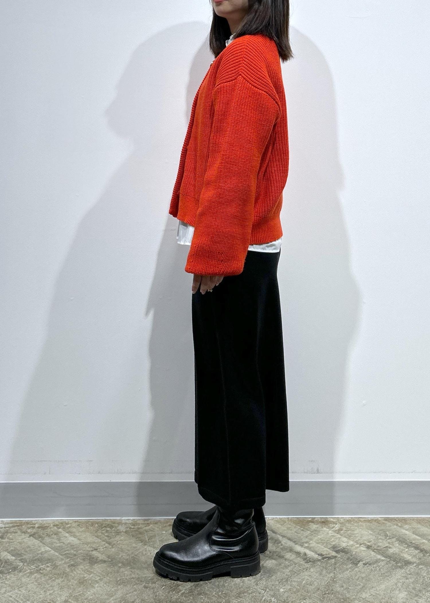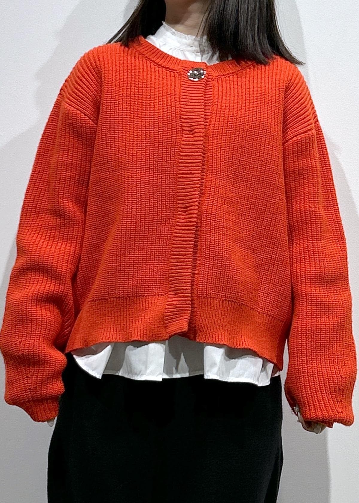 鮮やかな赤が目をひくカーディガンに