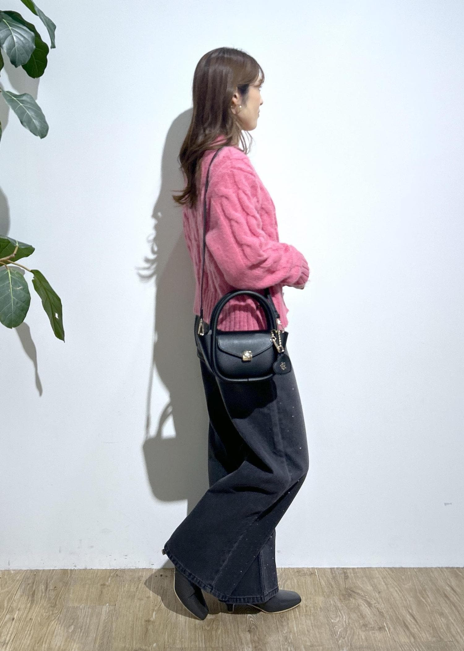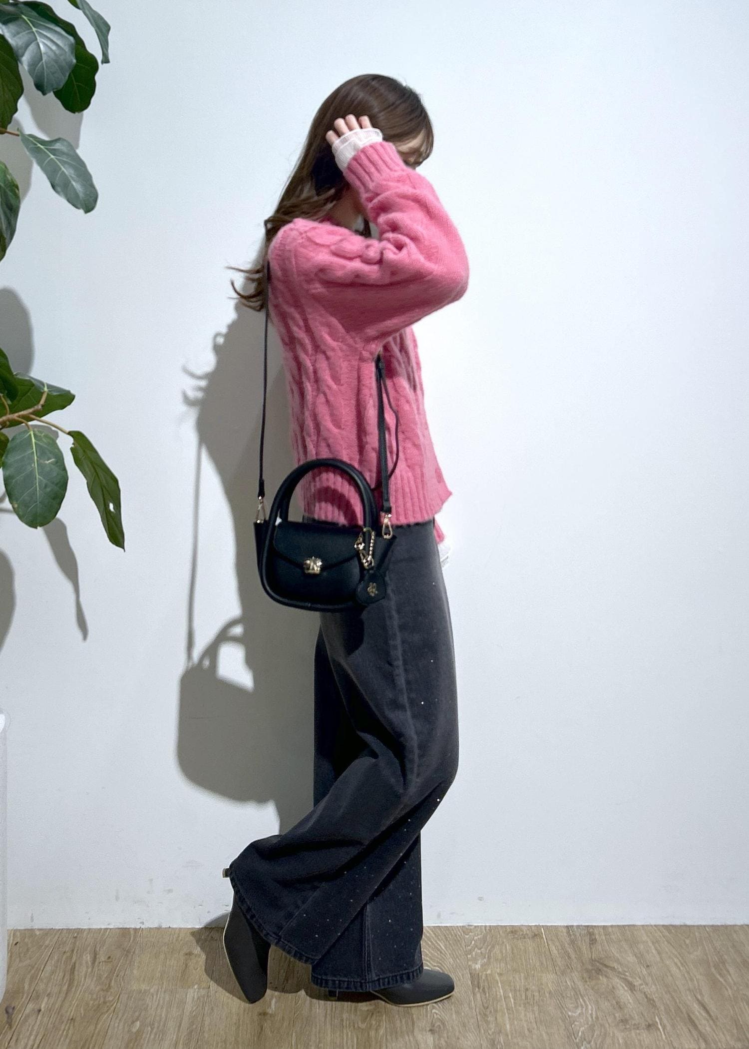 ピンクのニットにビジューデニムを合わせたコーデ。