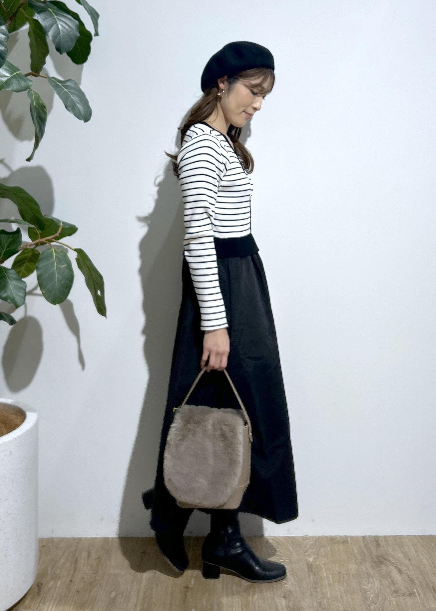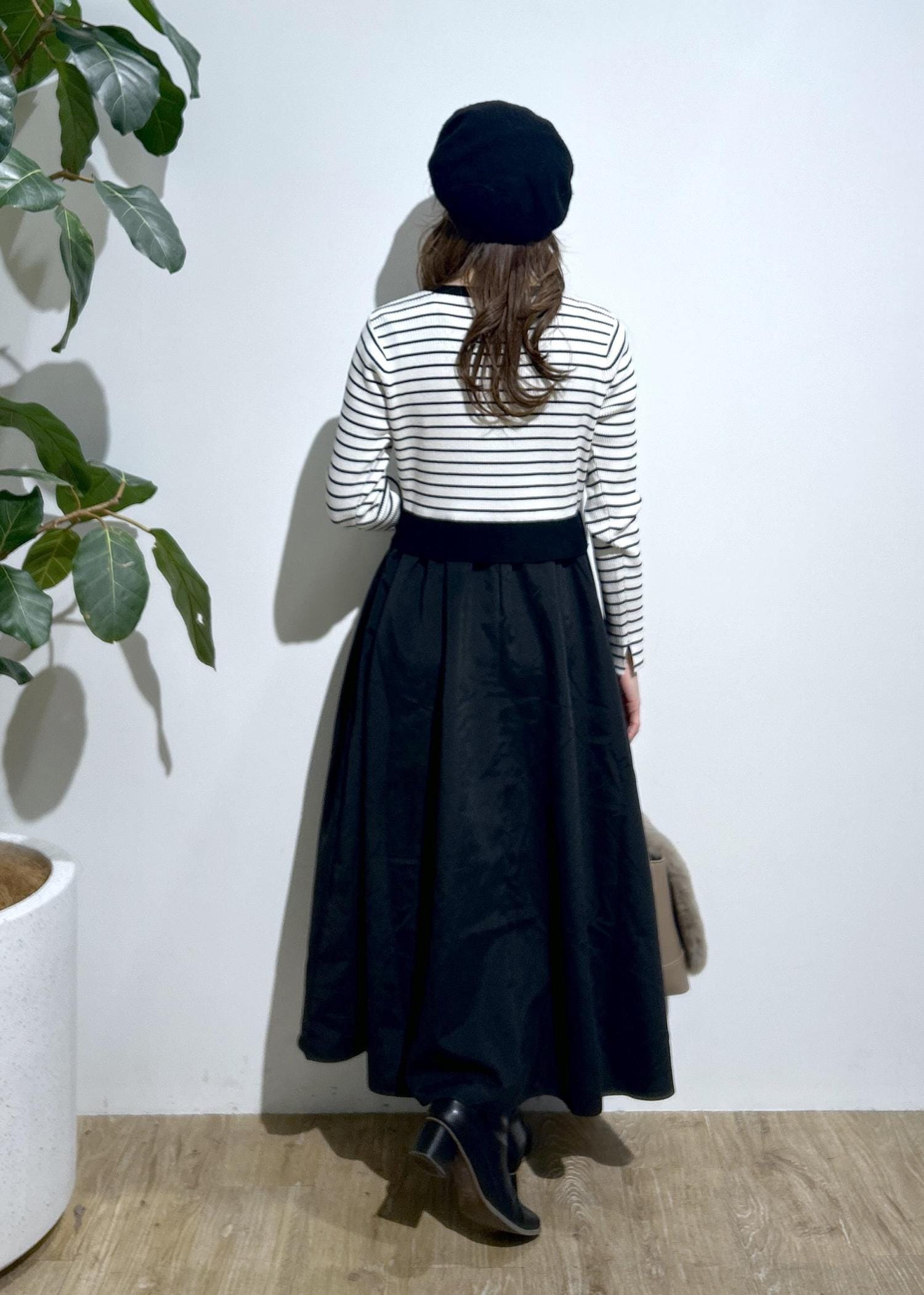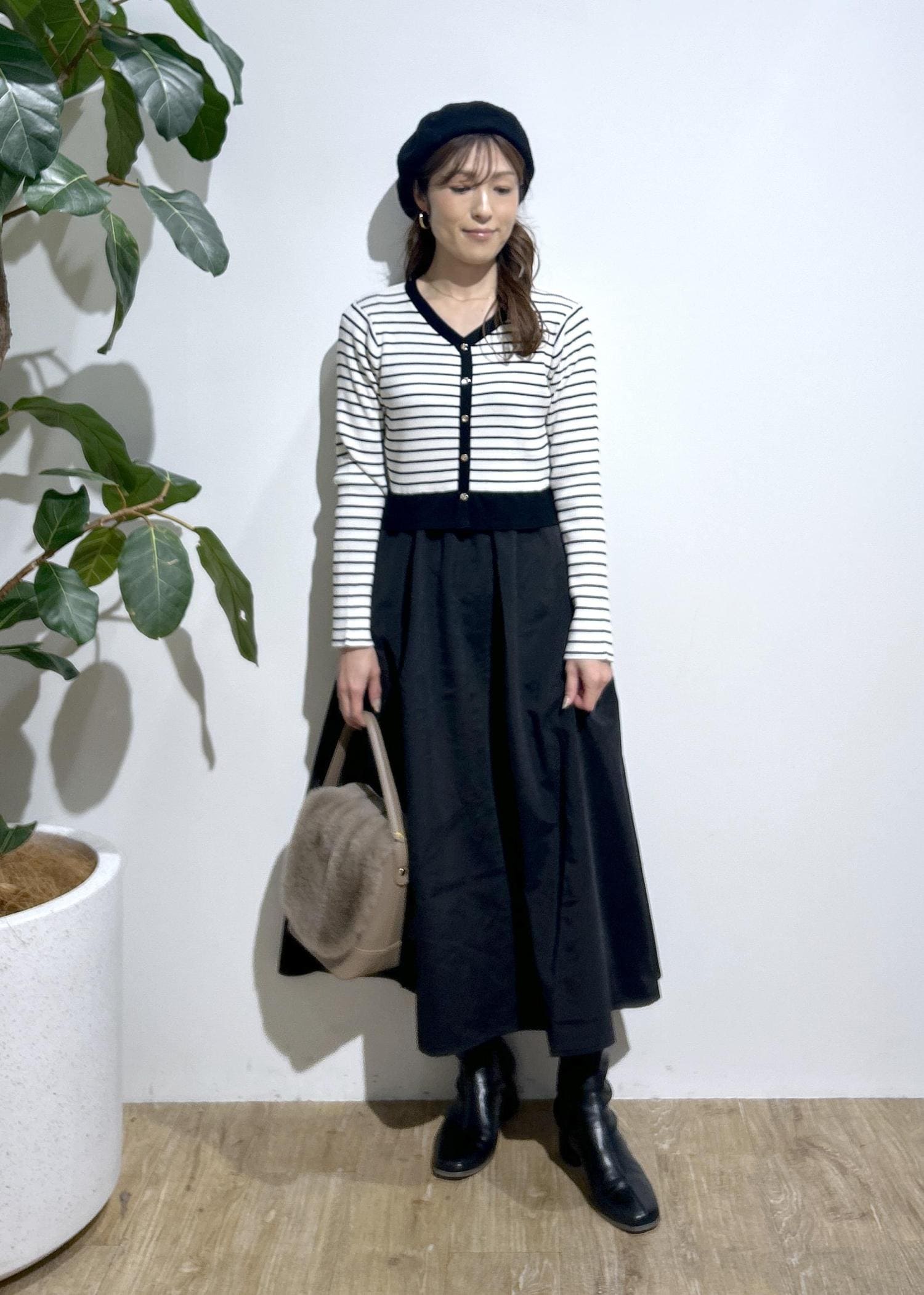 ボーダーとベレー帽で少しカジュアル感も出しつつ、ワンピースで綺麗見えするコーディネートに。