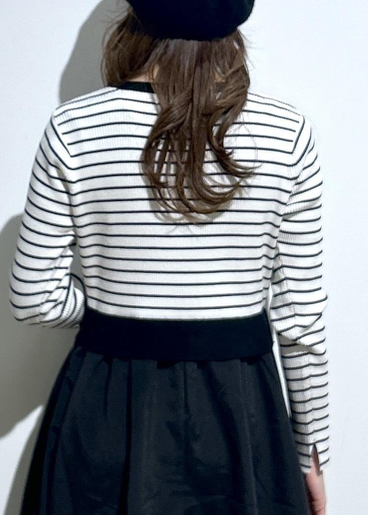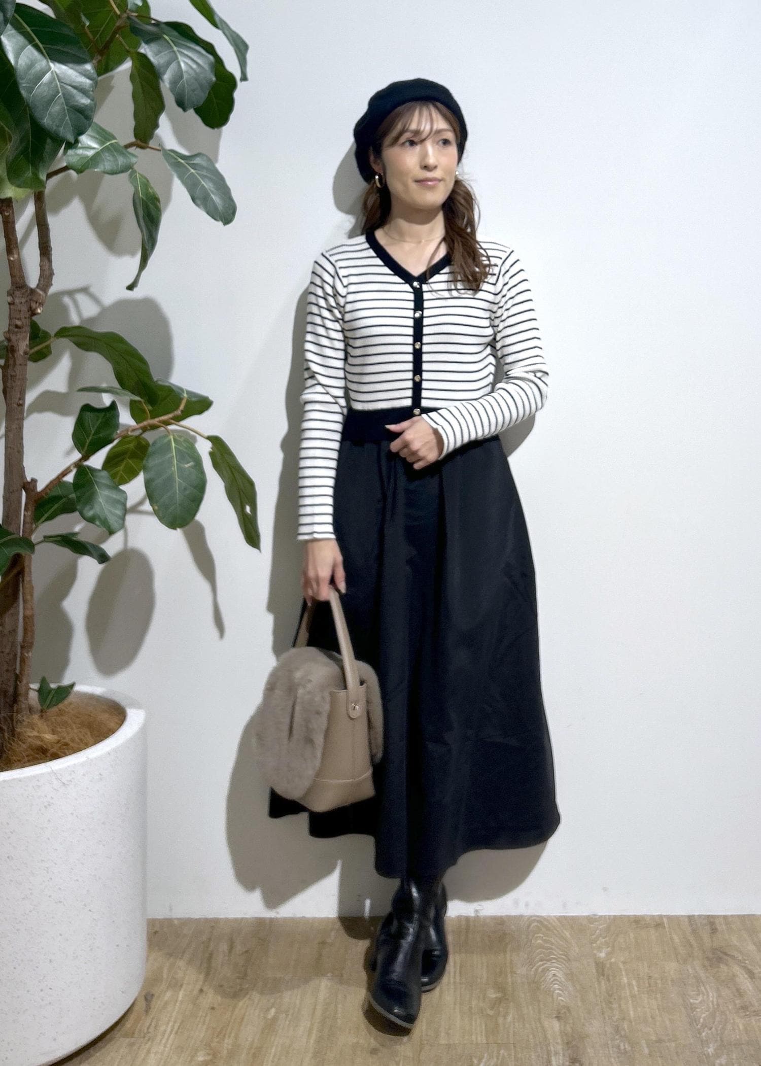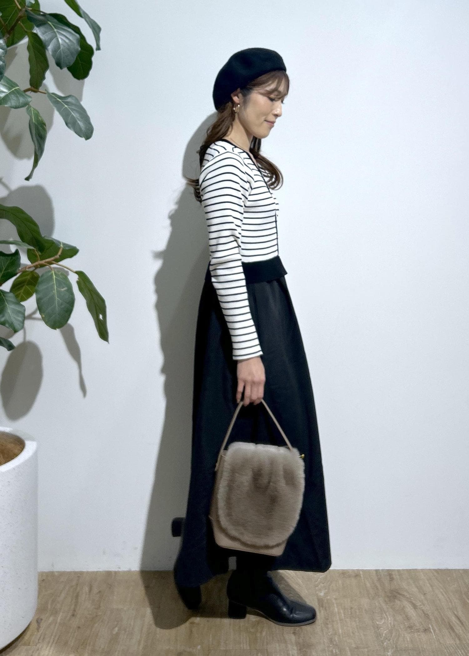 ボーダーとベレー帽で少しカジュアル感も出しつつ、ワンピースで綺麗見えするコーディネートに。