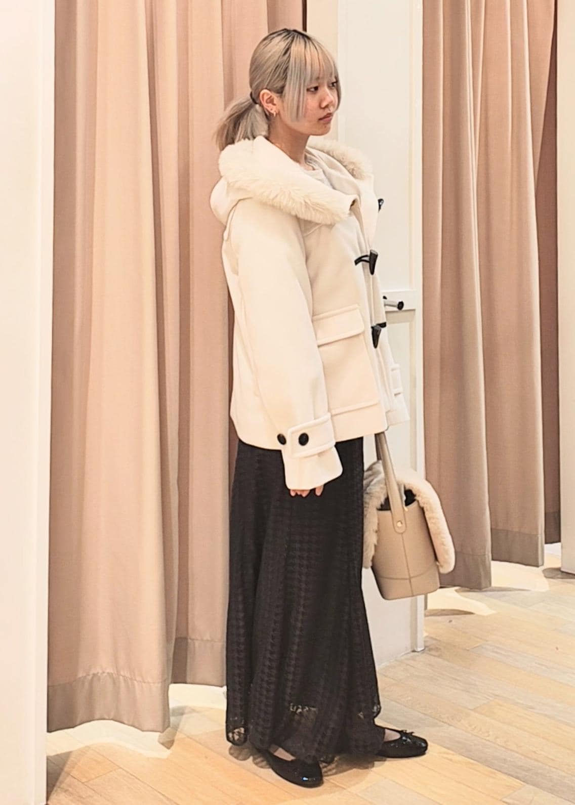 ダッフルコートはファーを付けて、より柔らかい雰囲気に♪
