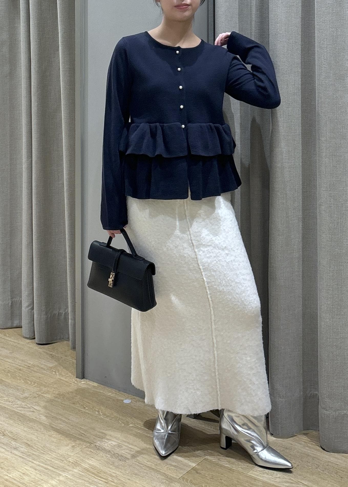 ティアードのデザインとパールボタンが可愛いカーディガンです。