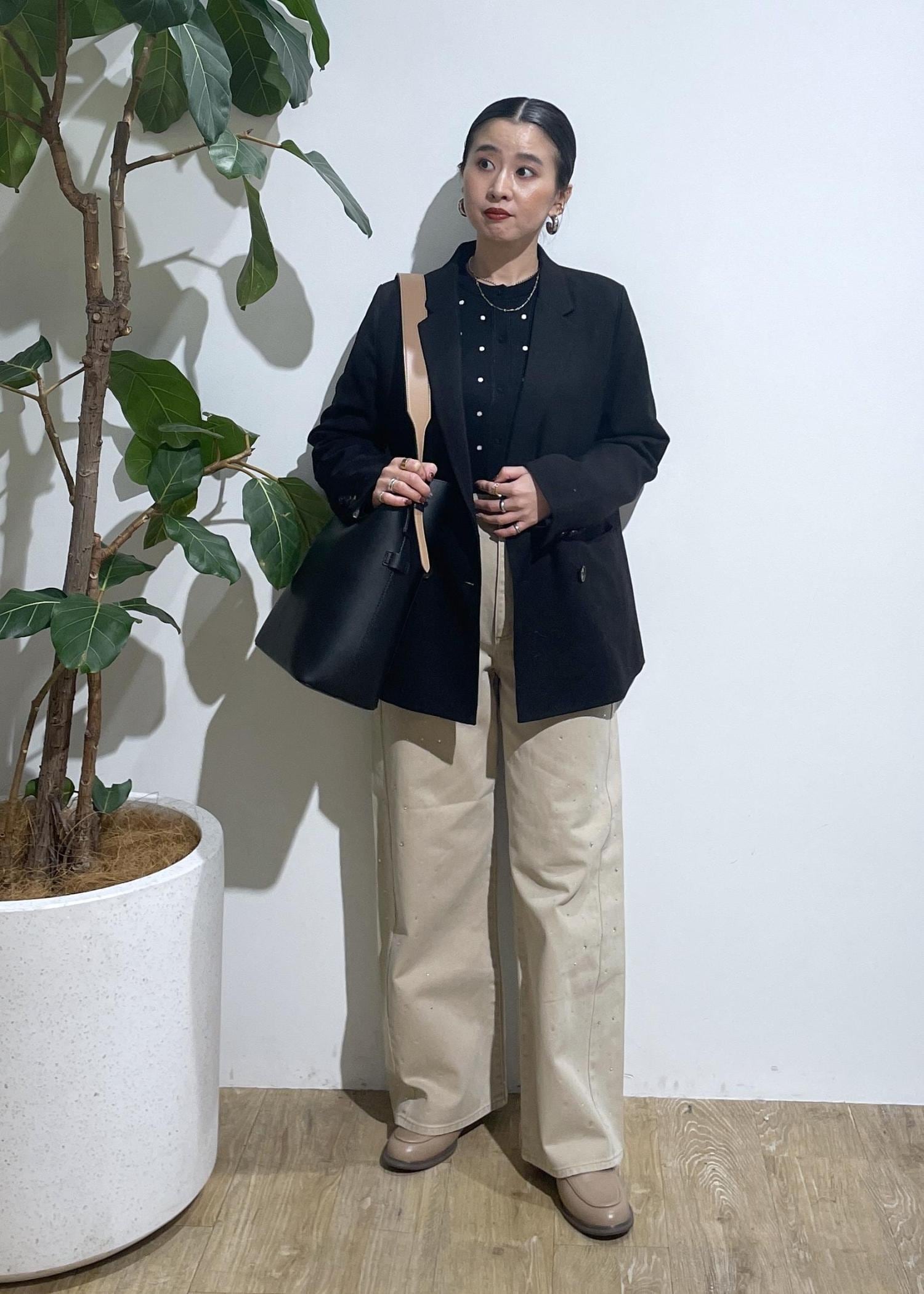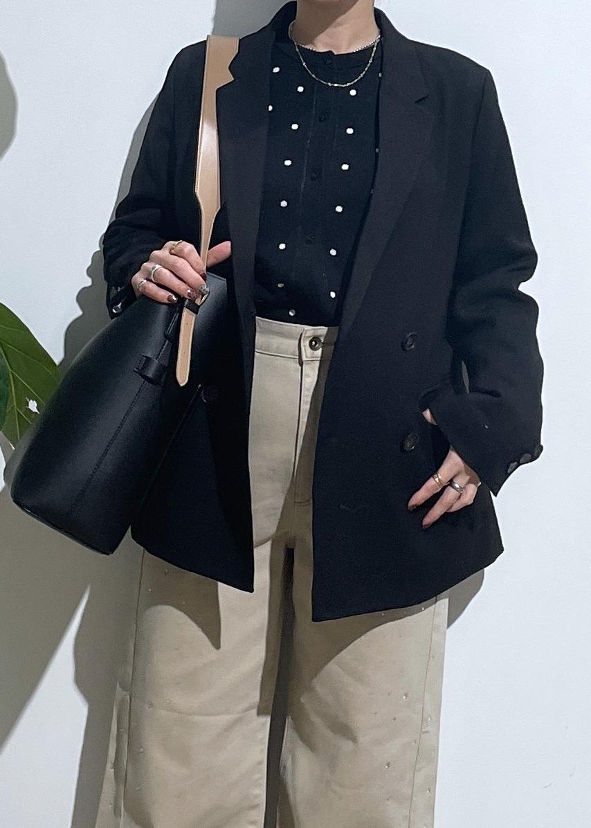 ジャケットは、オンオフと幅広い着用が可能なので一つ持っておくと便利です!そして、長い期間着用できるのでおすすめなアイテムです。カジュアル過ぎるのが苦手なので小物で少し綺麗めを取り入れました