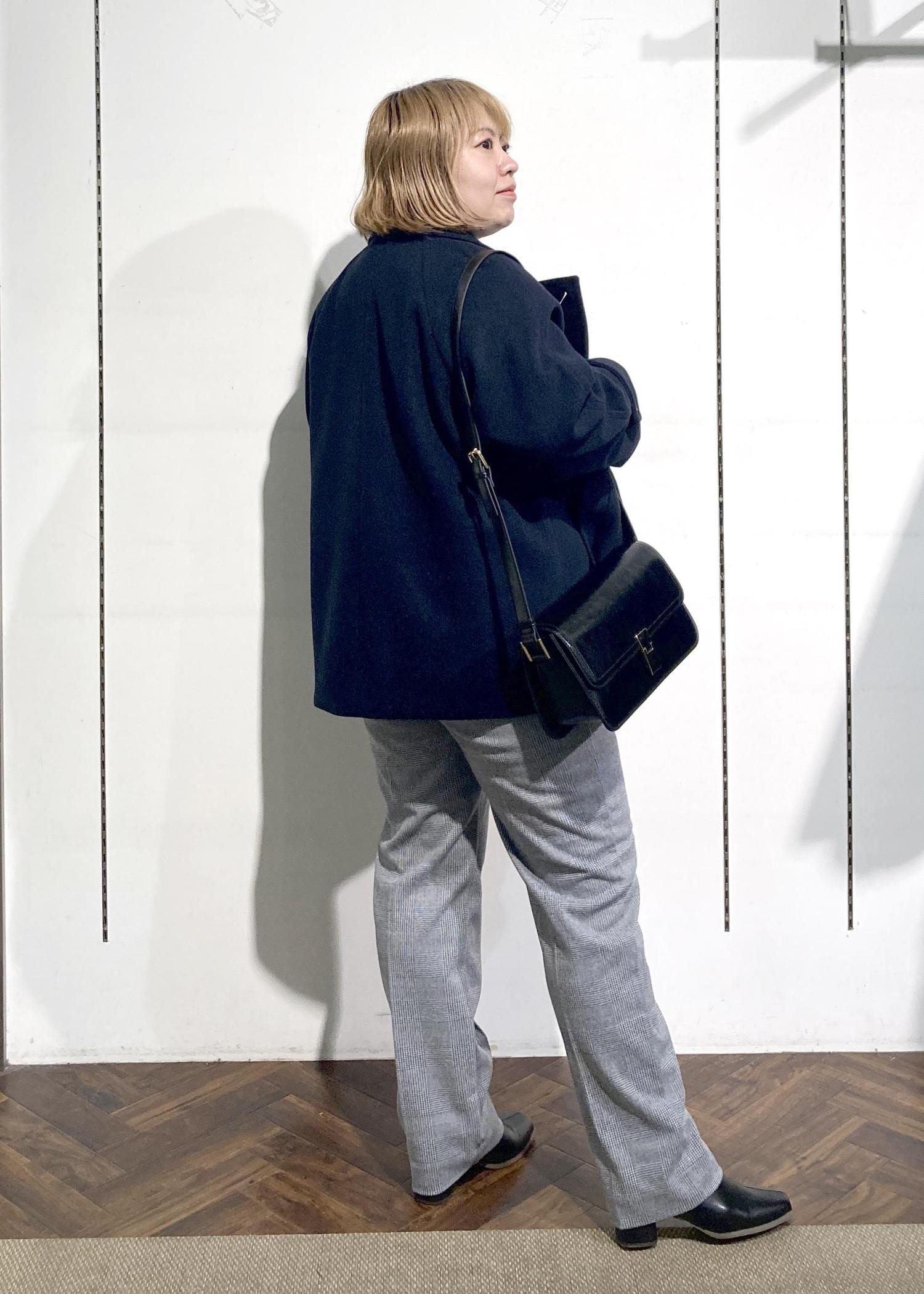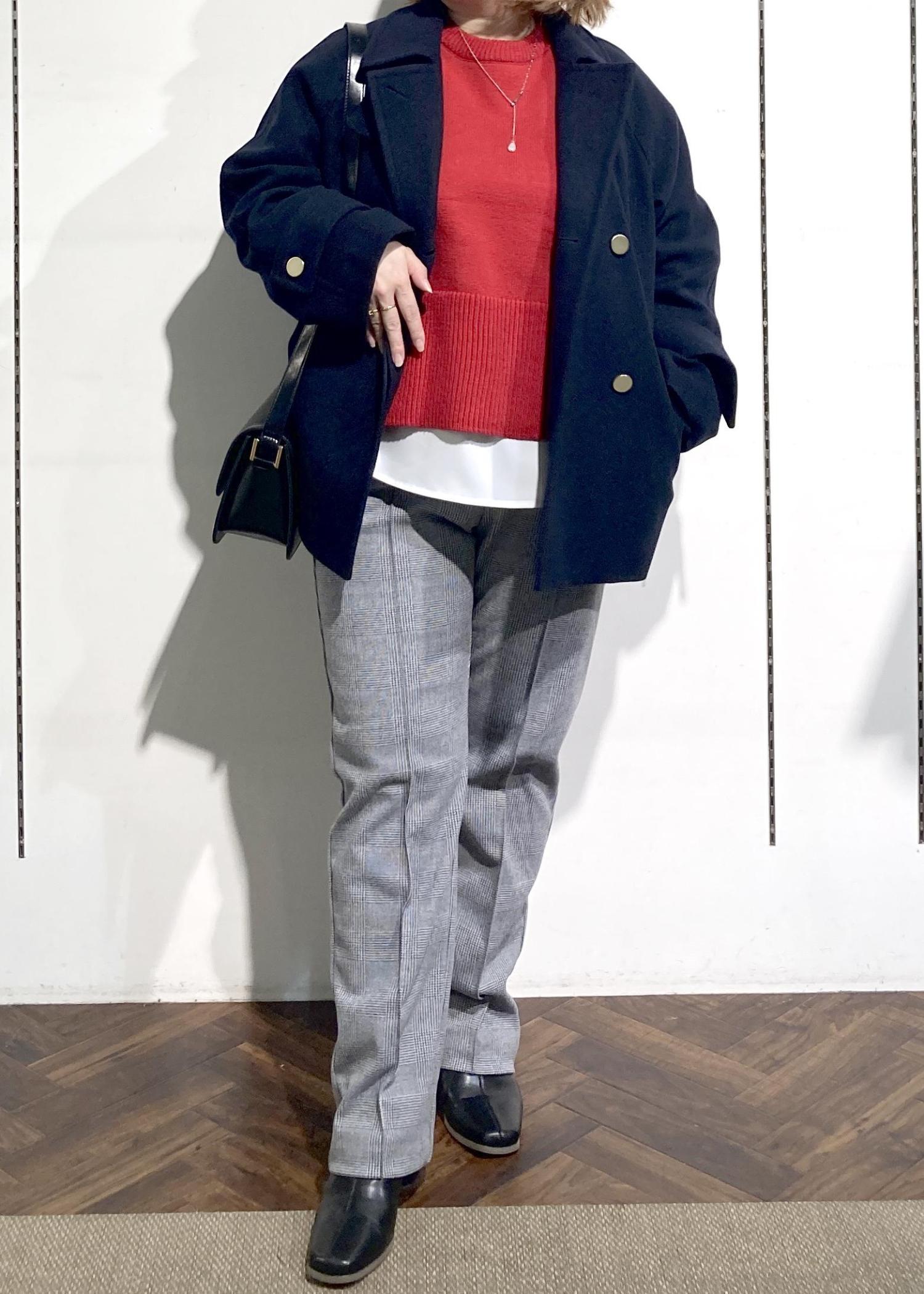チェック柄パンツと合わせて大人フェミニンな雰囲気にしました。