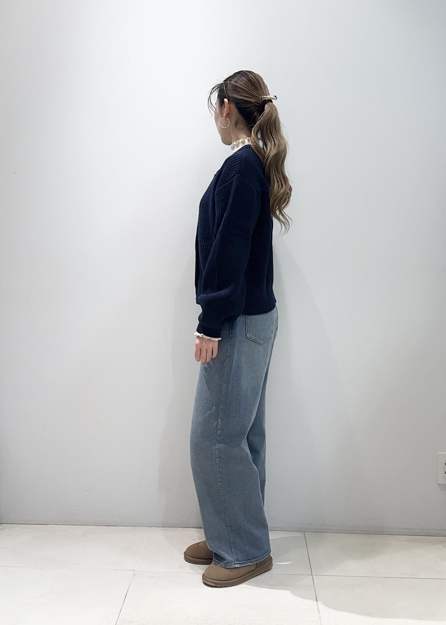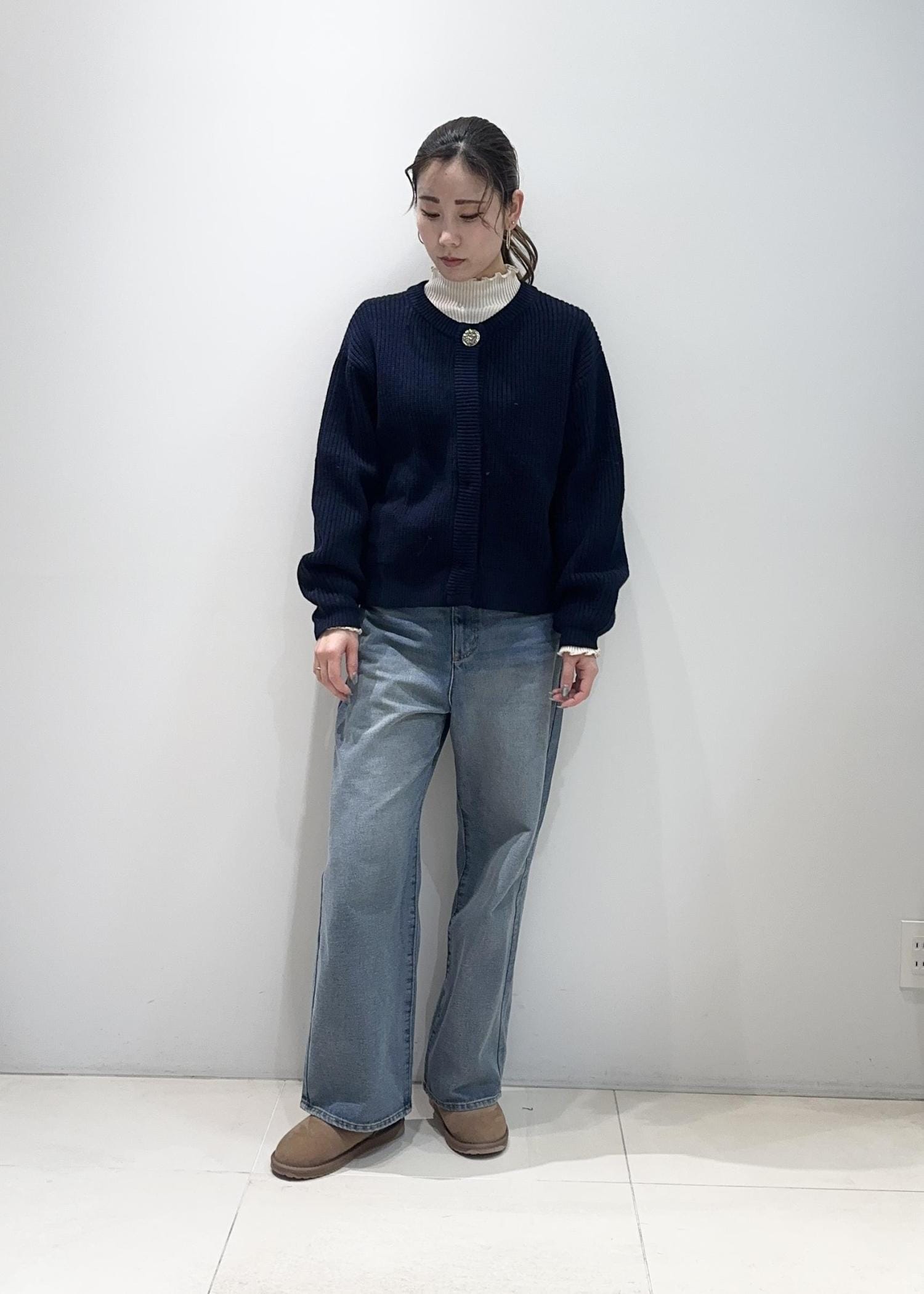 メタルボタンニットカーディガンコーデ