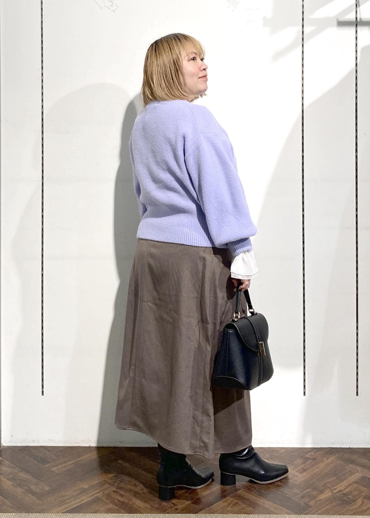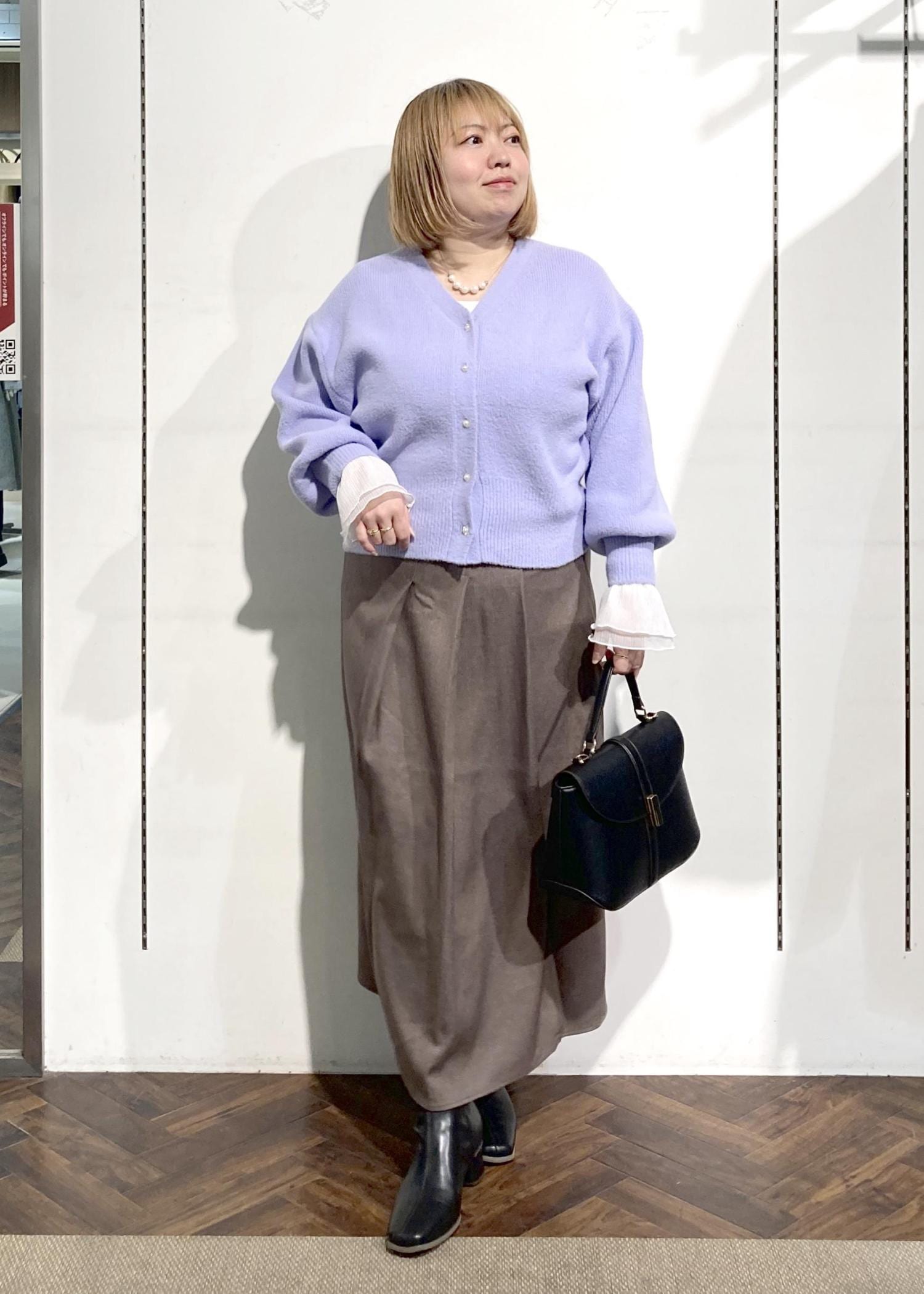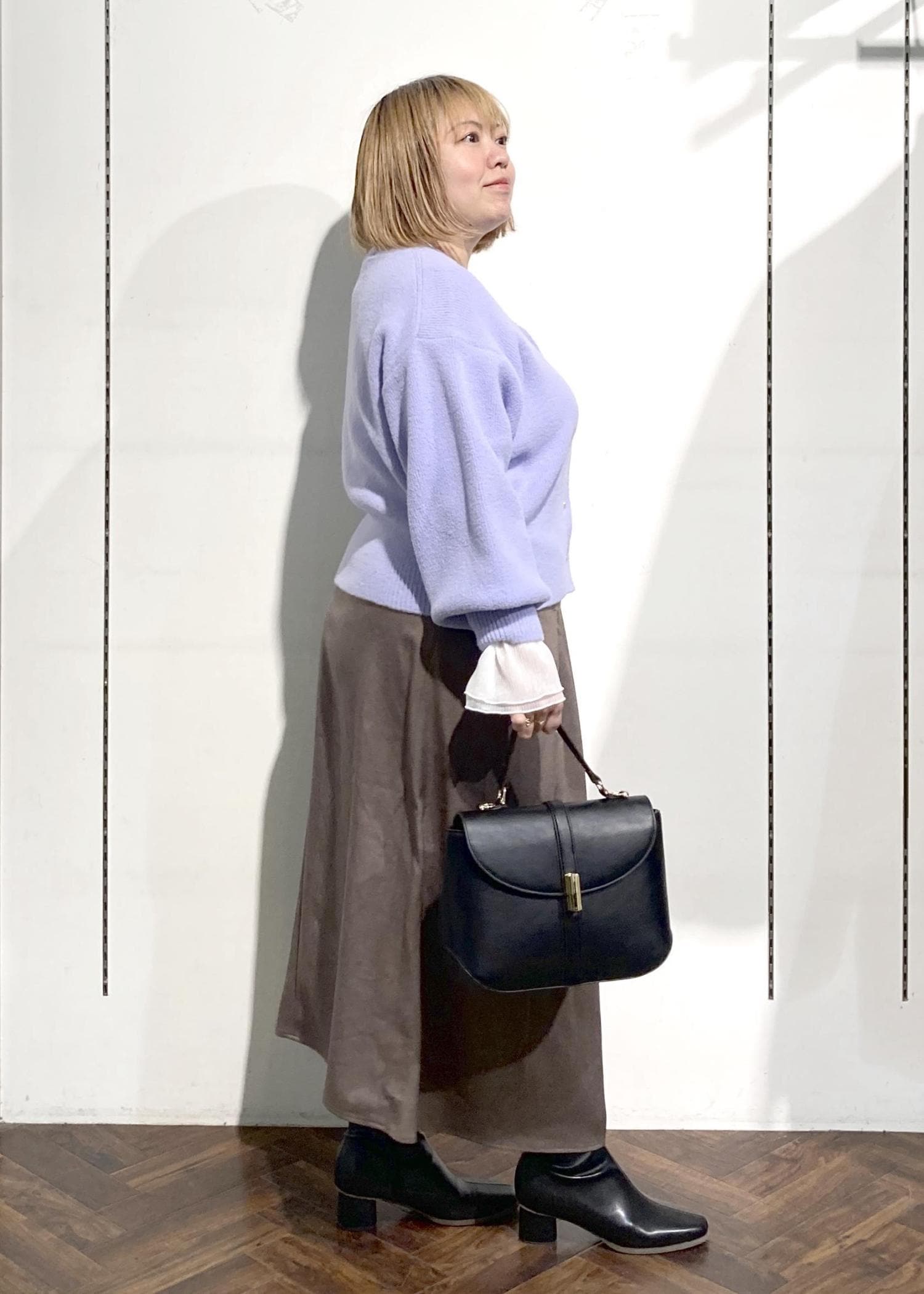 ラベンダーカラーが着映えするカーディガンのコーデです。