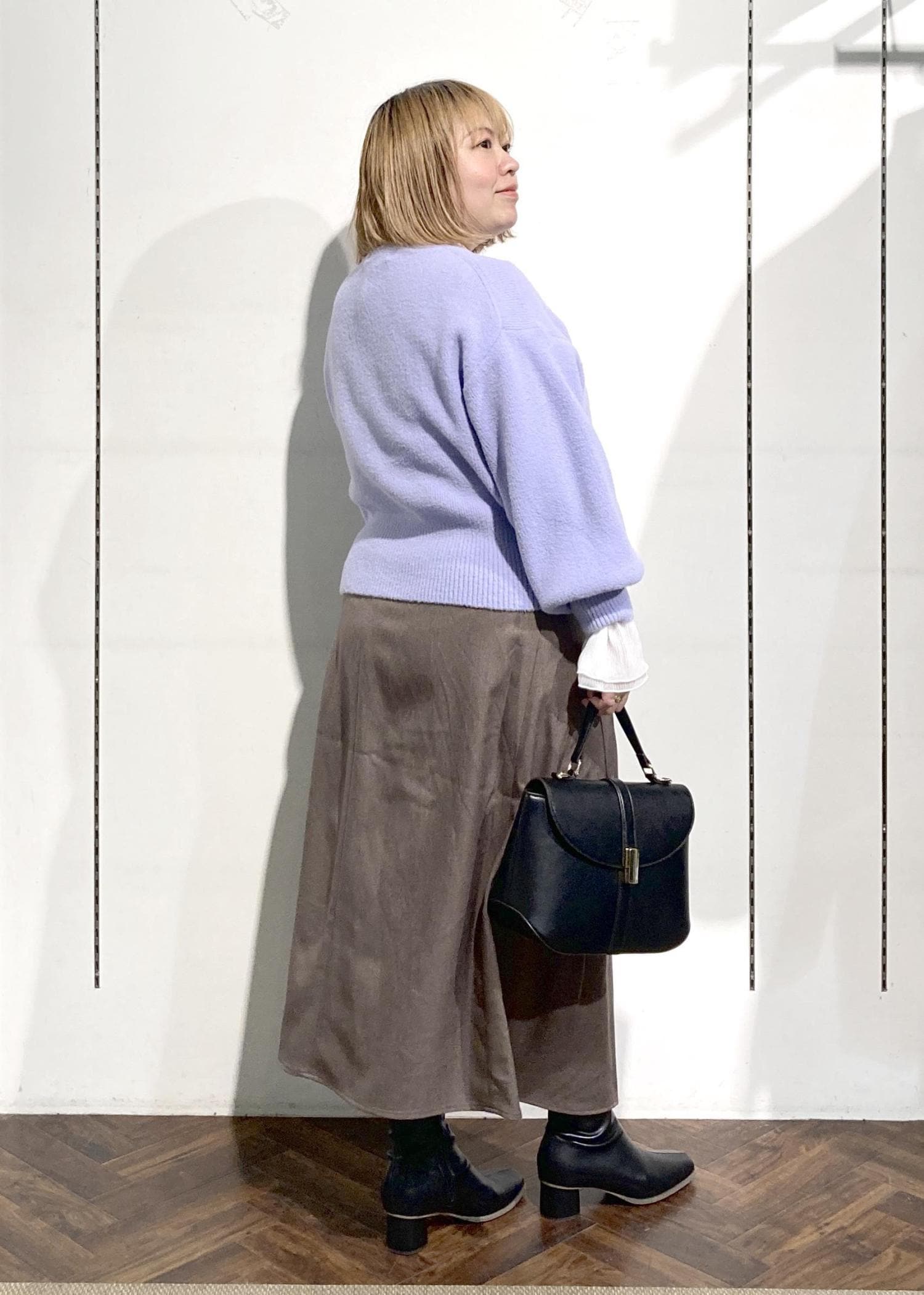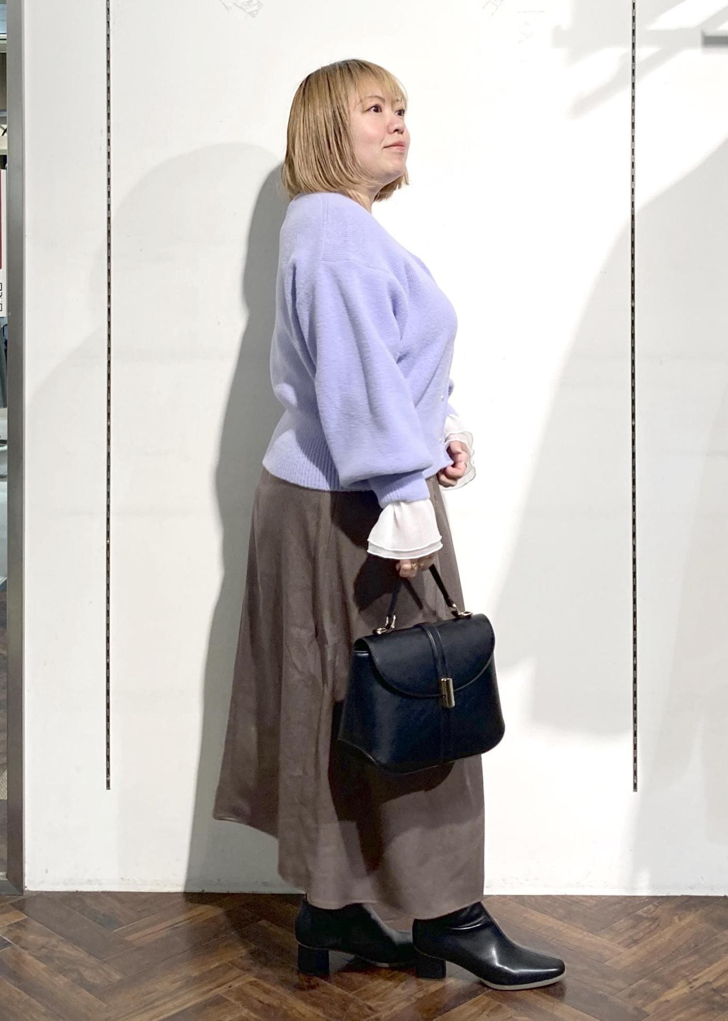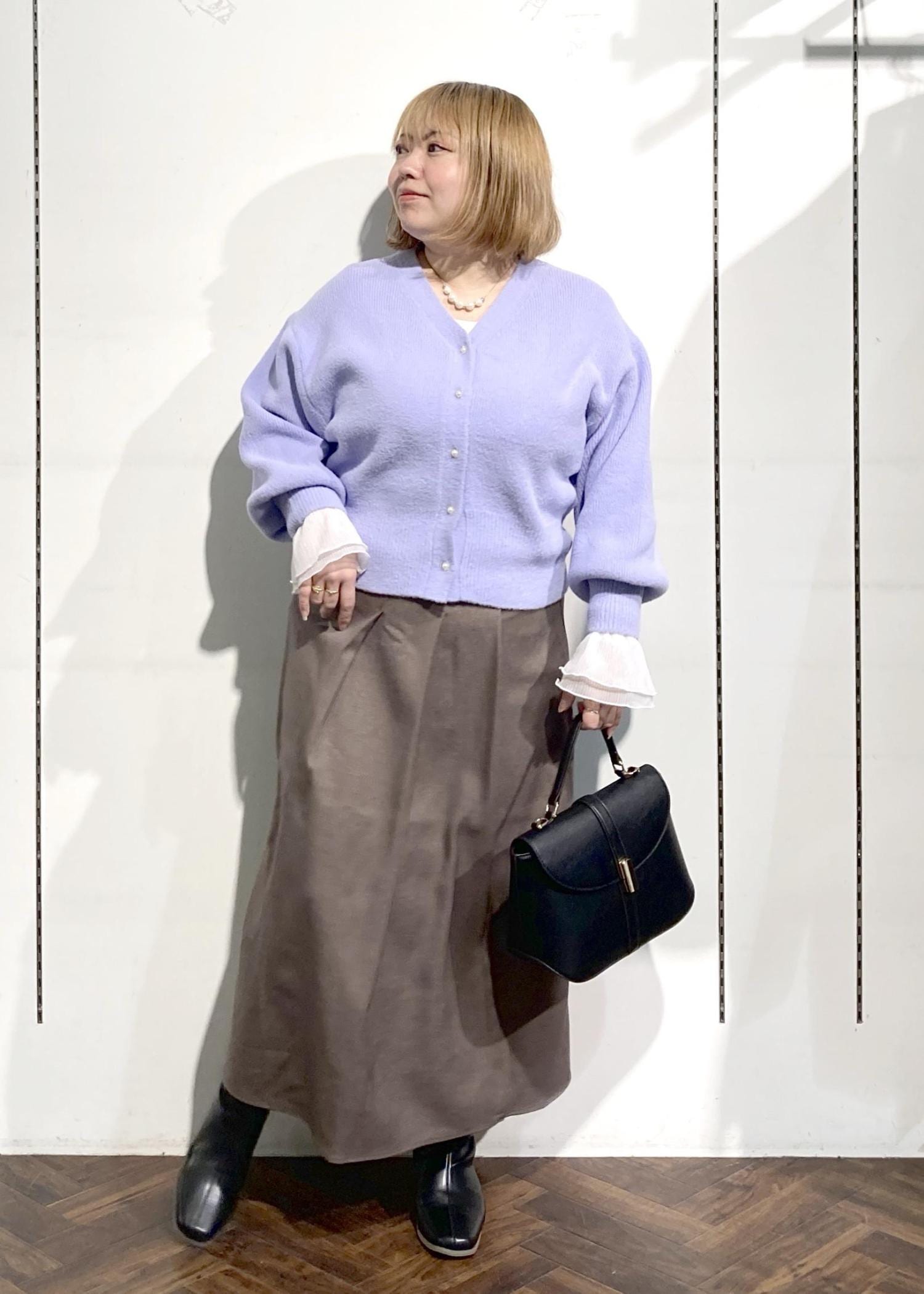 ラベンダーカラーが着映えするカーディガンのコーデです。