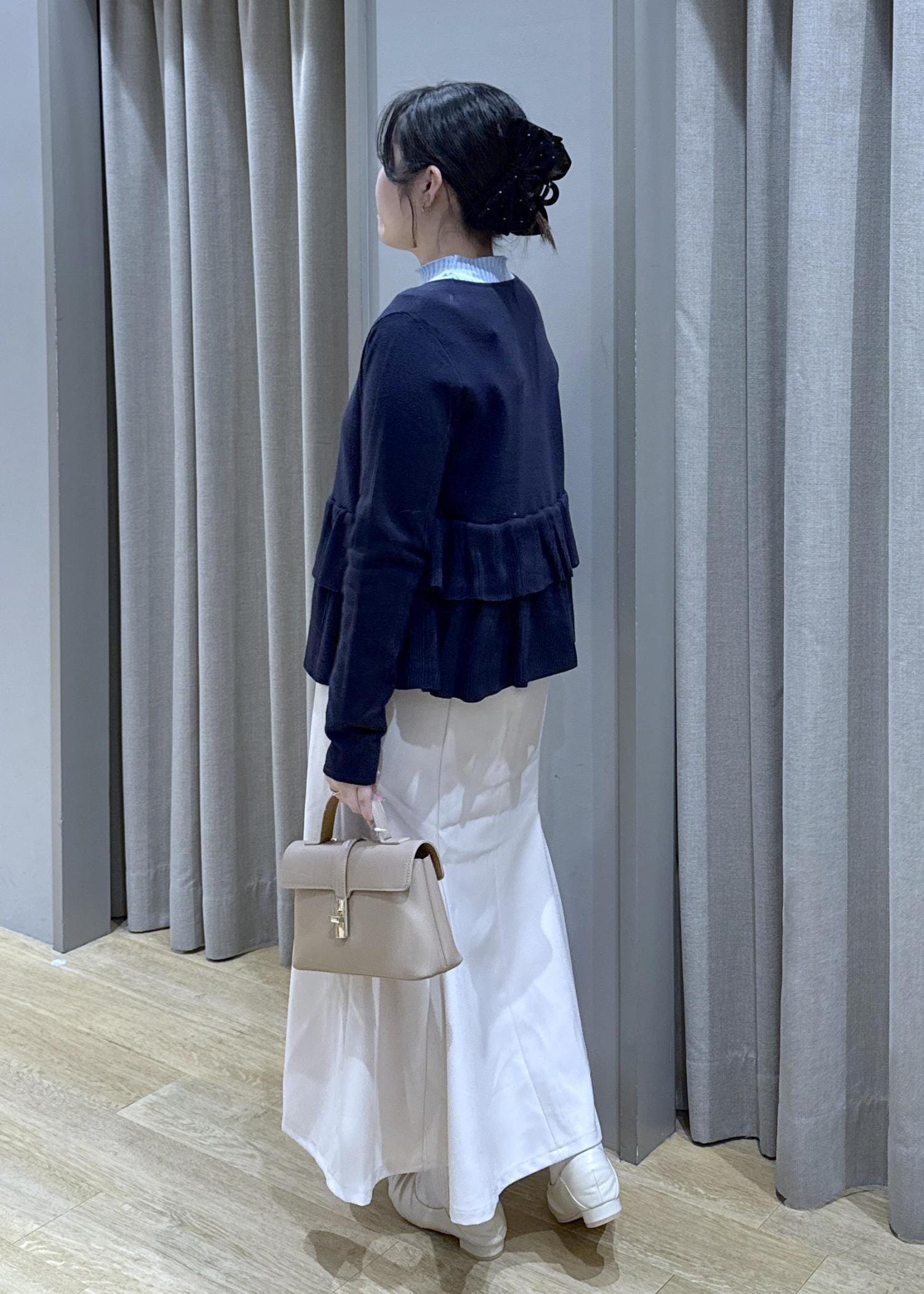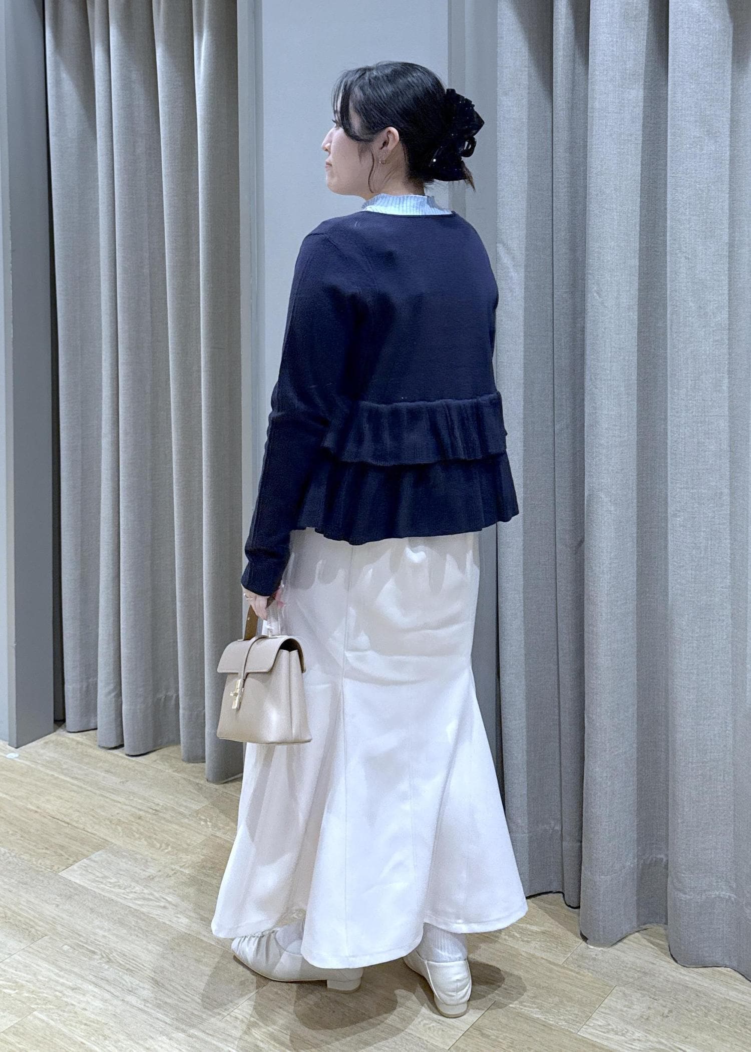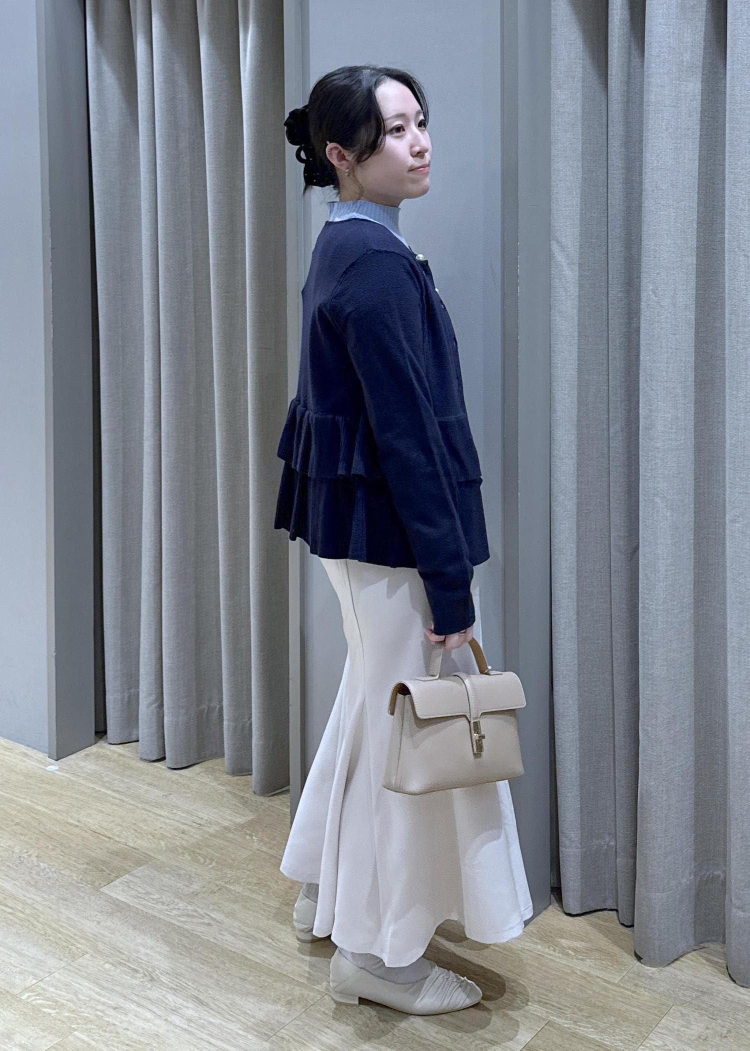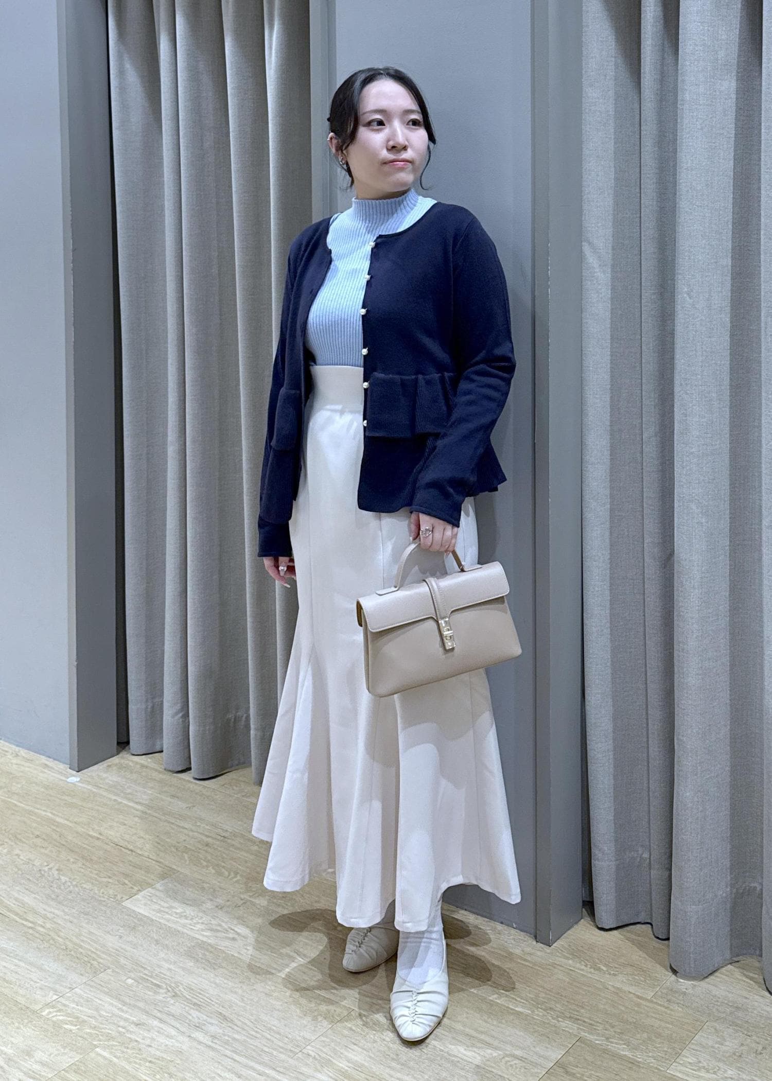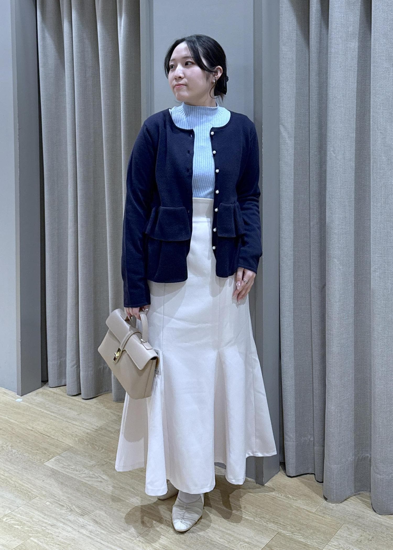 ペプラムカーディガンを前開きにして、マーメイドスカートと合わせて上品なコーデにしました。