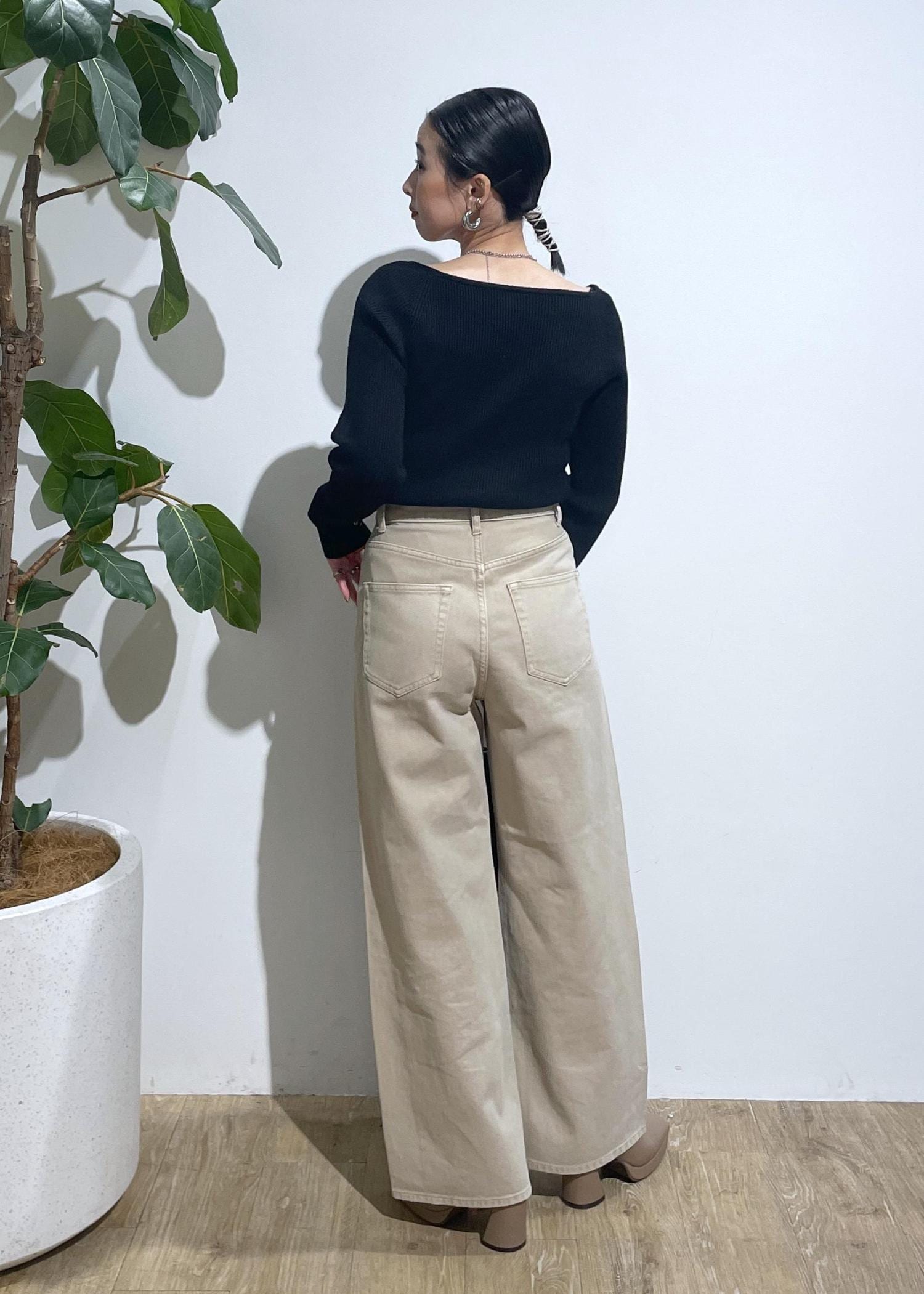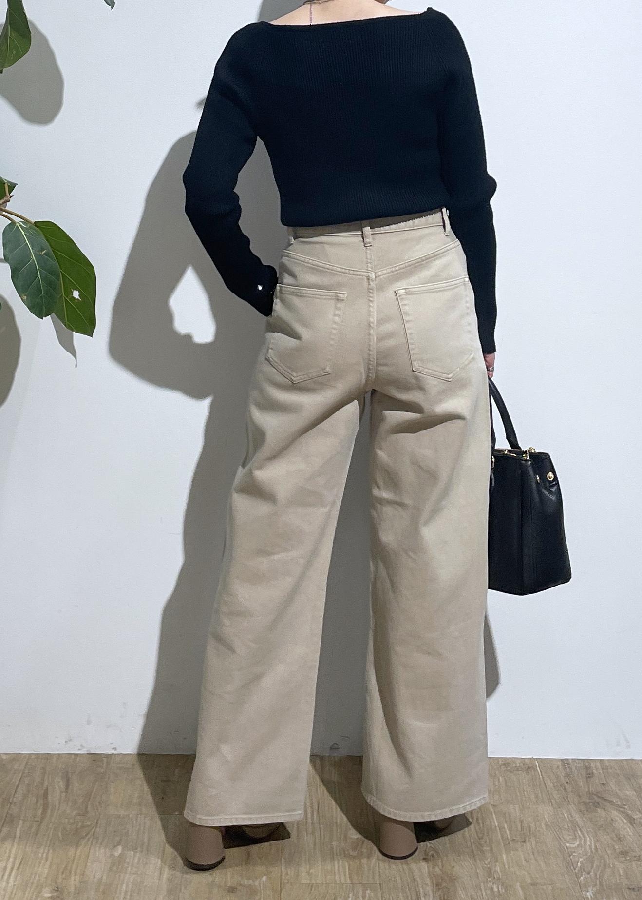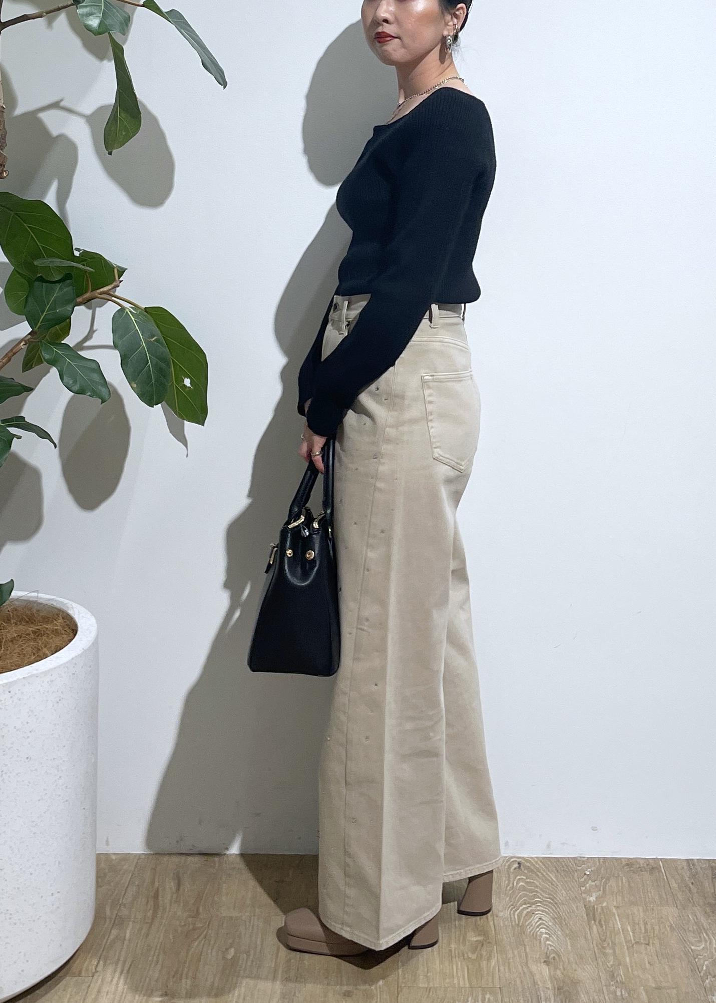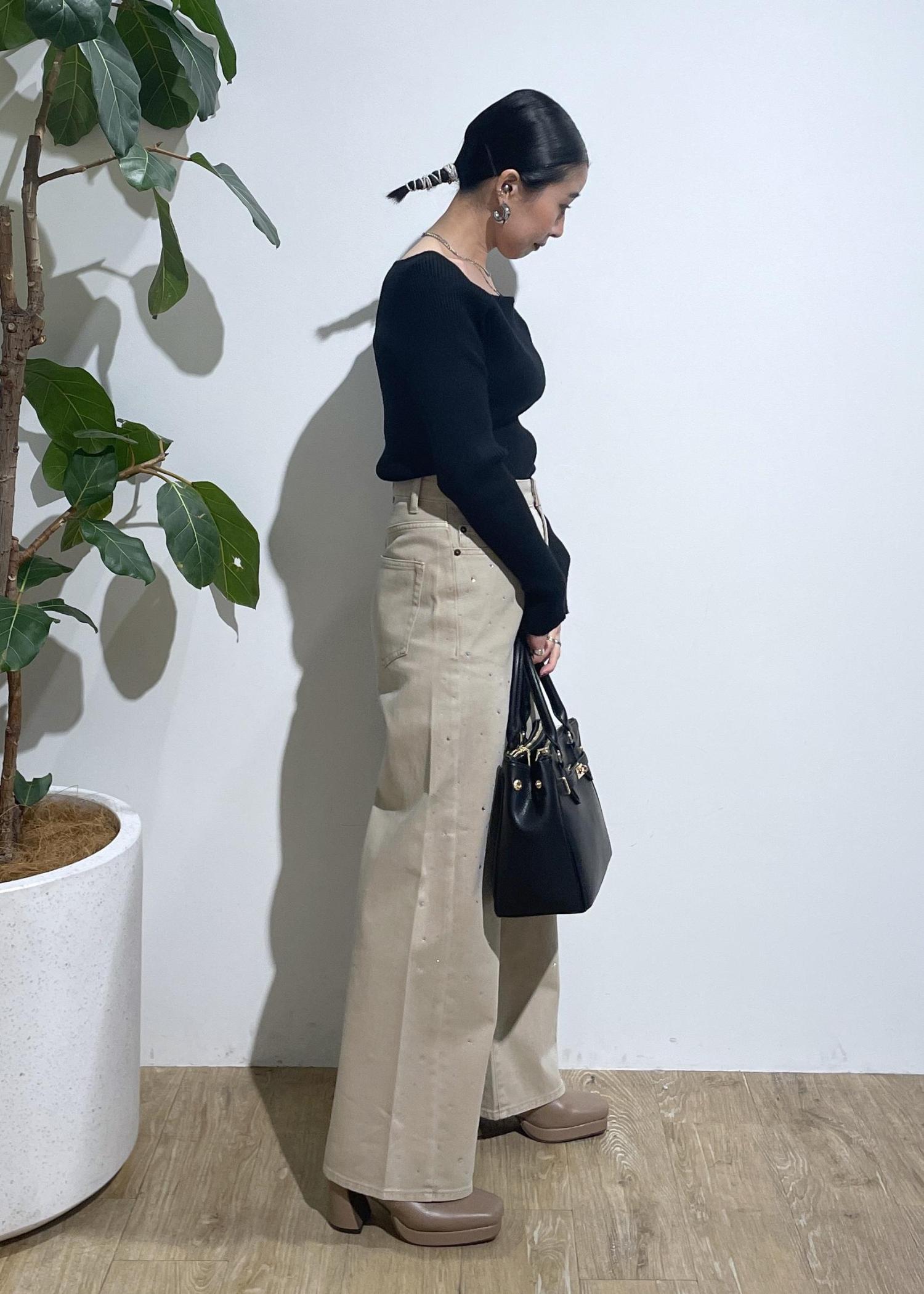 ベージュのデニムもキラキラがついている分、カジュアル過ぎない大人カジュアルです。