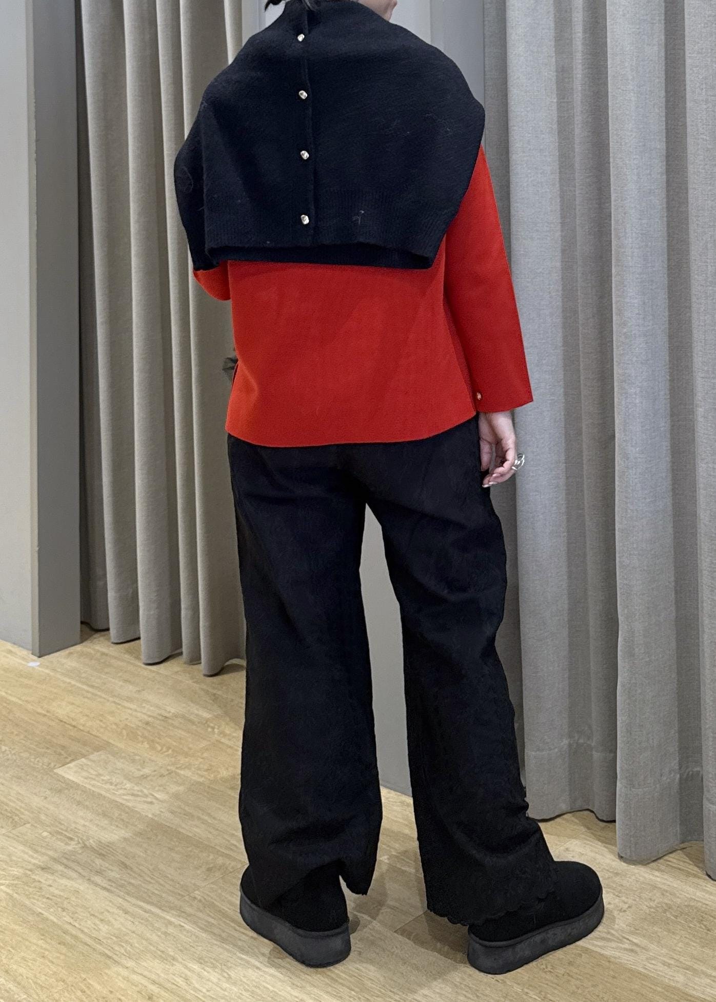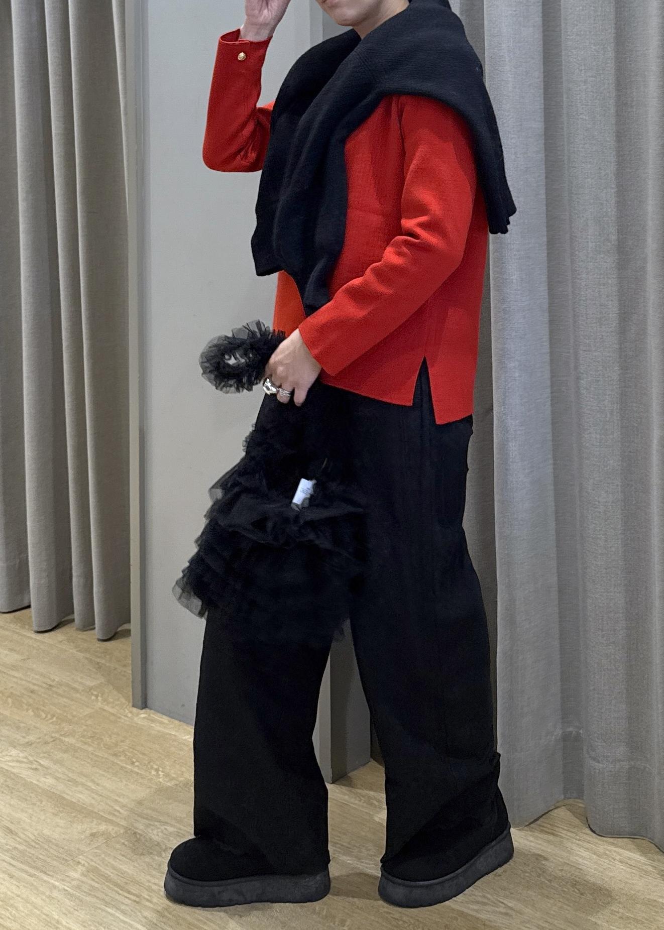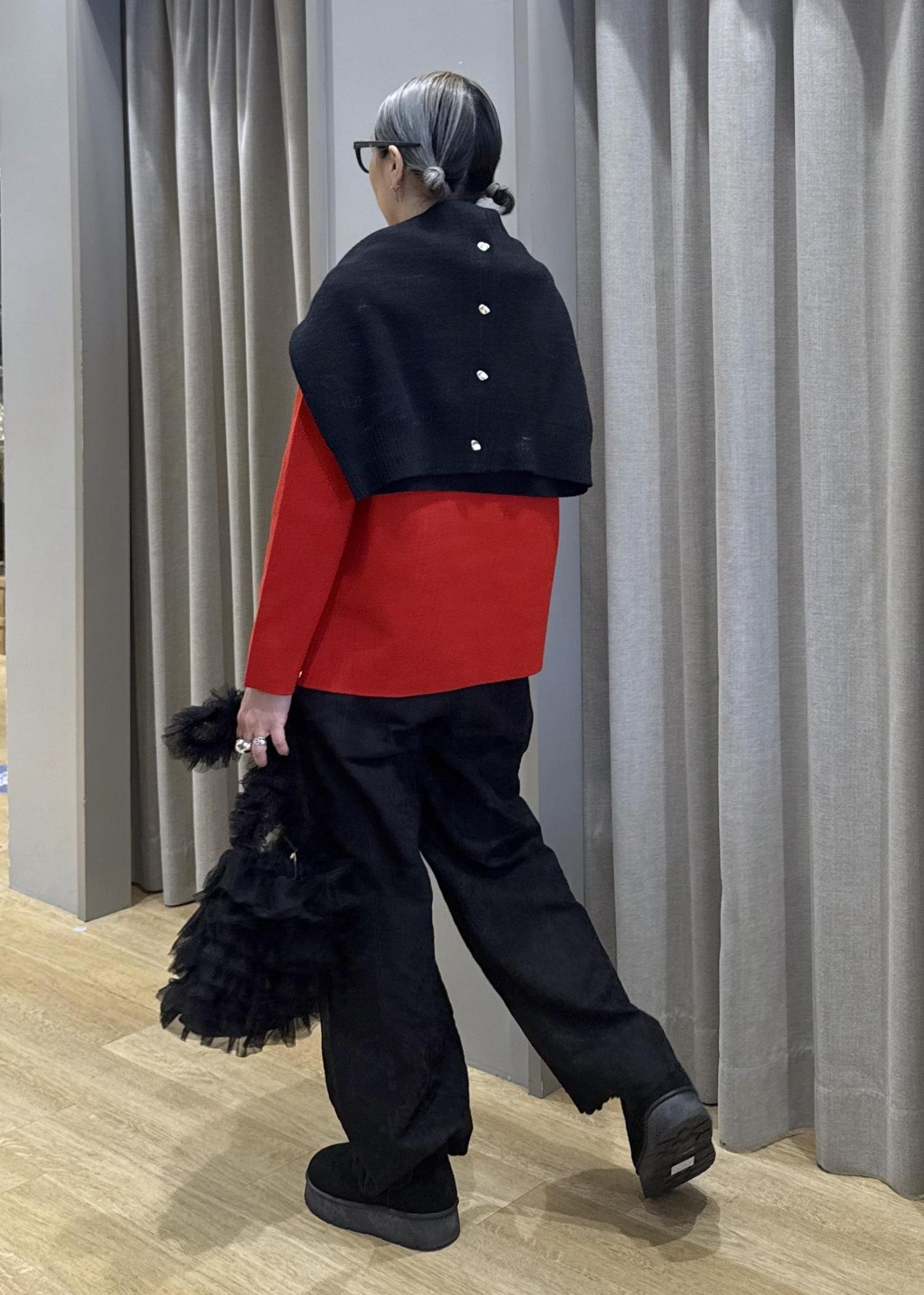 他はブラックで統一させ、赤と相性のいい金ボタンを