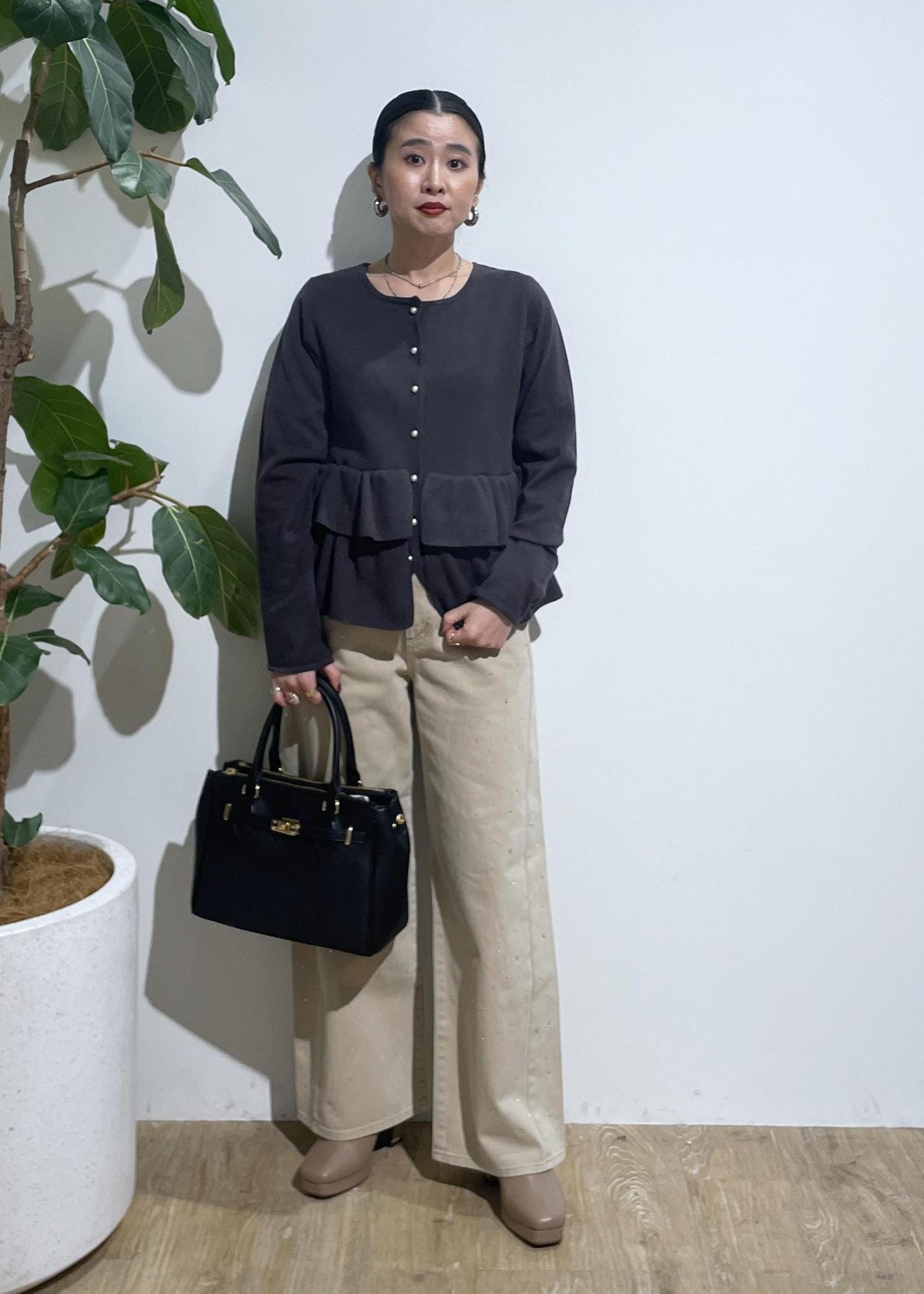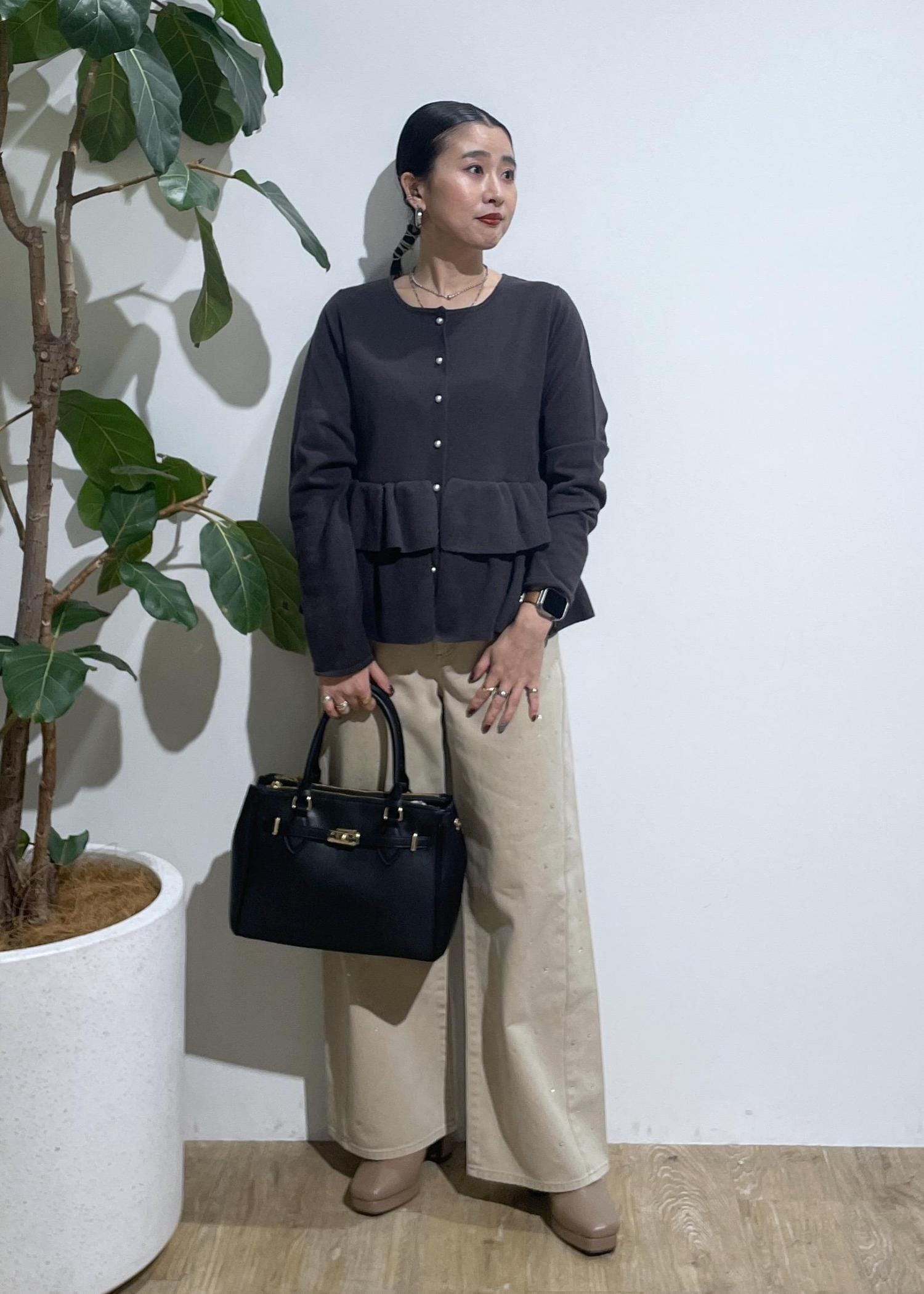 ボリュームのあるカーディガンにシンプルデニムでバランスをとりました!ボリューム好きな方には、おすすめしたいカーディガンです。パールのボタンもアクセントに!