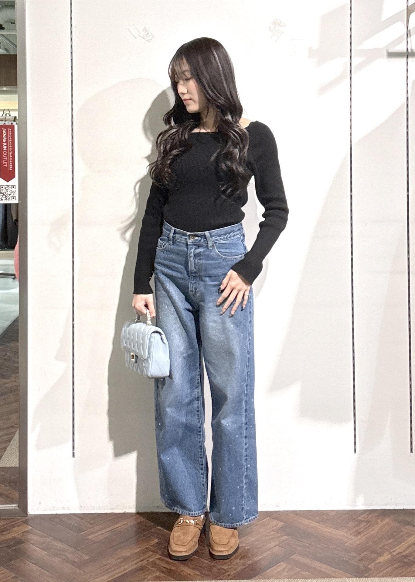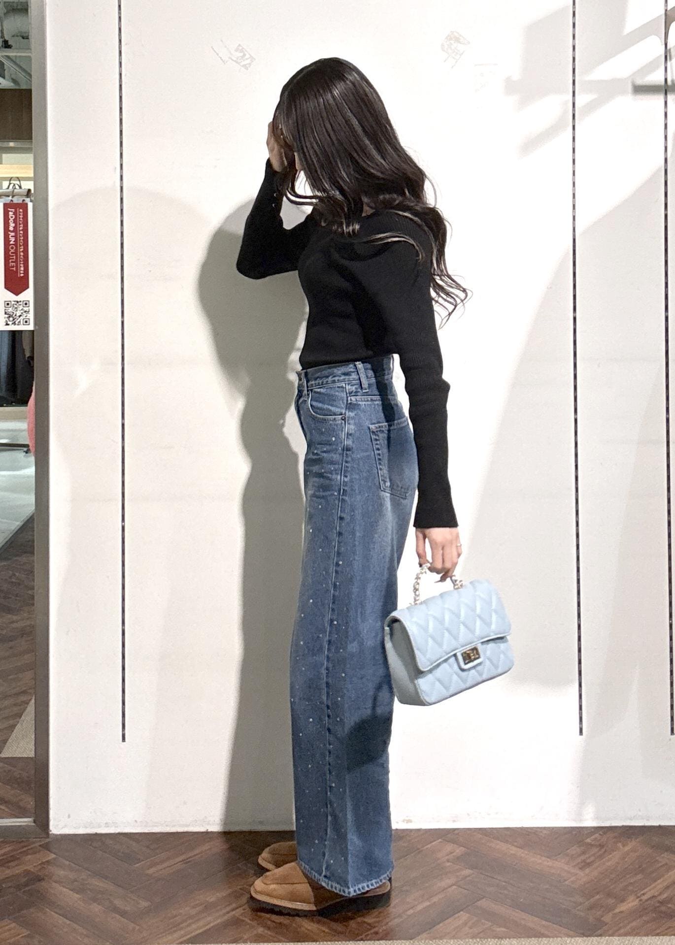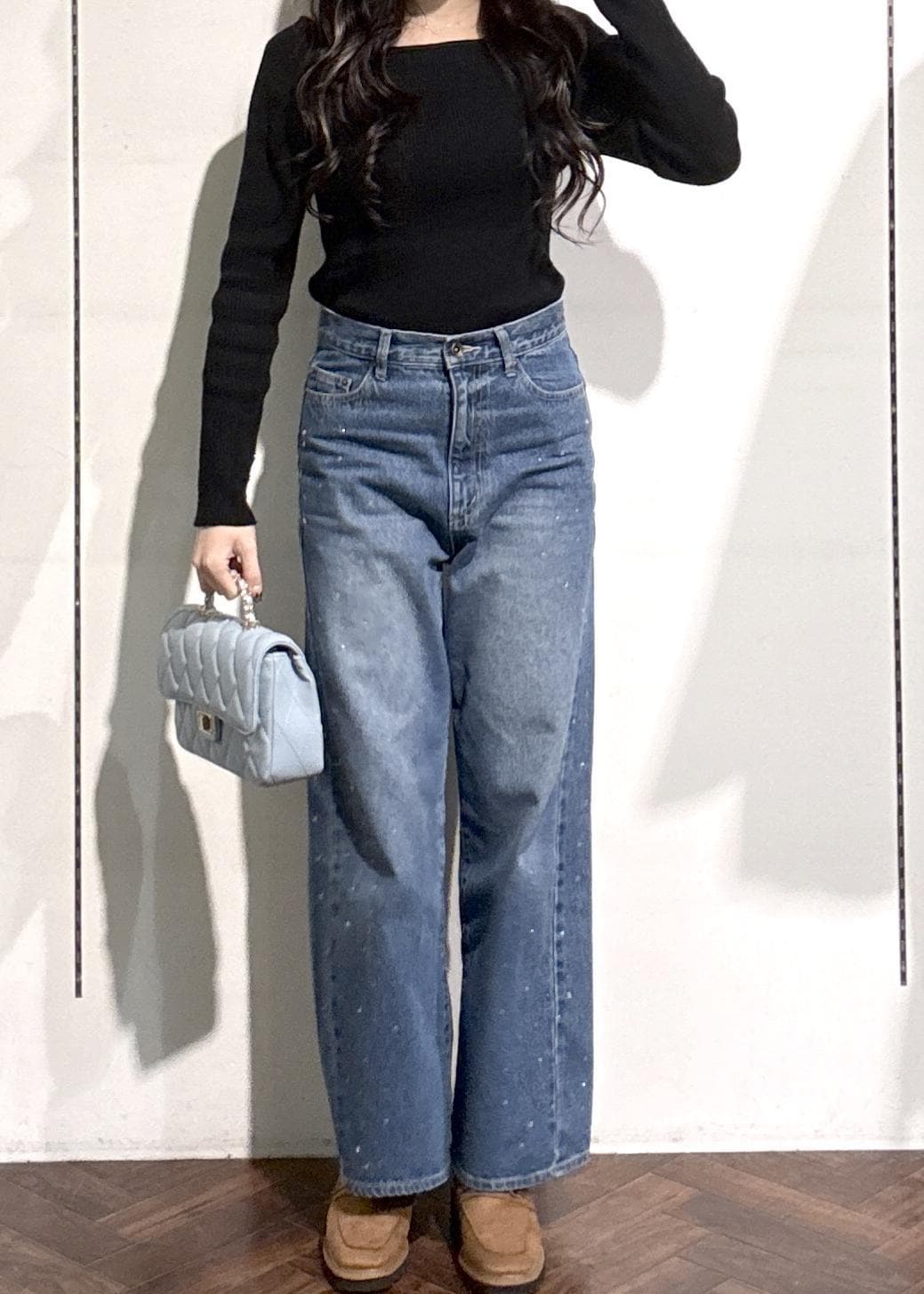 シンプルなコーデでもデコルテが綺麗に見えるトップスとデニムでもキラキラが付いたデニムなのでシンプル過ぎず、おしゃれに見えスタイルアップしますッ!( ◠‿◠ )