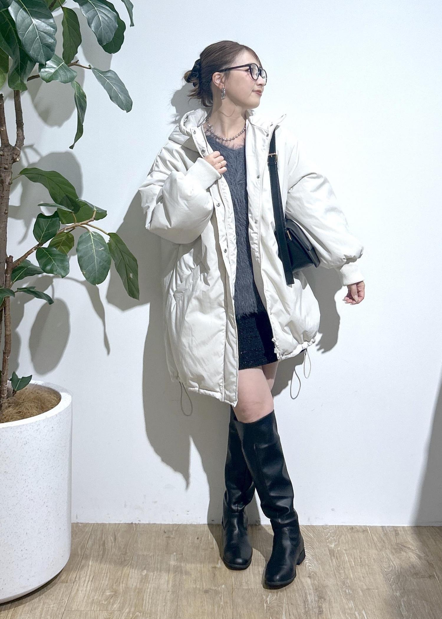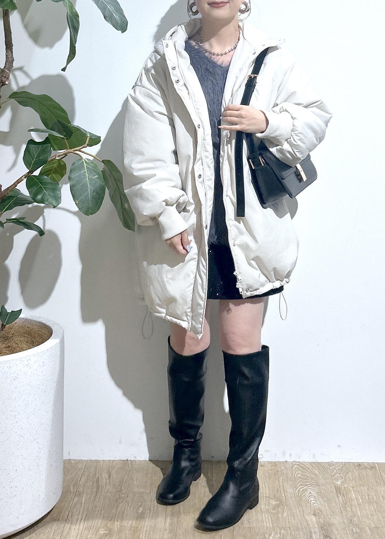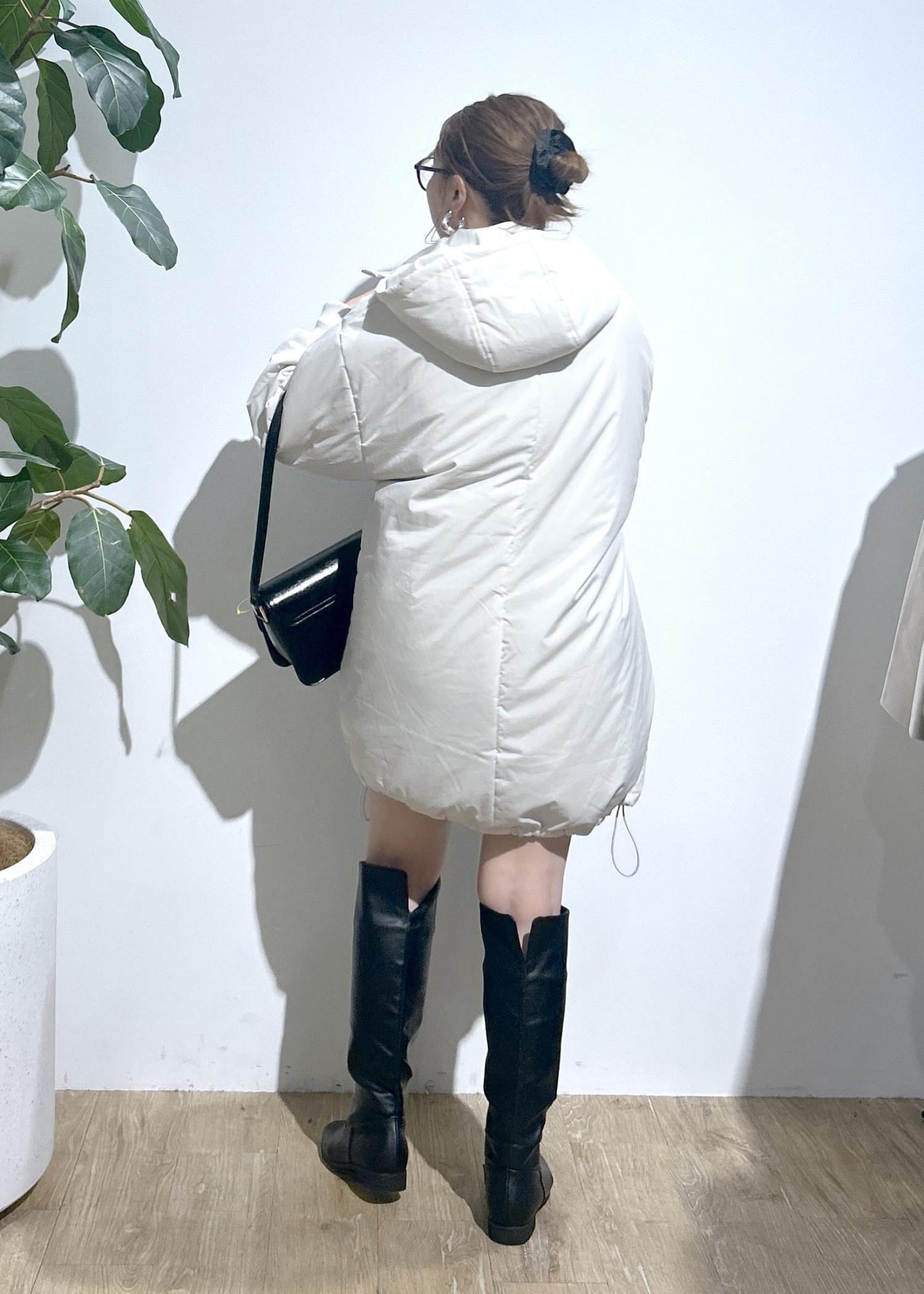 着丈長めで太もも下(膝上丈)中綿でふわふわと軽く温かいです。裾にドロストがついているので、キュッと絞ると風を通しにくく暖かいです。