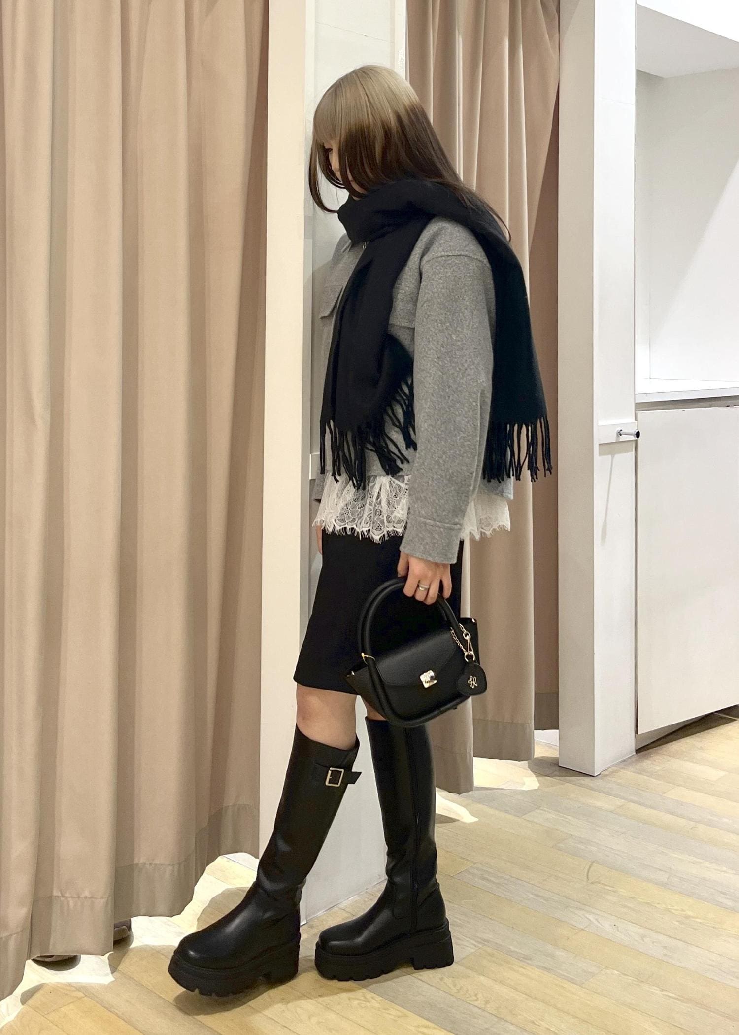 小物をブラックで統一して、まとまりのあるコーデを意識しました!