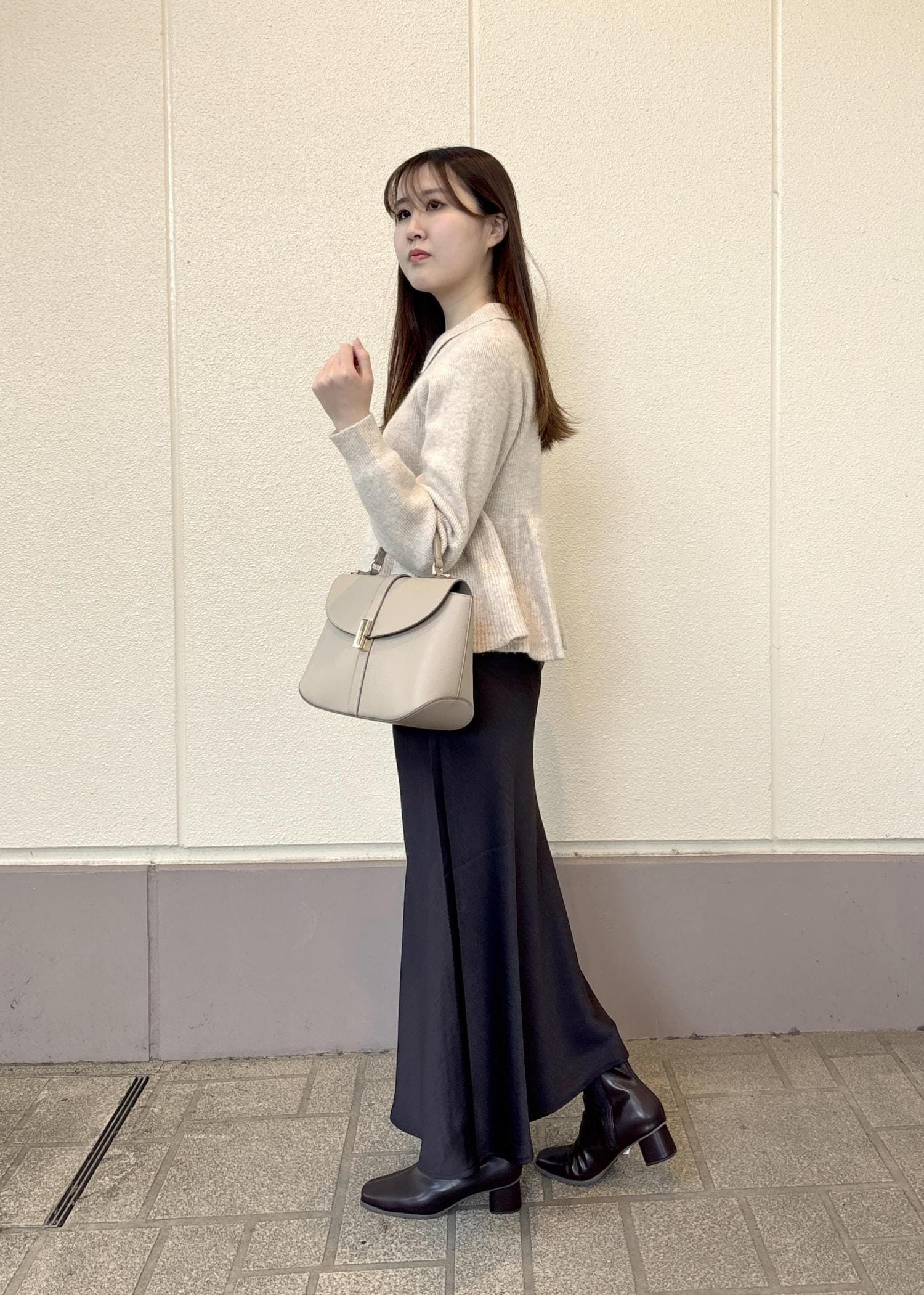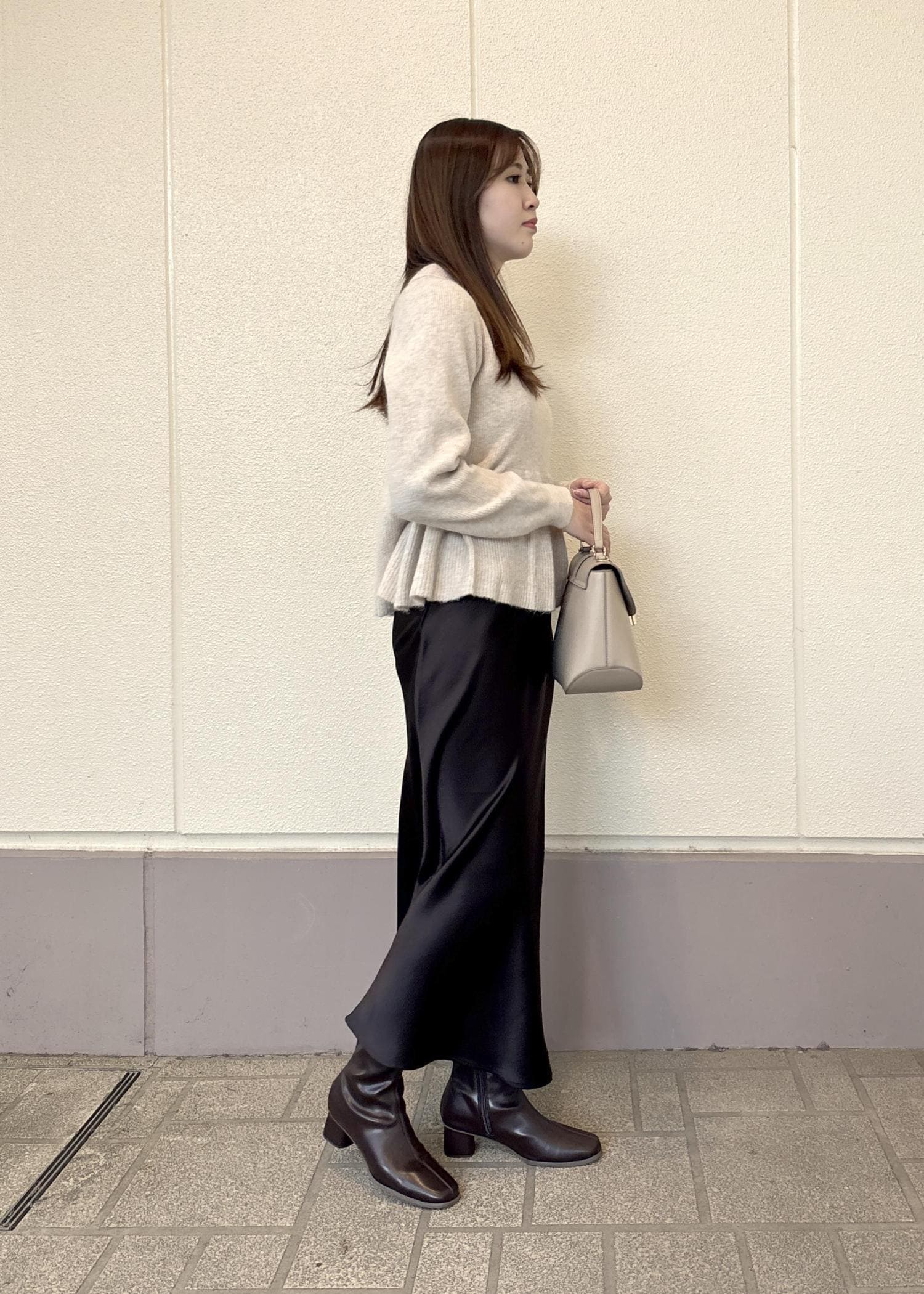 アンゴラ混のニットはとても軽く、肌なじみのいいベージュ色です。サテン生地のスカートを合わせ少し上品なコーデにしてみました!