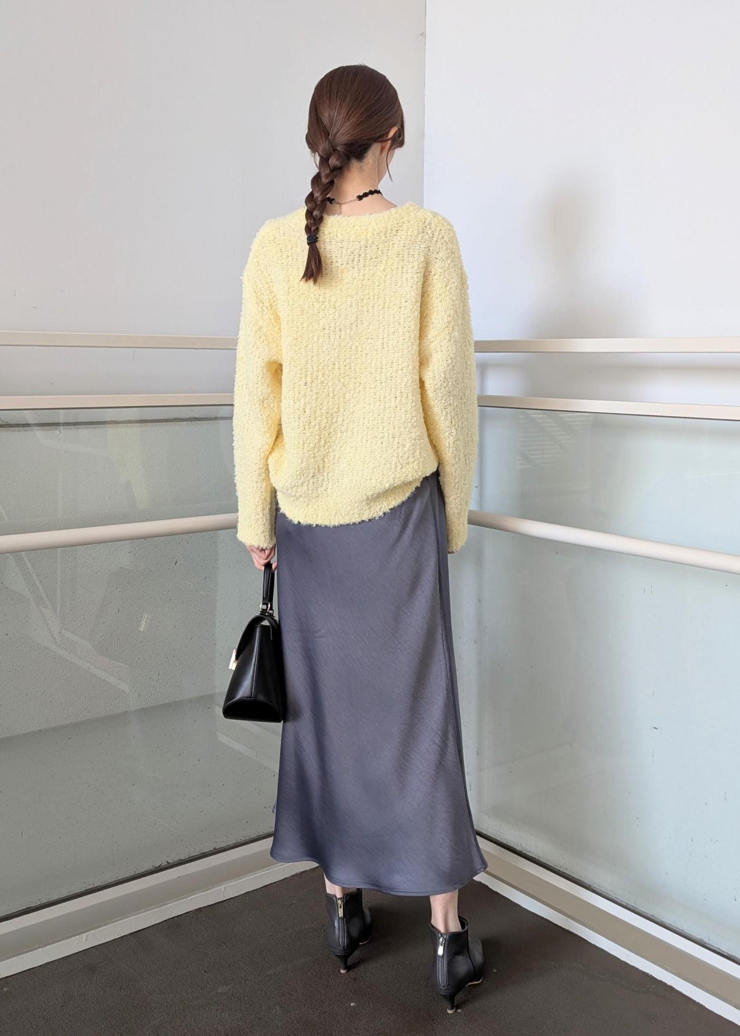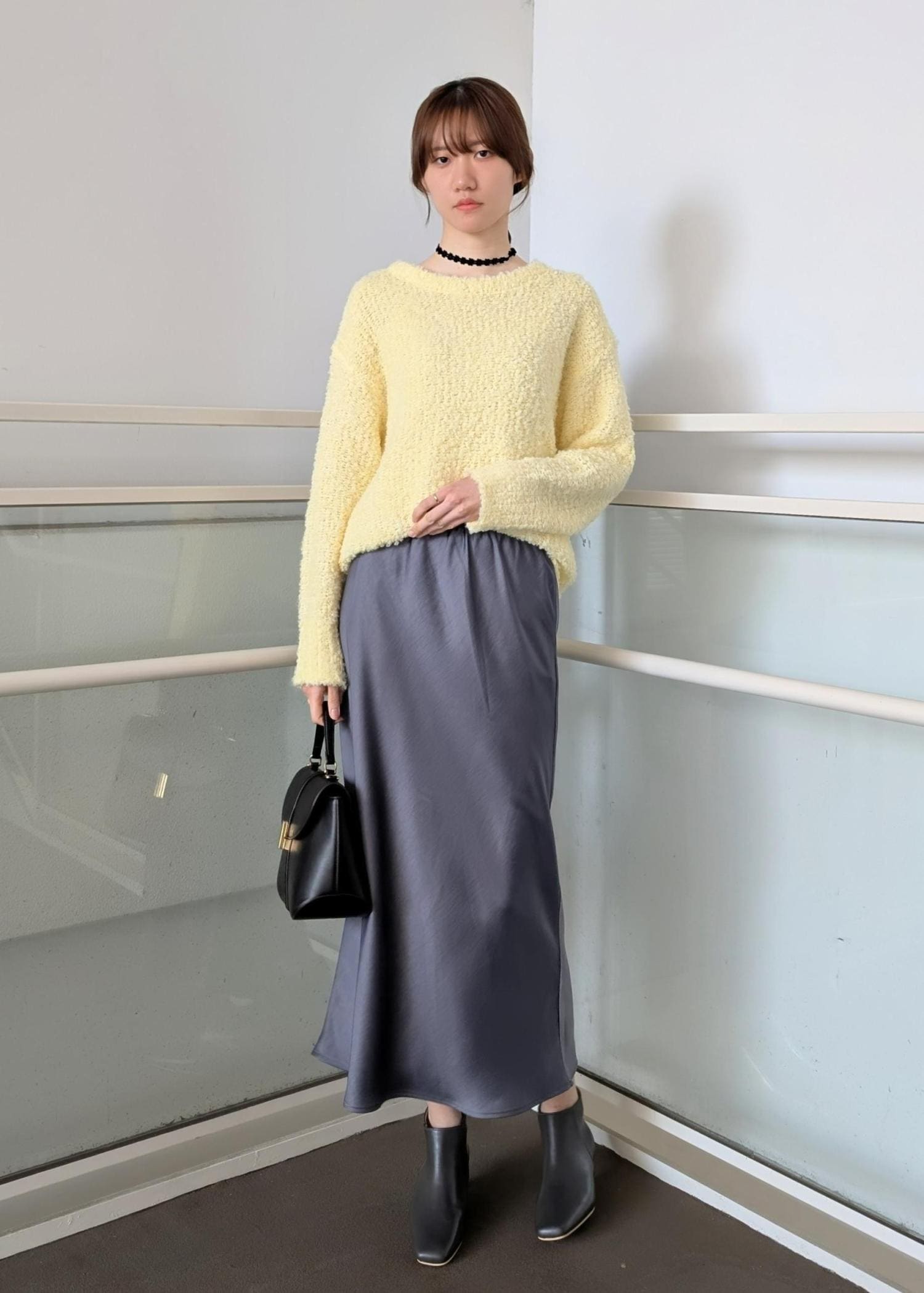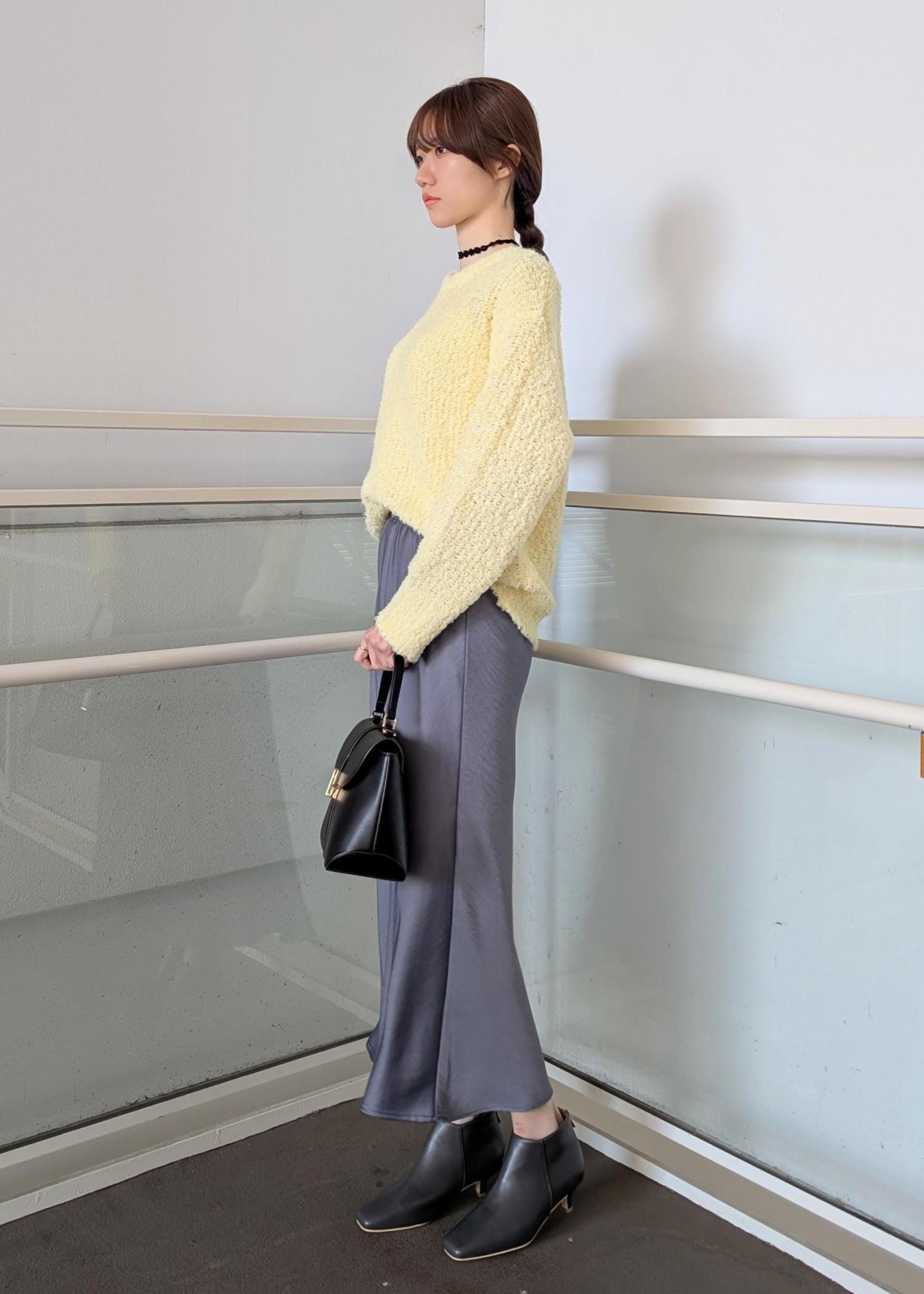 カラーで春を先取りしたコーディネートです。モコモコしたニットでも明るめカラーにしたり軽やかな素材のボトムスと合わせることで印象を変えることができます。