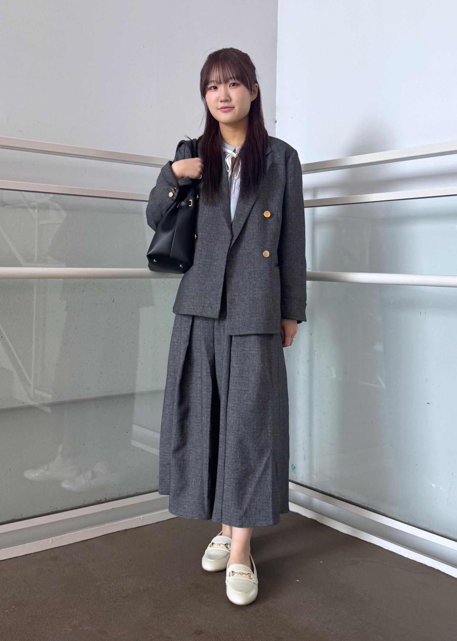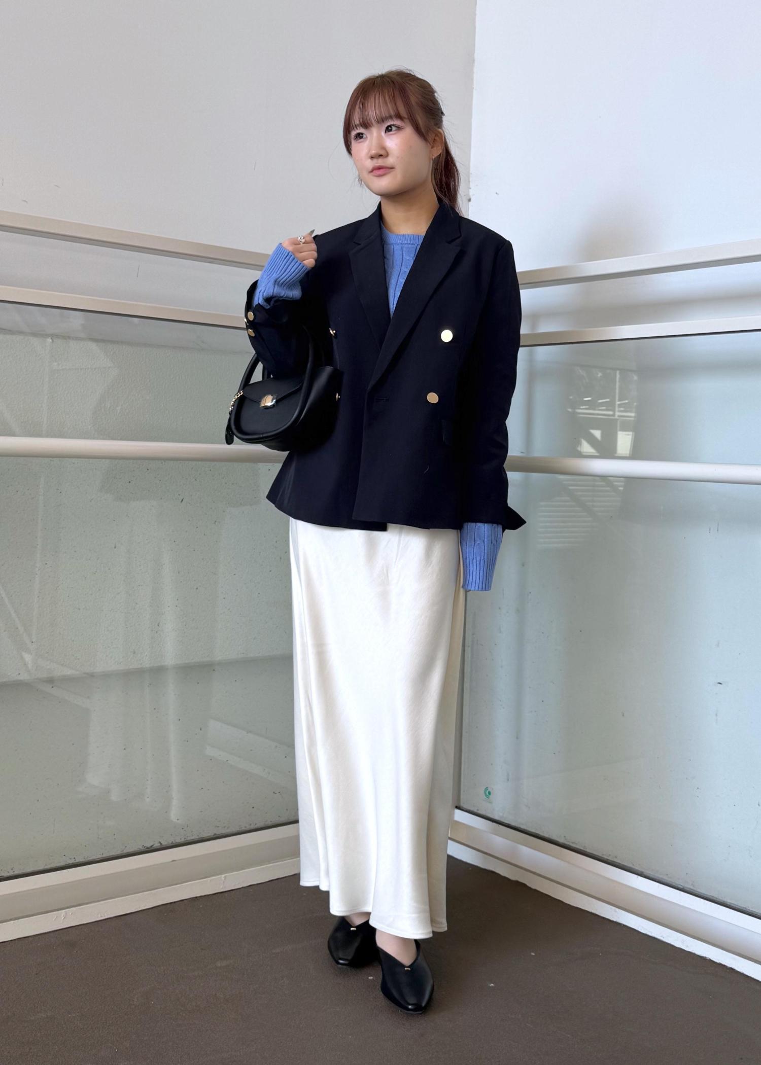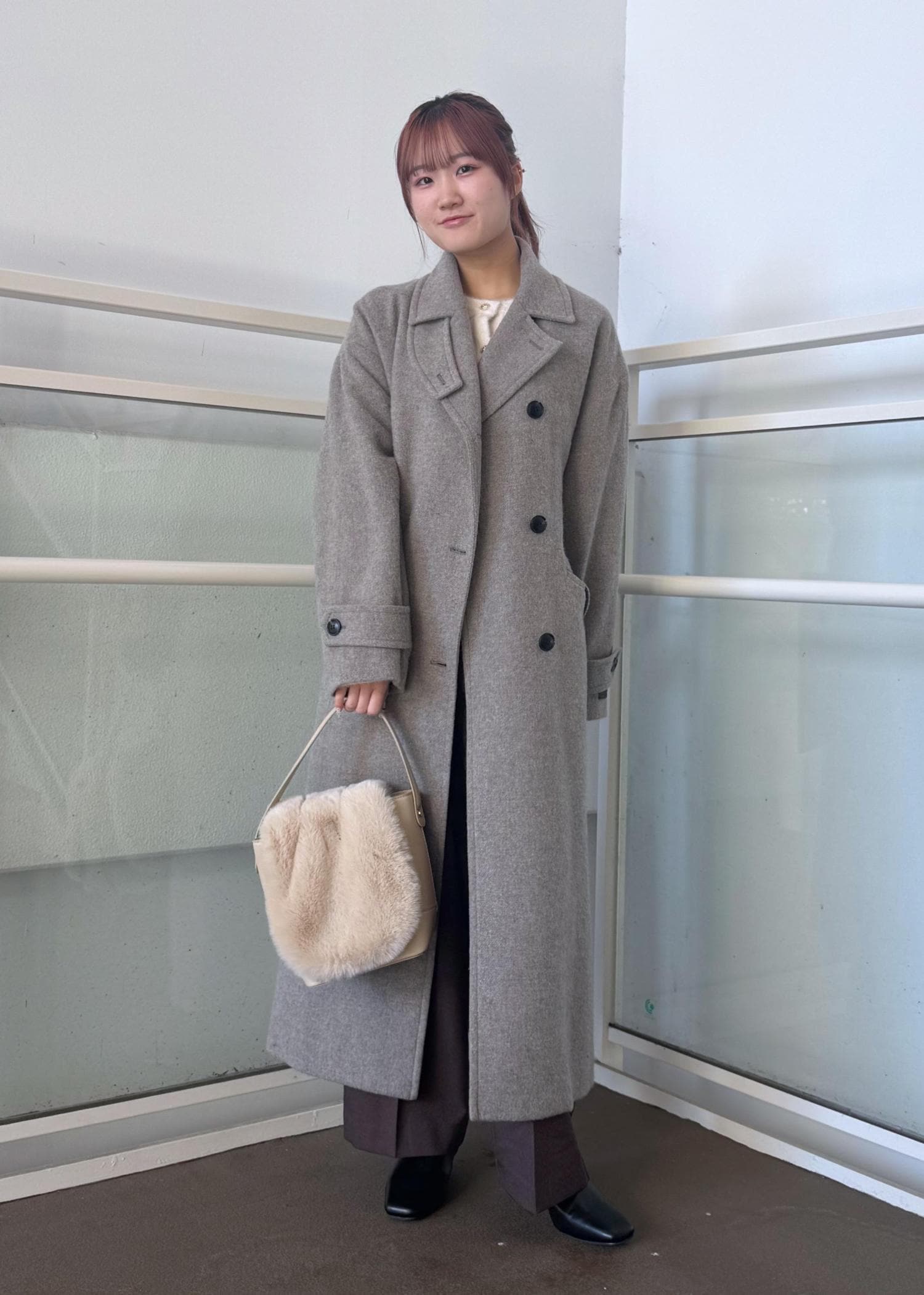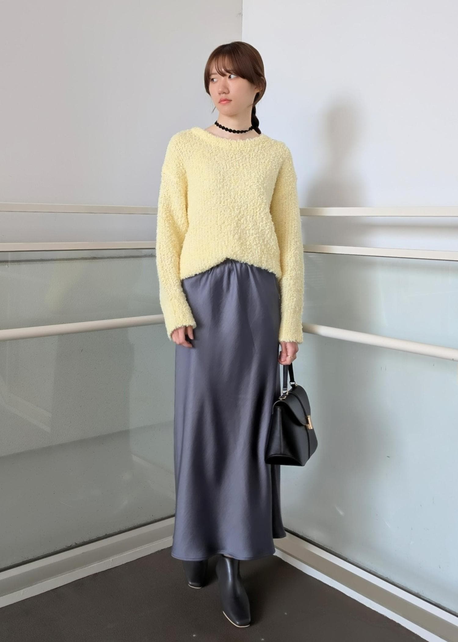 カラーで春を先取りしたコーディネートです。モコモコしたニットでも明るめカラーにしたり軽やかな素材のボトムスと合わせることで印象を変えることができます。