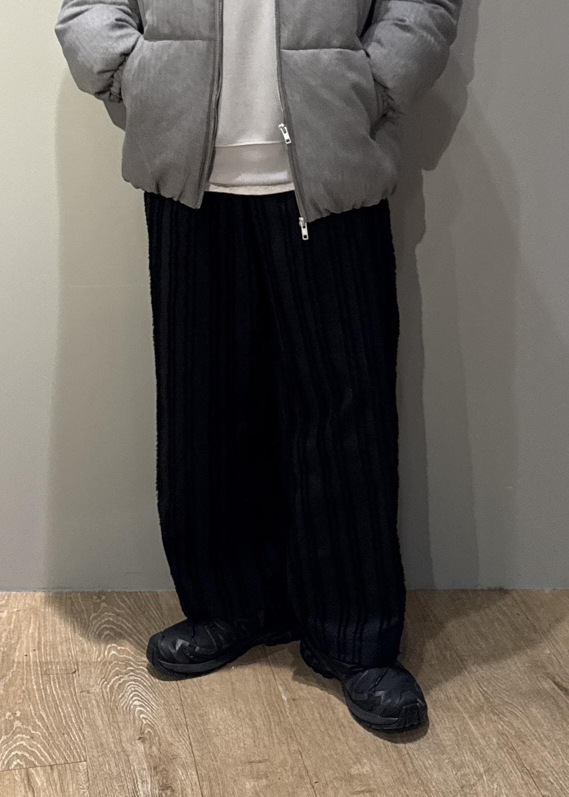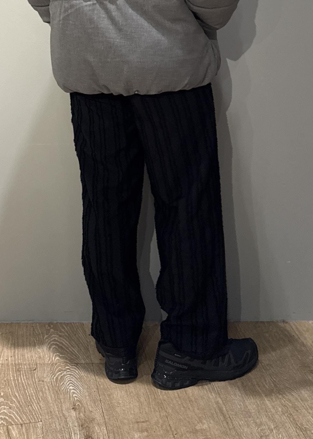 アウトレットJUNRED【セットアップ対応】テクスチャードファブリックインタックワイドパンツブラック / M¥3,960レビューフェザー感のあるストライプにプラスして光沢のあるラメ糸を織り込んだ
