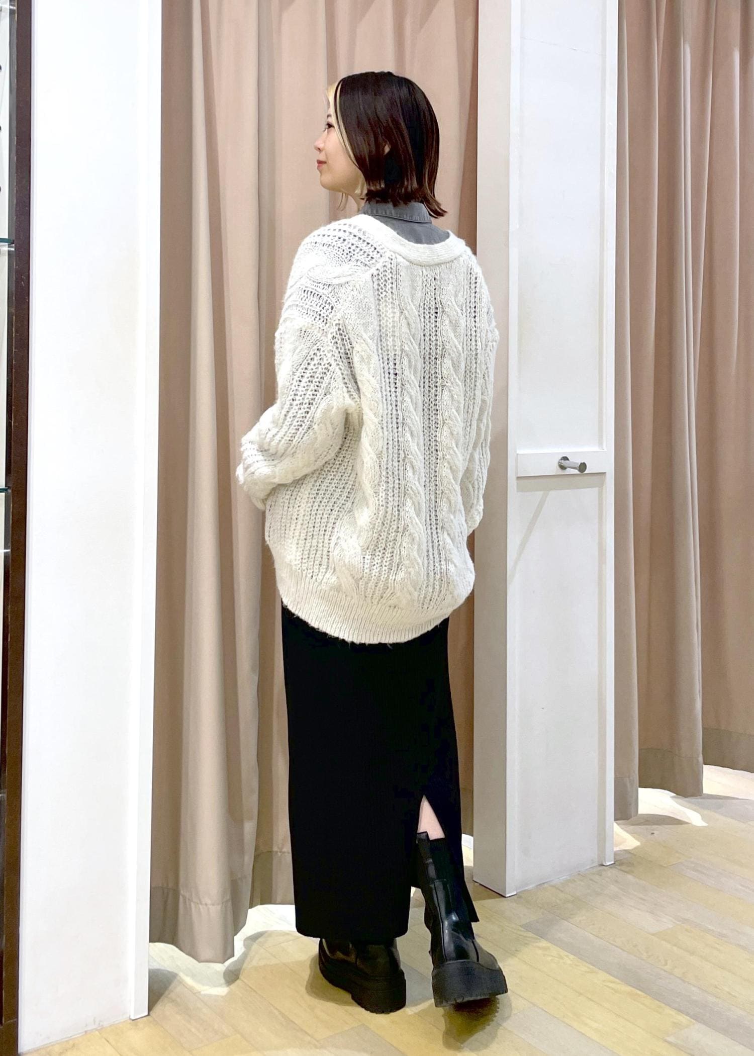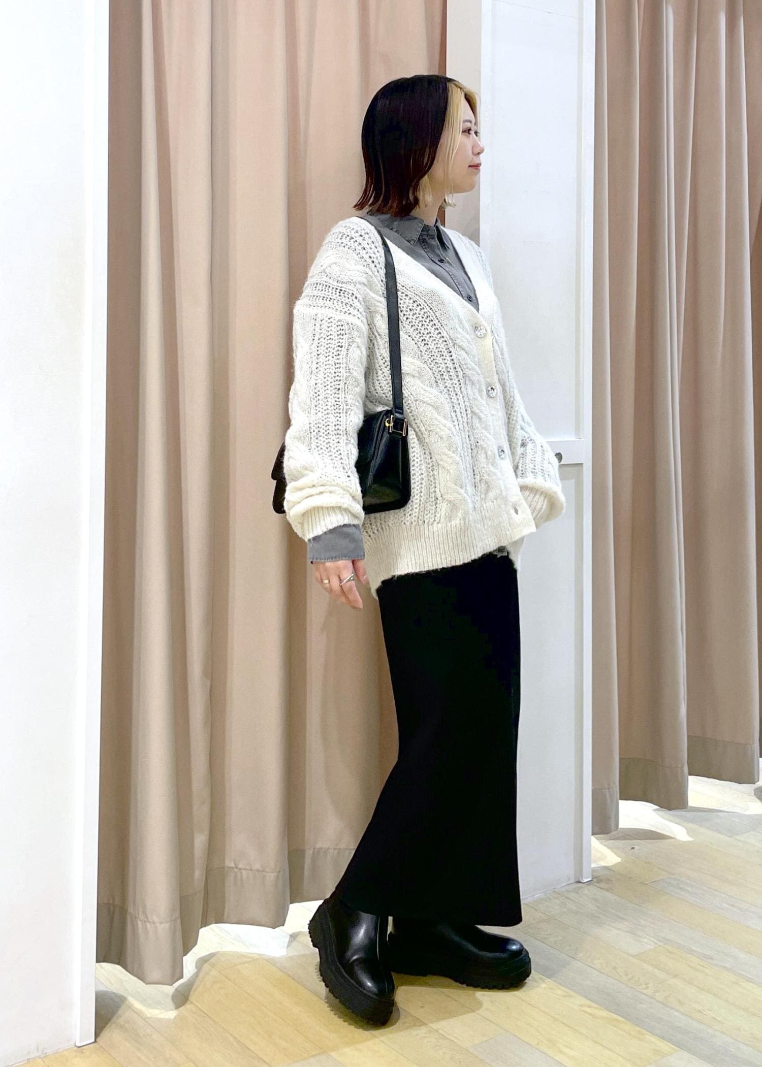 カラーはモノトーンで落ち着いた印象にし、カーディガン以外の1つ1つのアイテムはシンプルなもので統一しました。