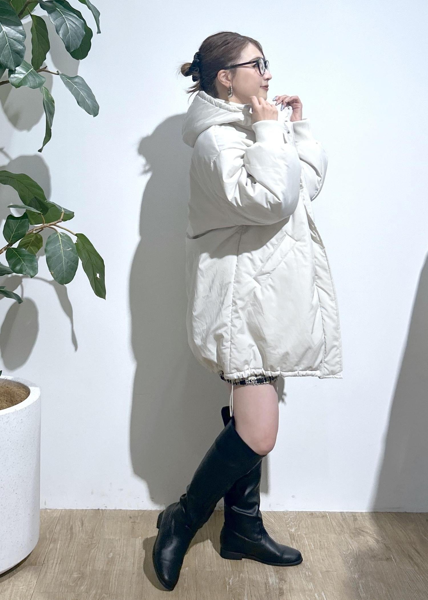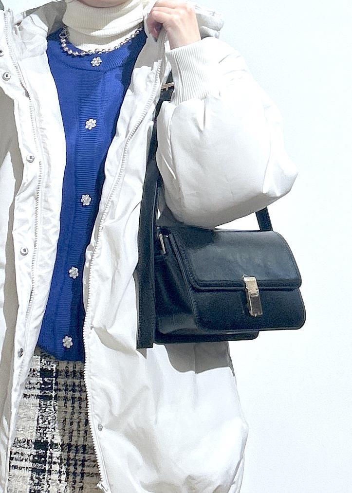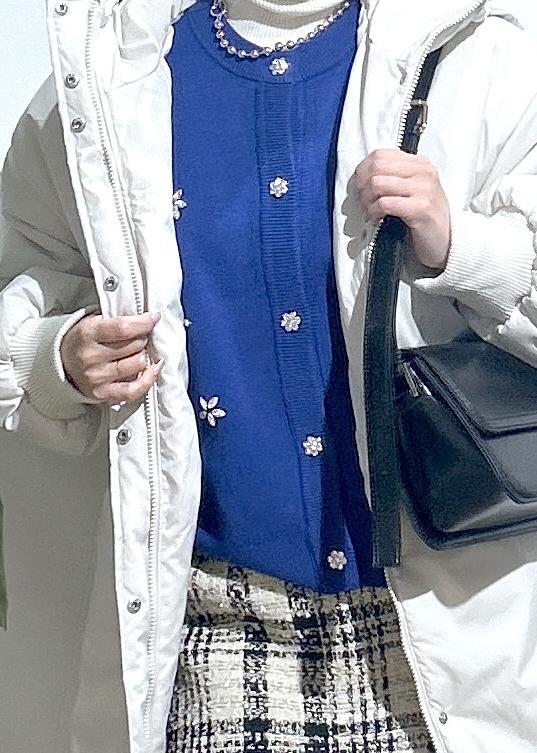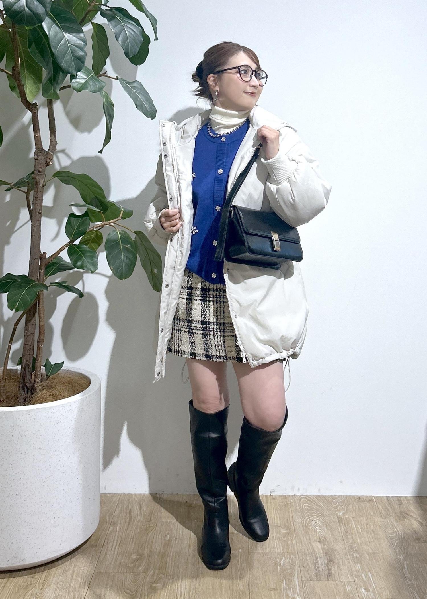 ヒップをスッポリ覆ってくれるモンスターコートのインナーには華やかビジューのカーディガンで注目度抜群です。