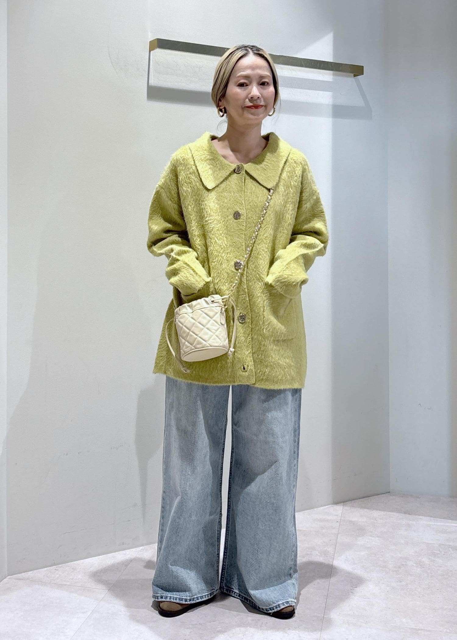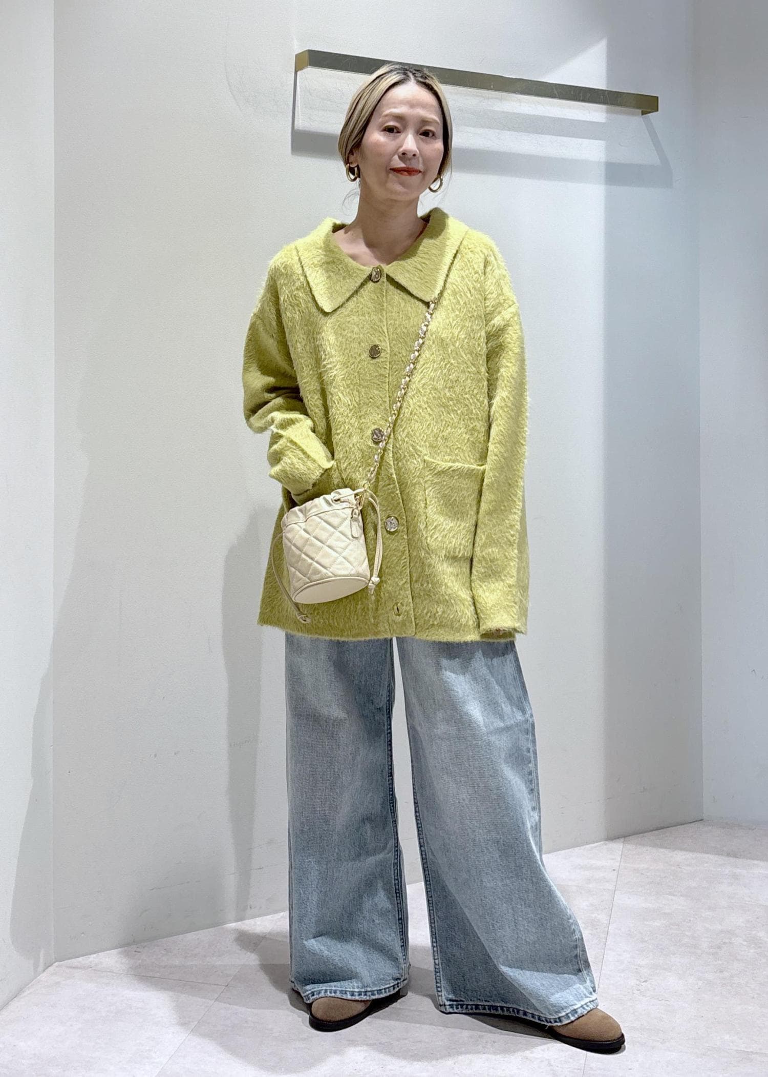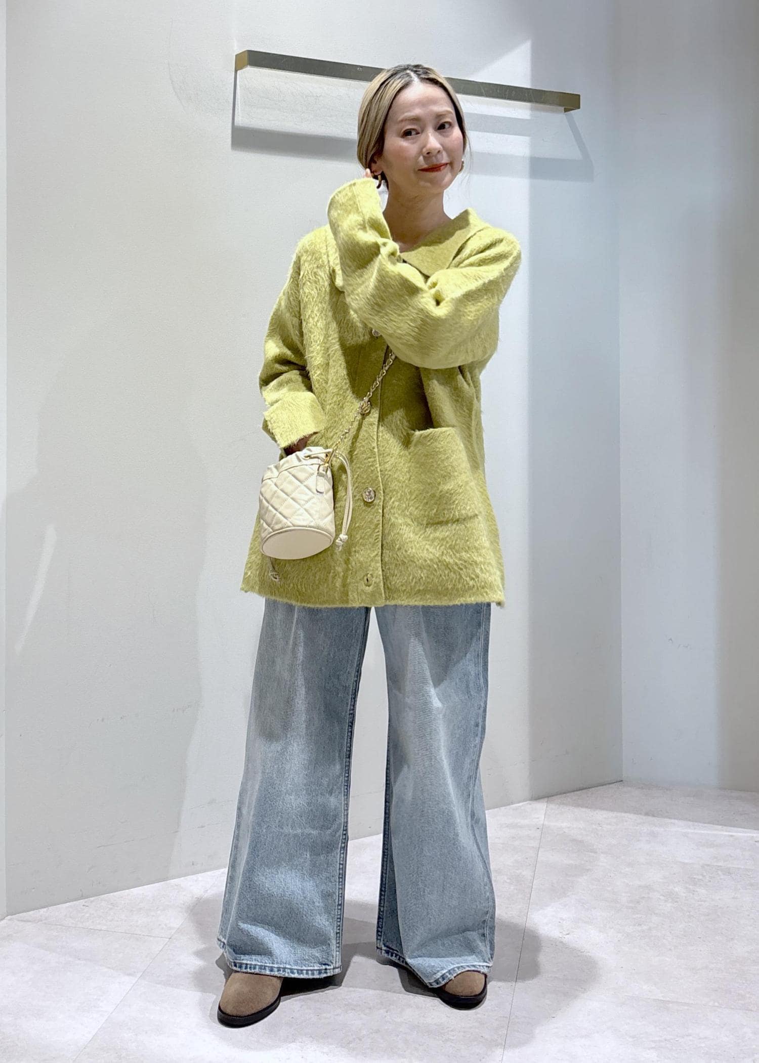 春らしいライムグリーンのコーディガンを主役に、デニムでラフさをプラス。
