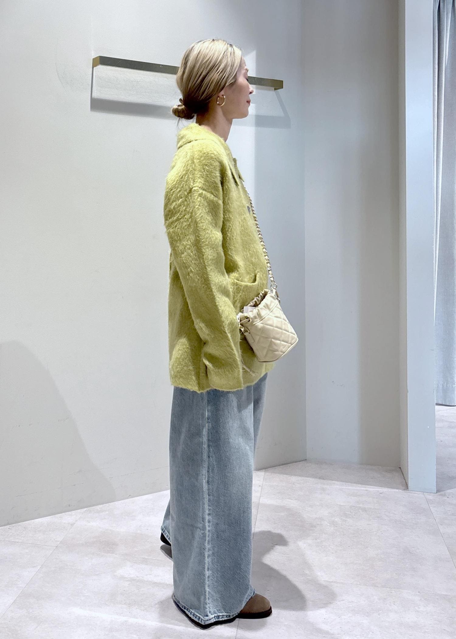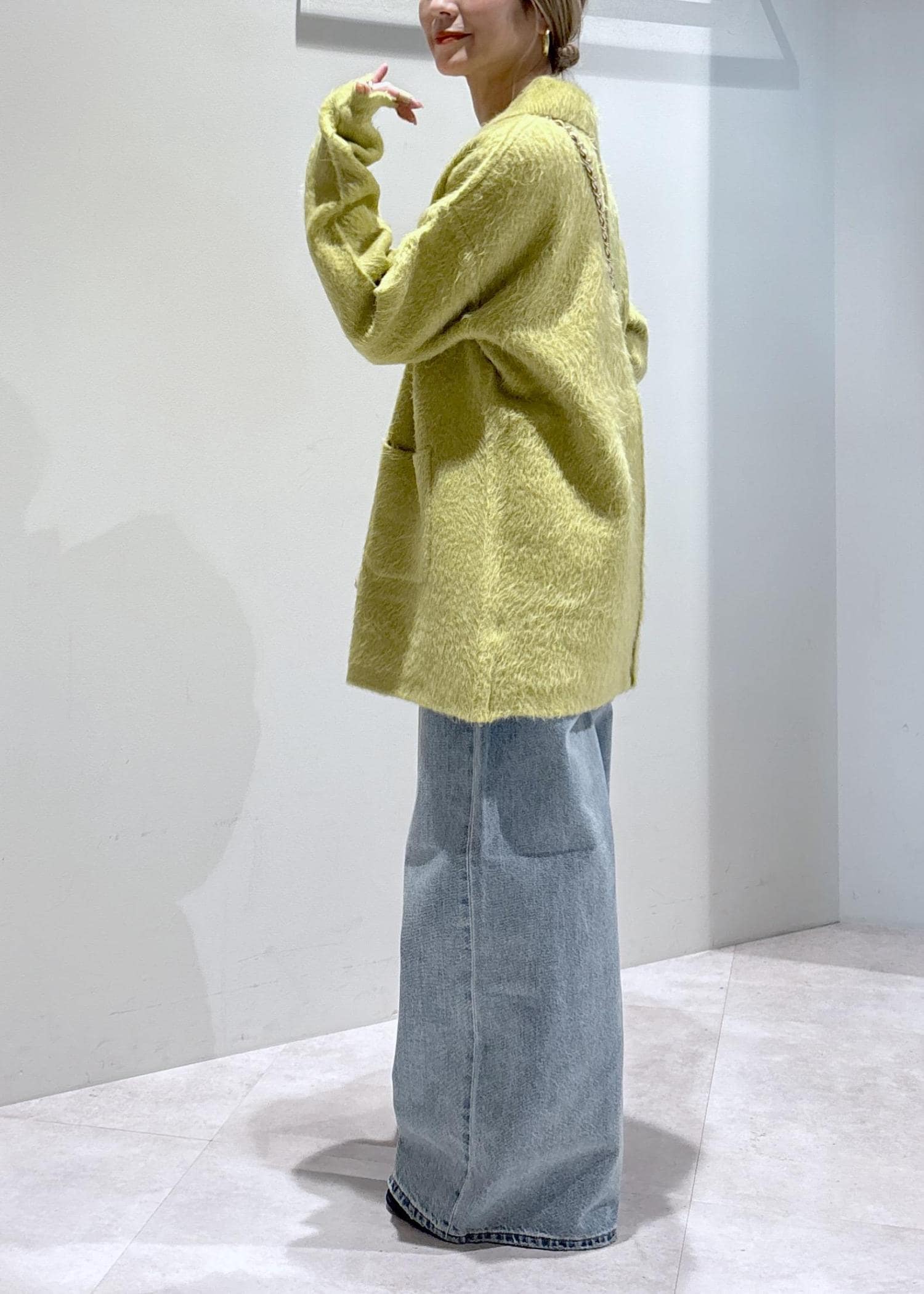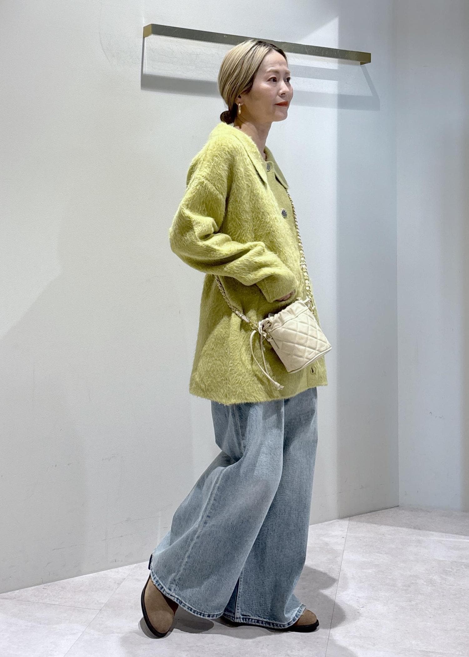 春らしいライムグリーンのコーディガンを主役に、デニムでラフさをプラス。