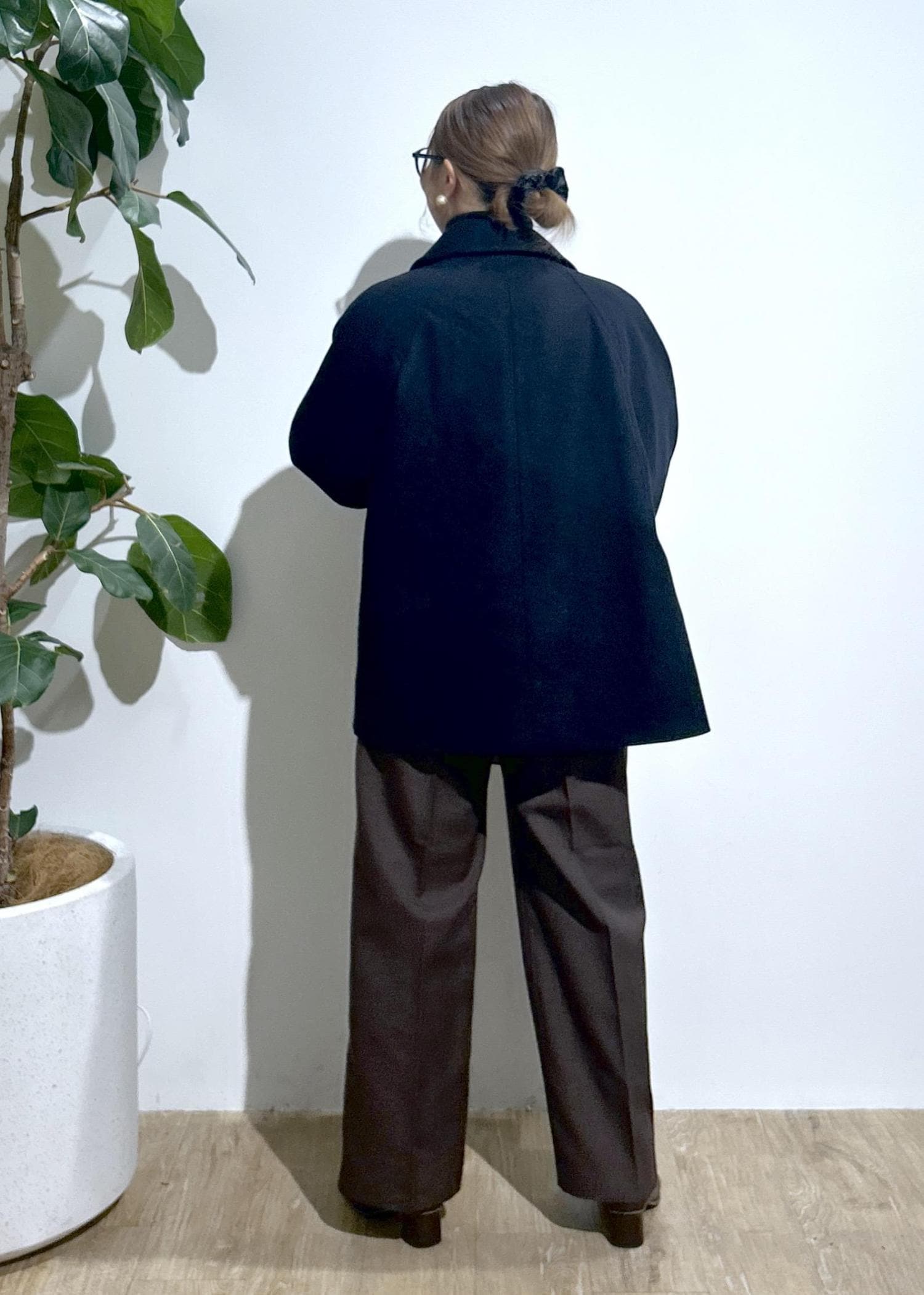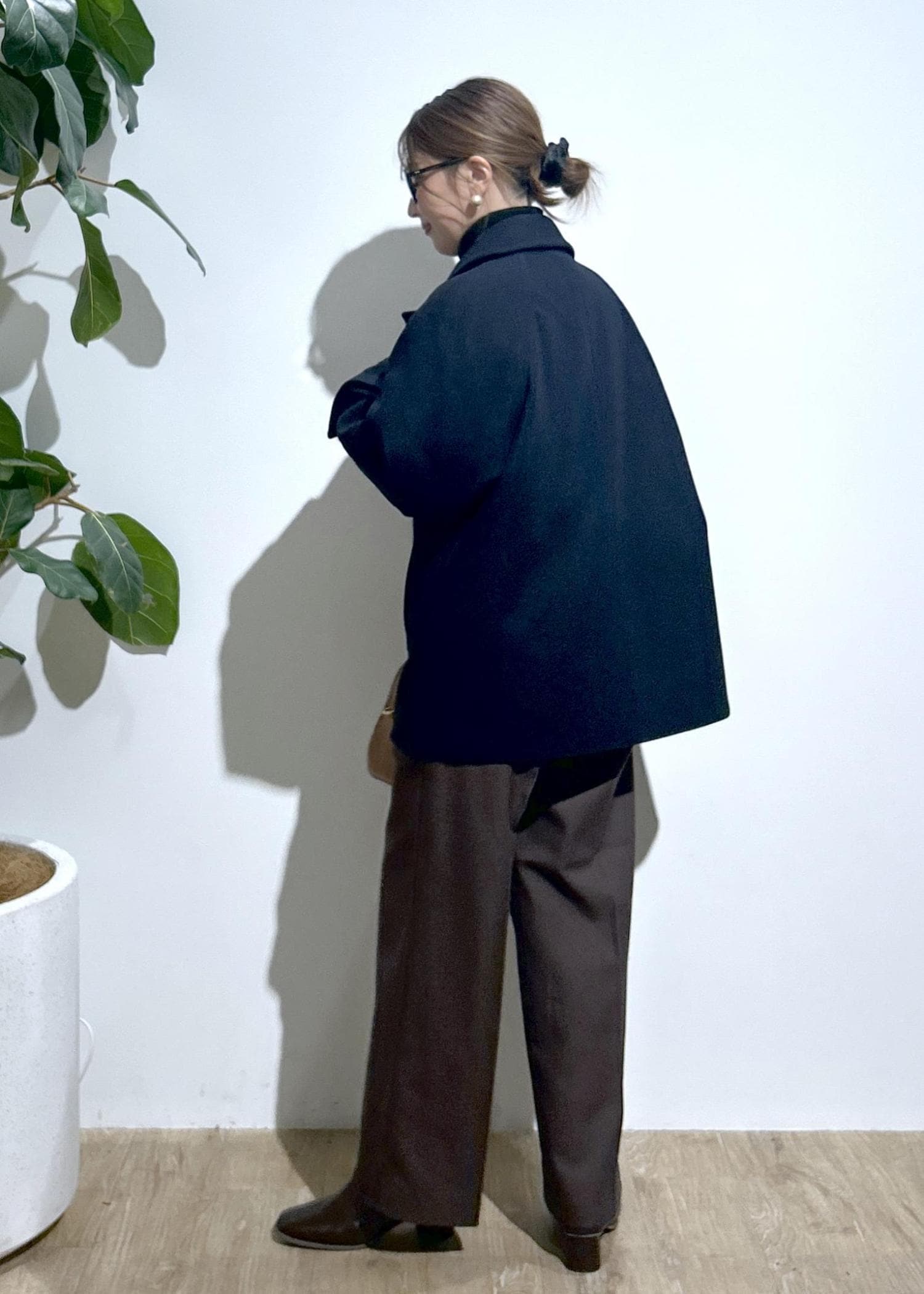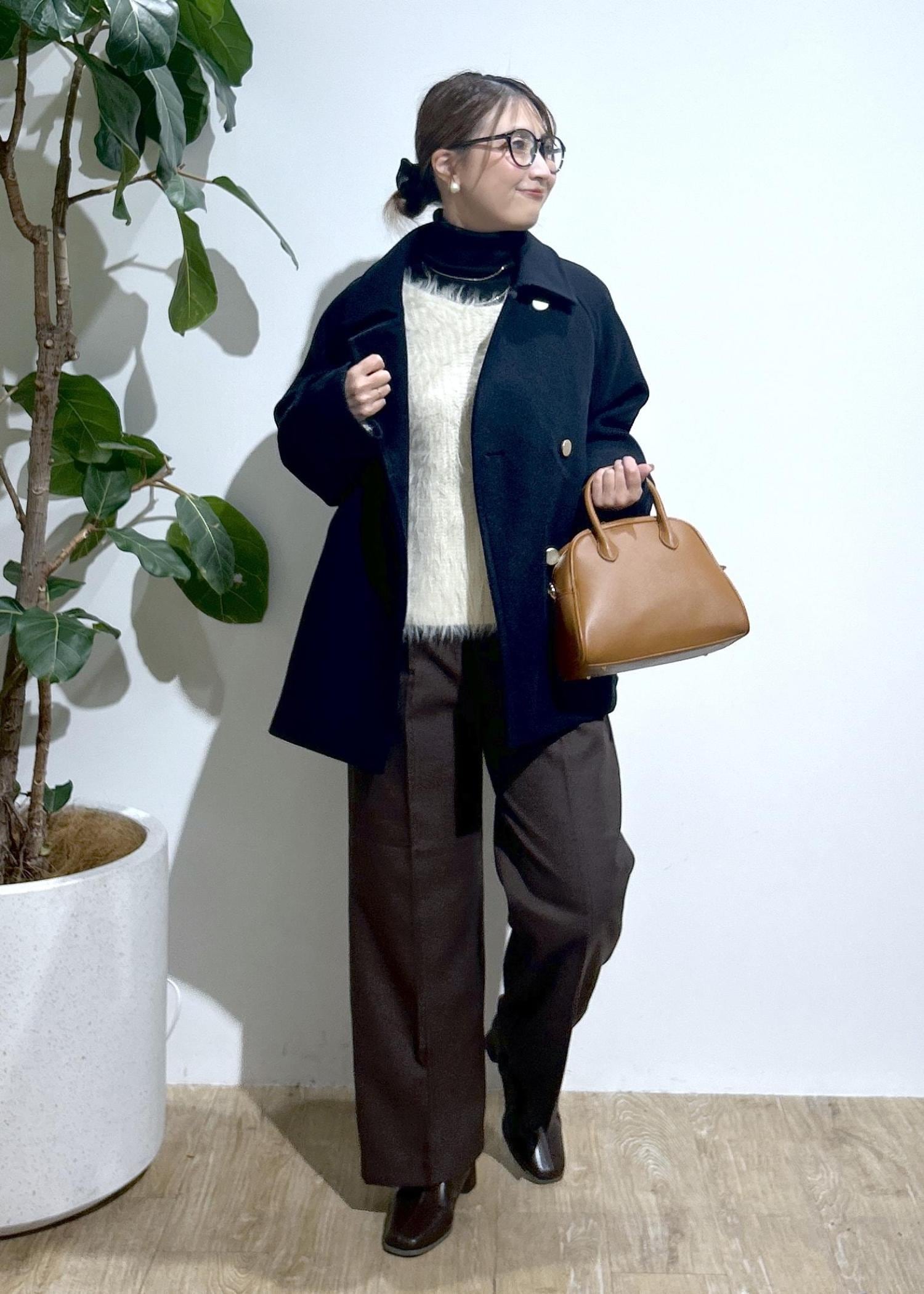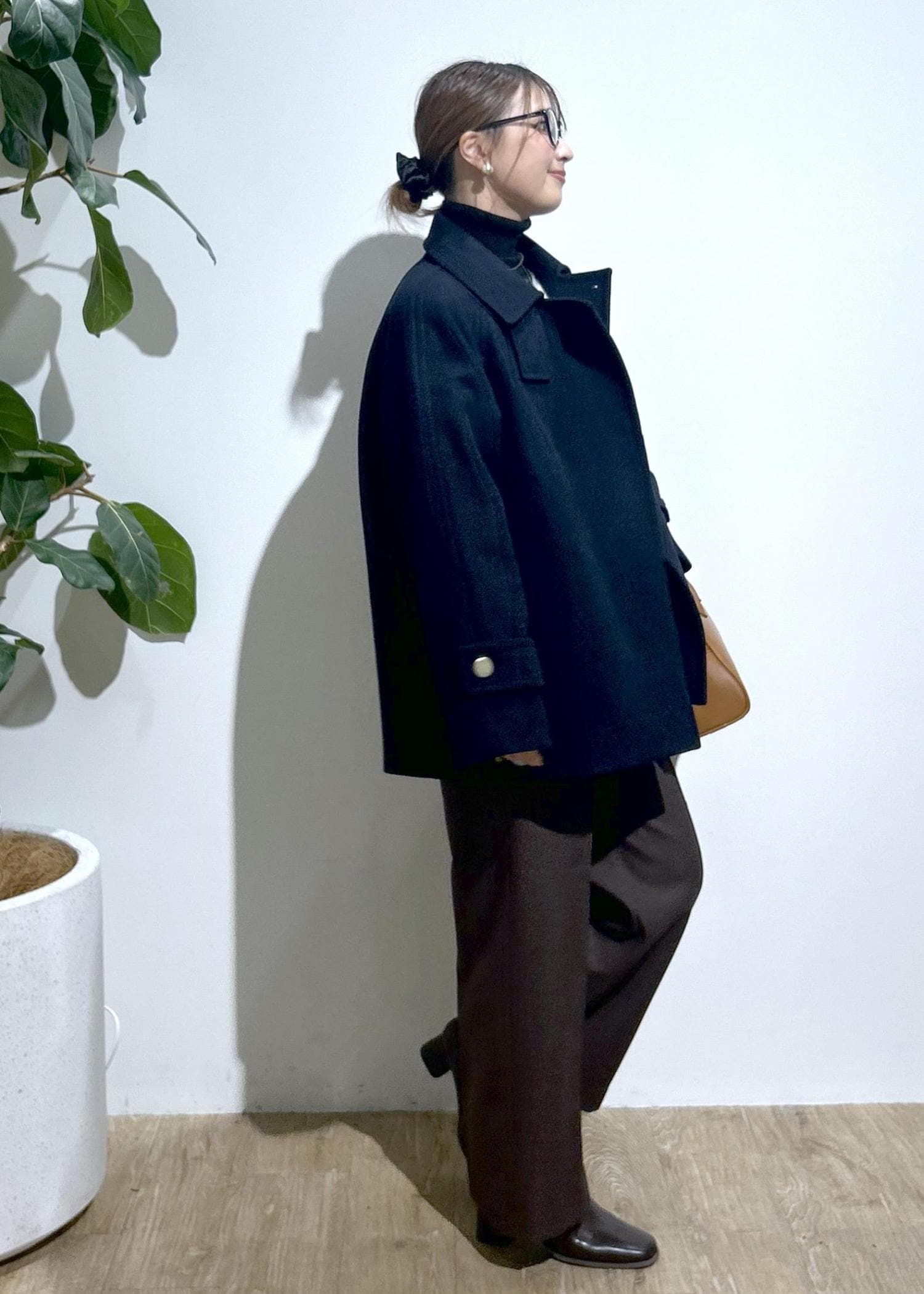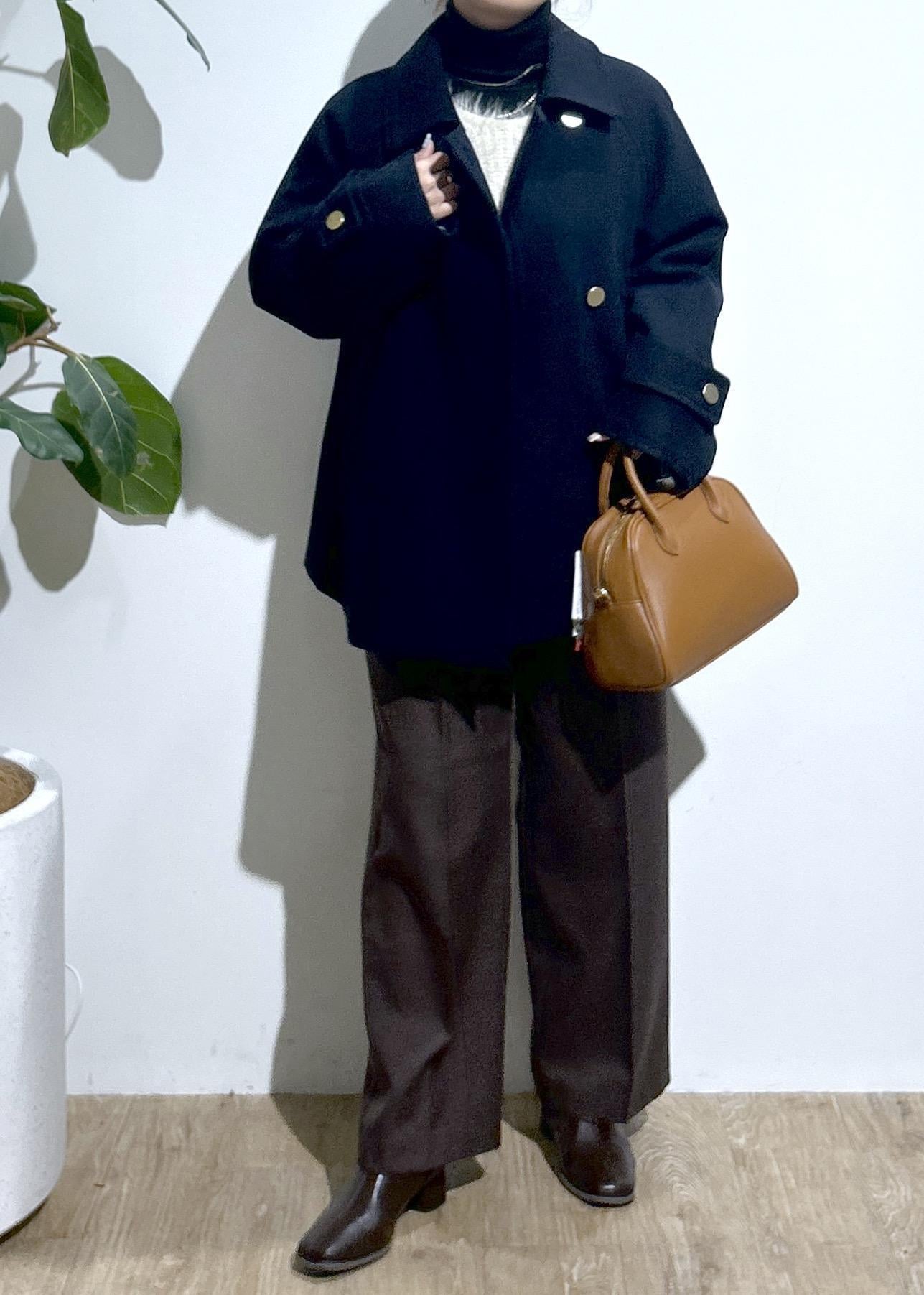 上までボタンを止めてスタンドカラーコートにするとかっちり感もあり、お仕事にも◎ -