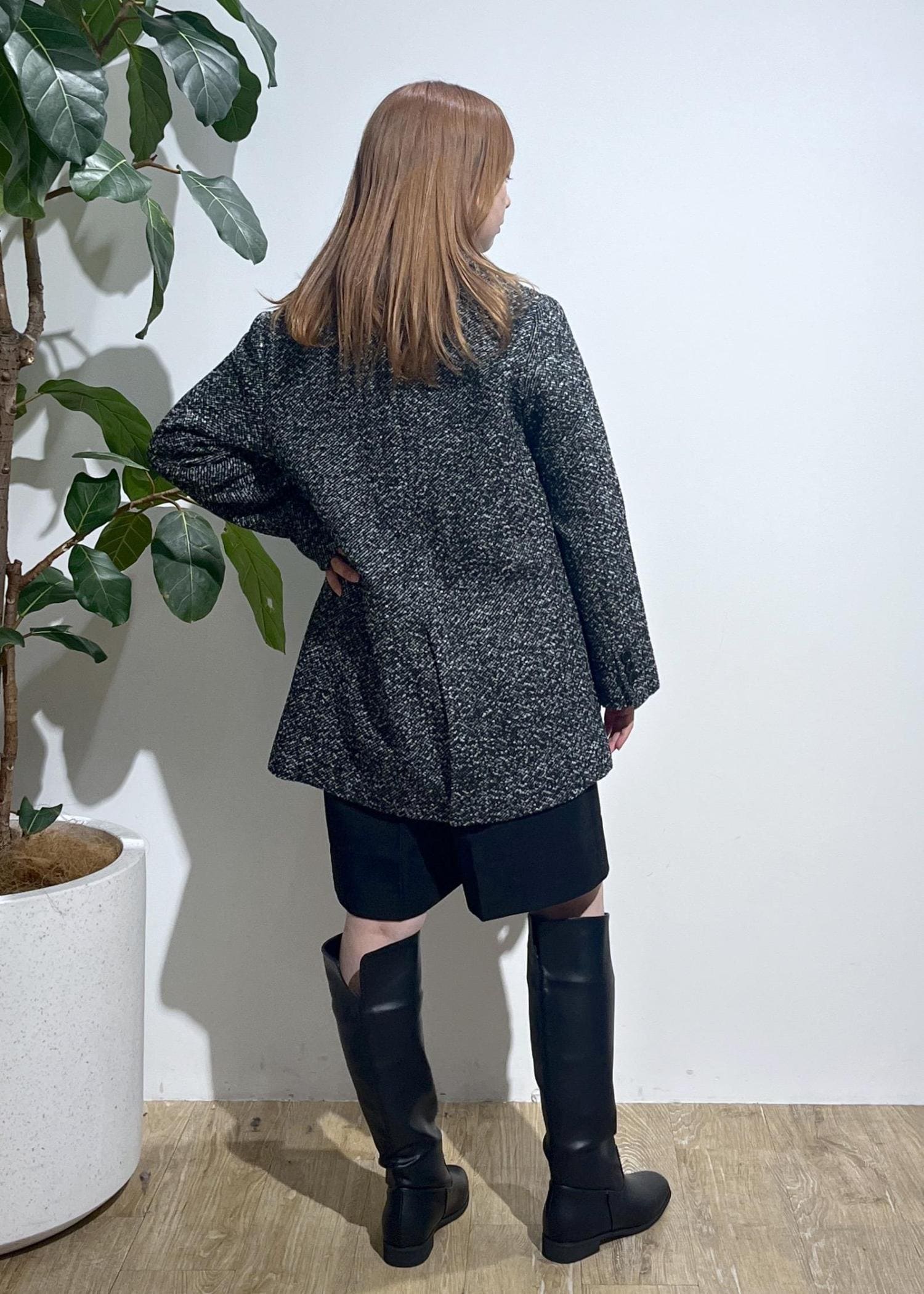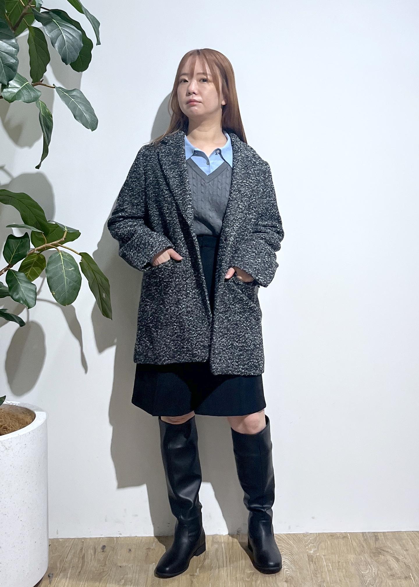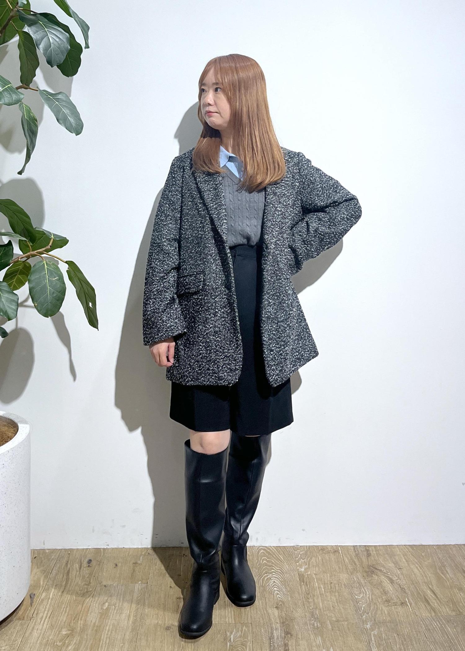 ROPÉ PICNICネップツイードテーラードジャコットブラック系 / F¥10,560レビュージャケットとコートの中間くらいの素材のジャコット。ゆとりがあるシルエットでショートパンツとロングブーツと相性が良いです。