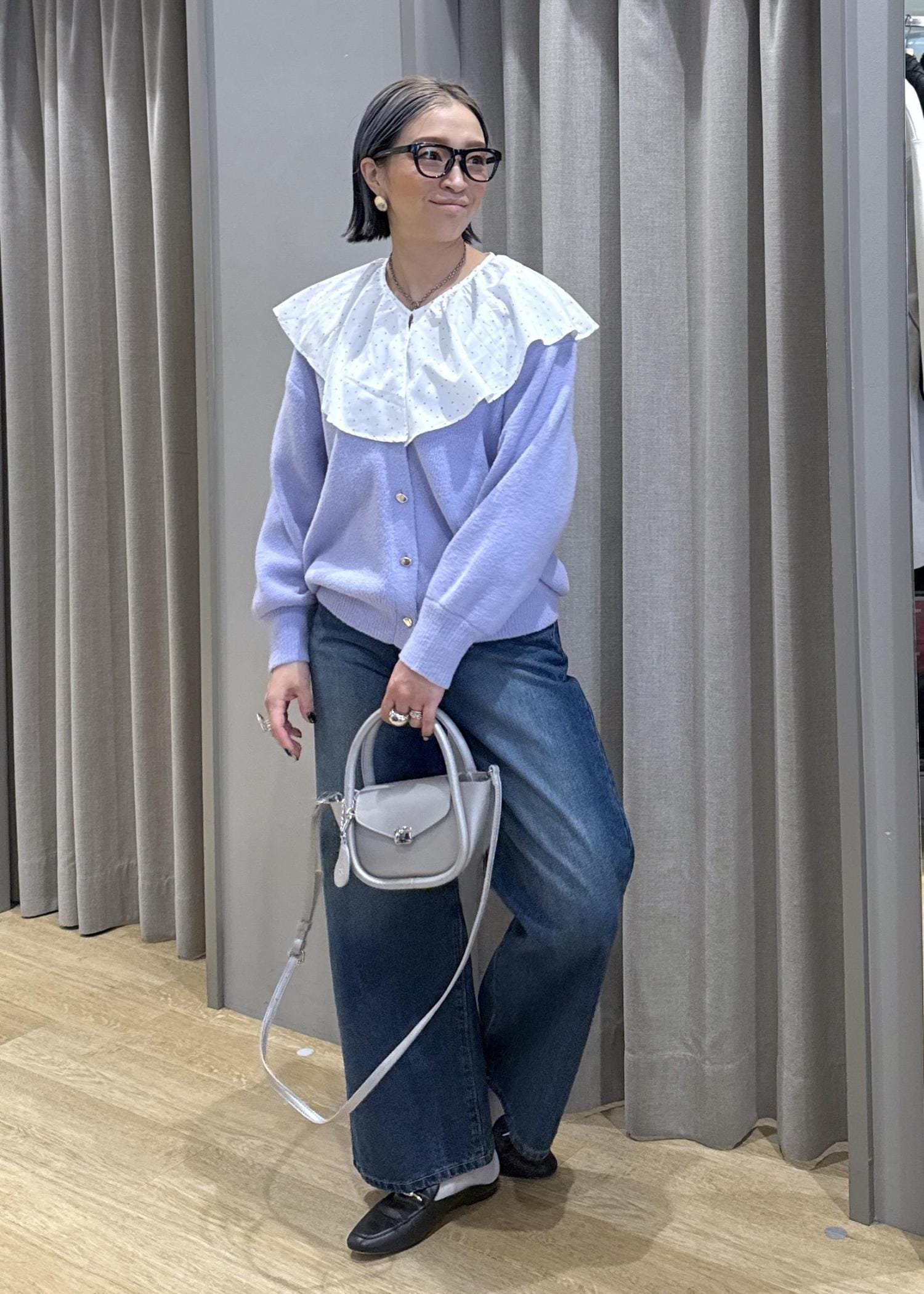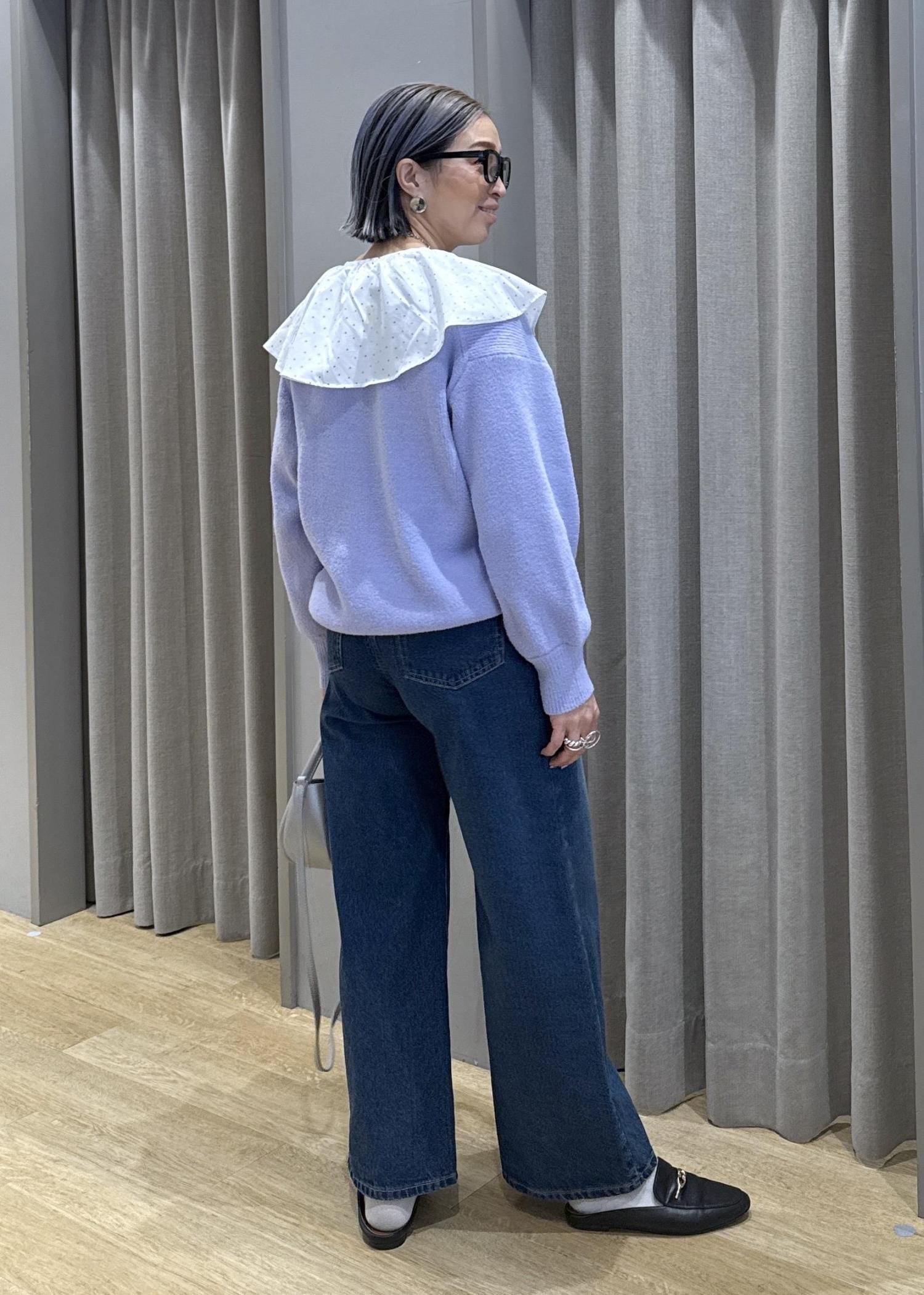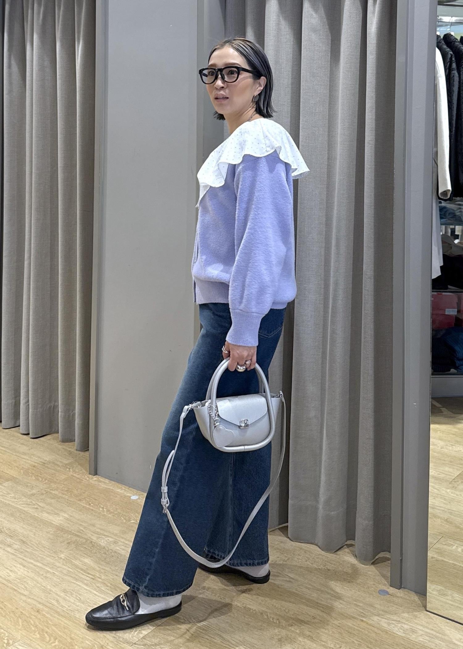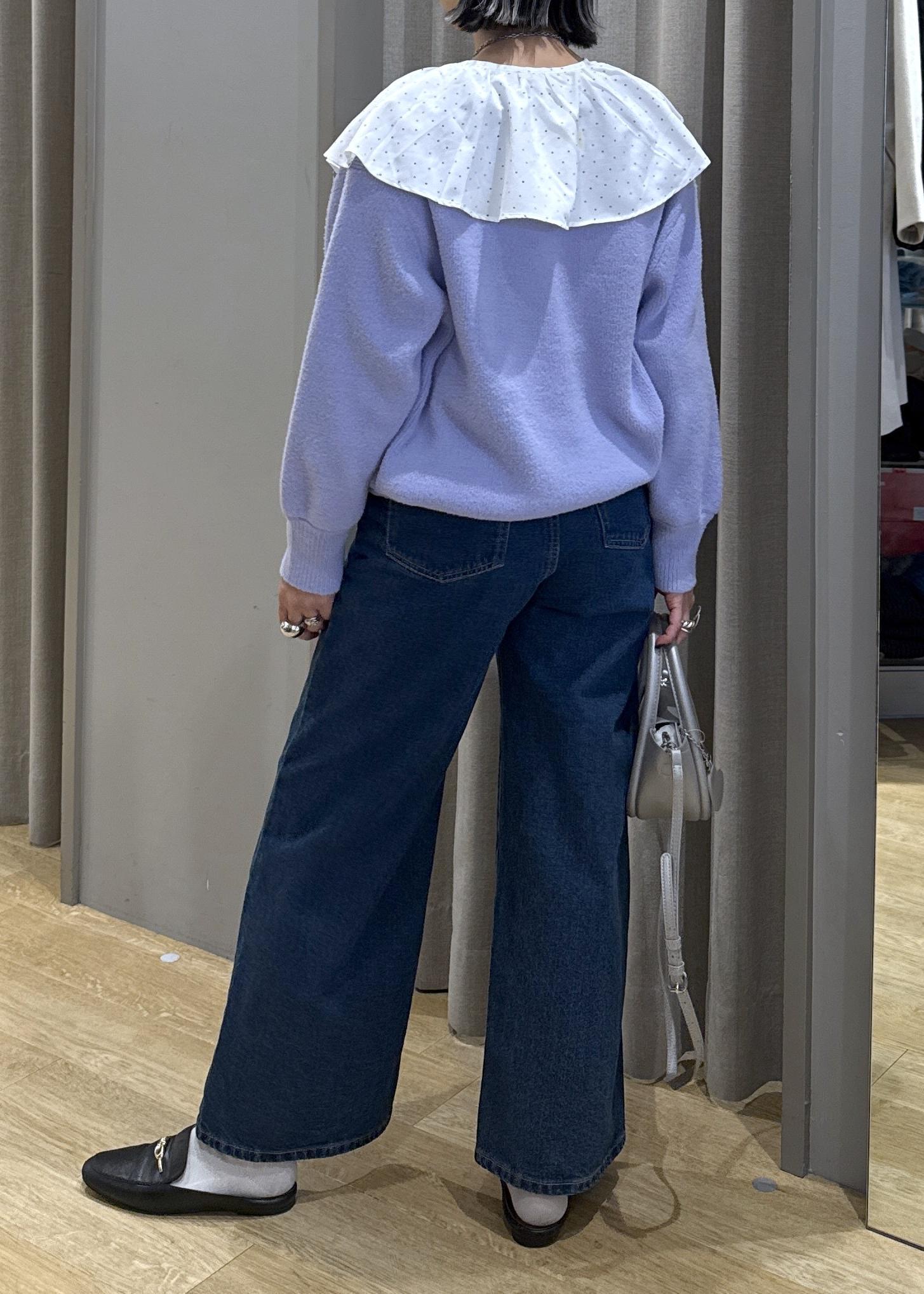 フリルの大きな襟で顔映りとフェミニンさをプラスしました。