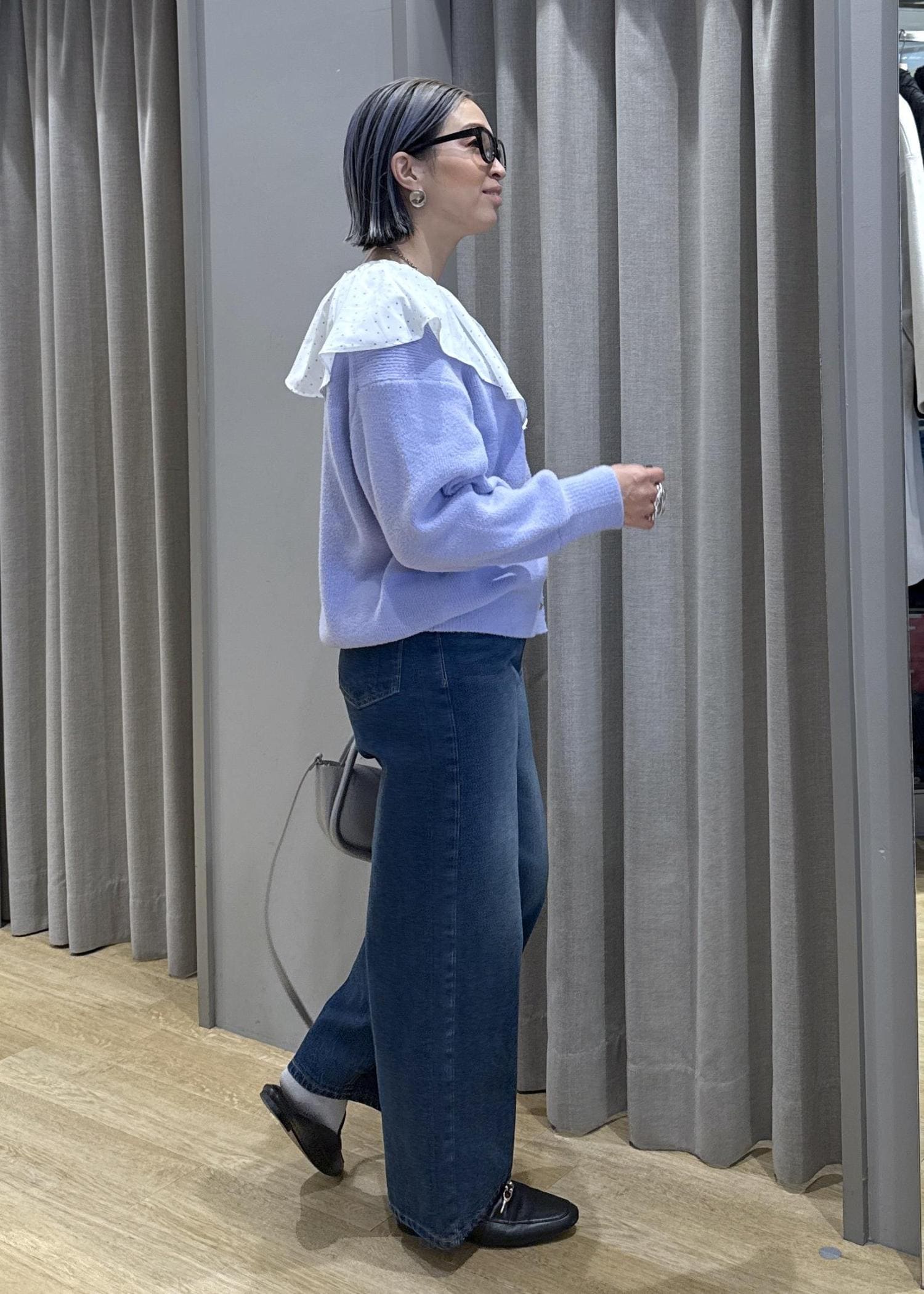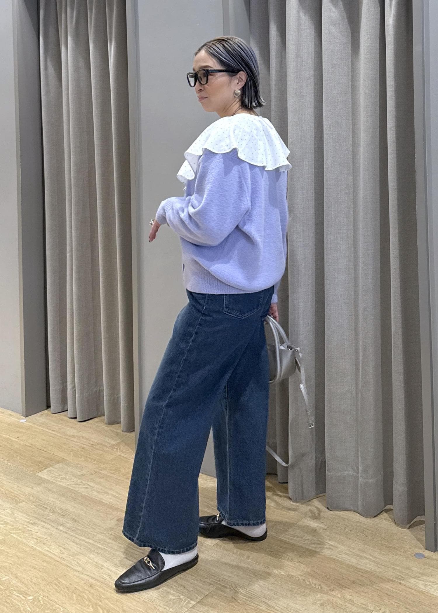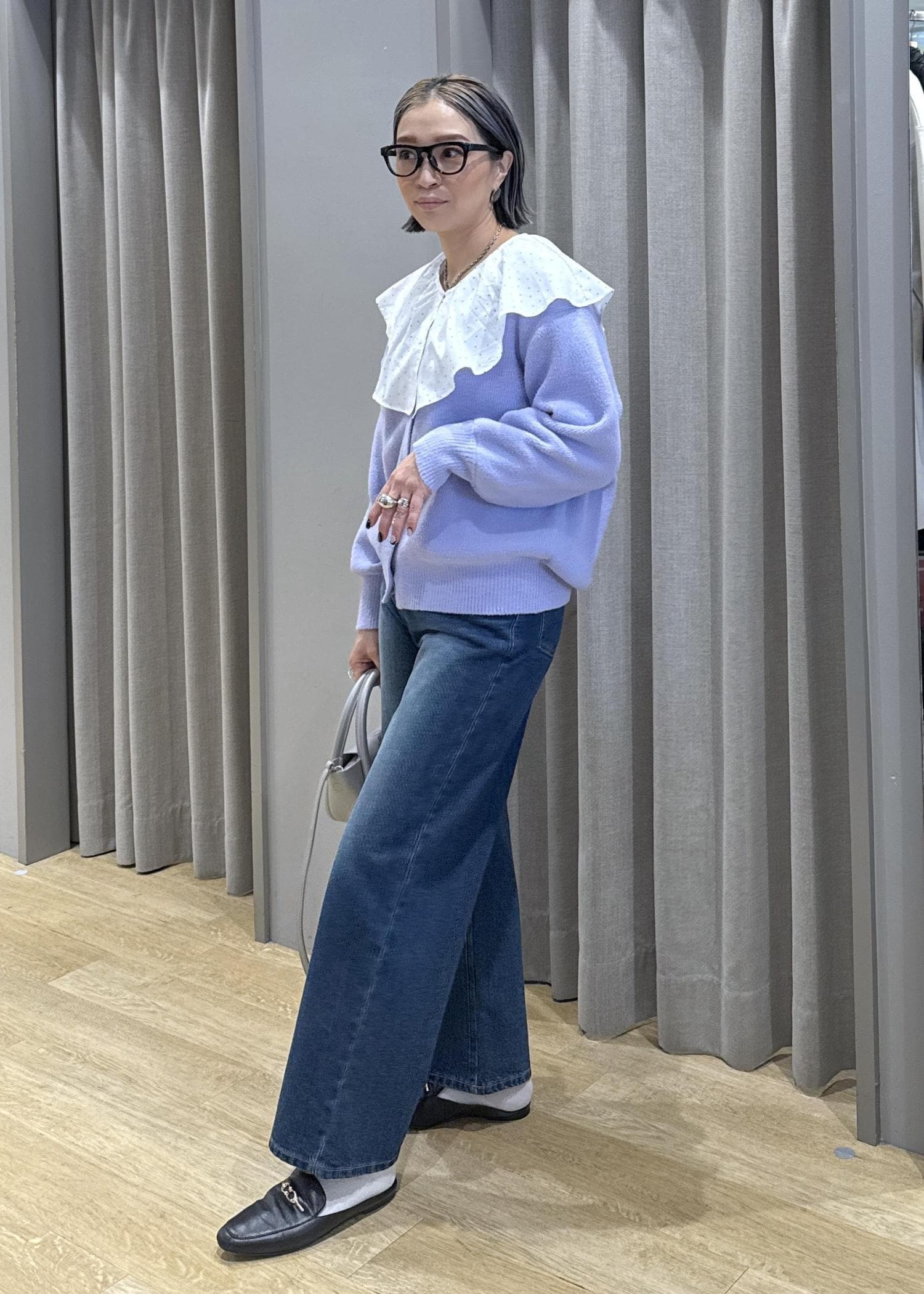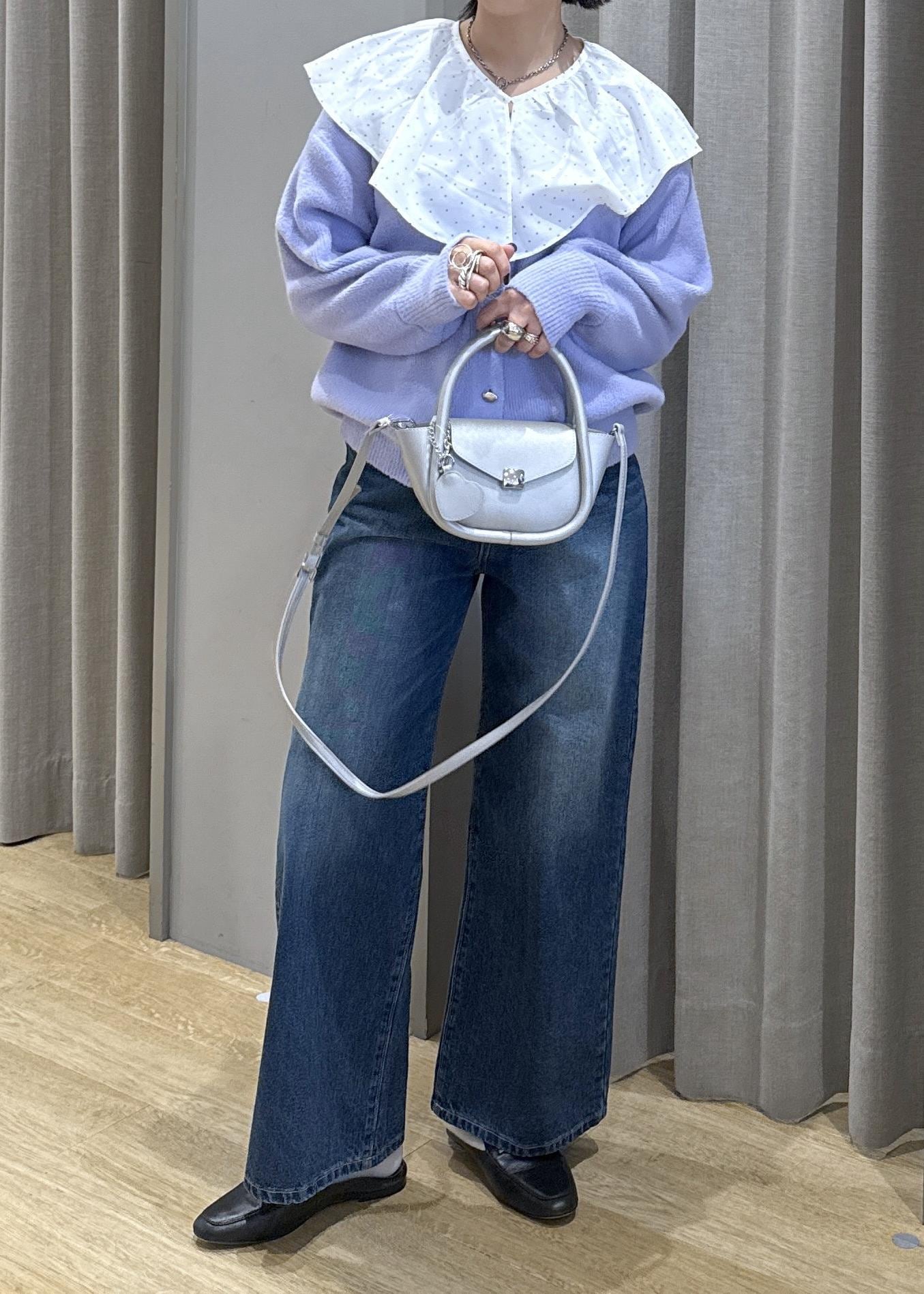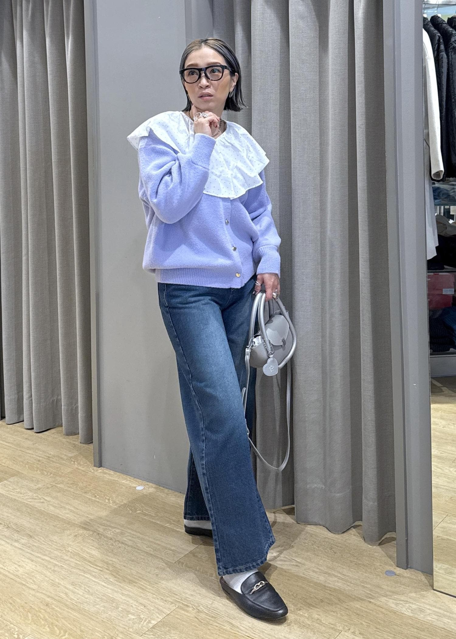 フリルの大きな襟で顔映りとフェミニンさをプラスしました。