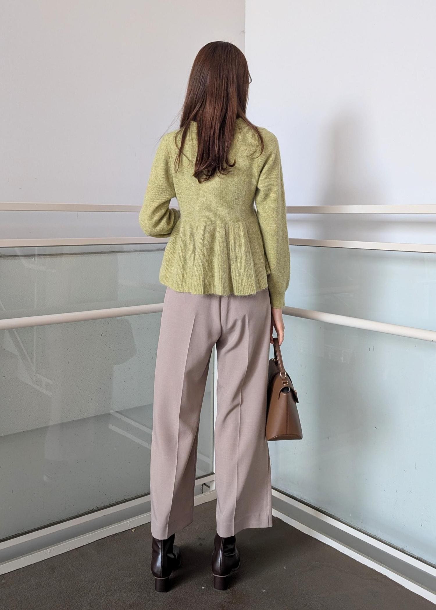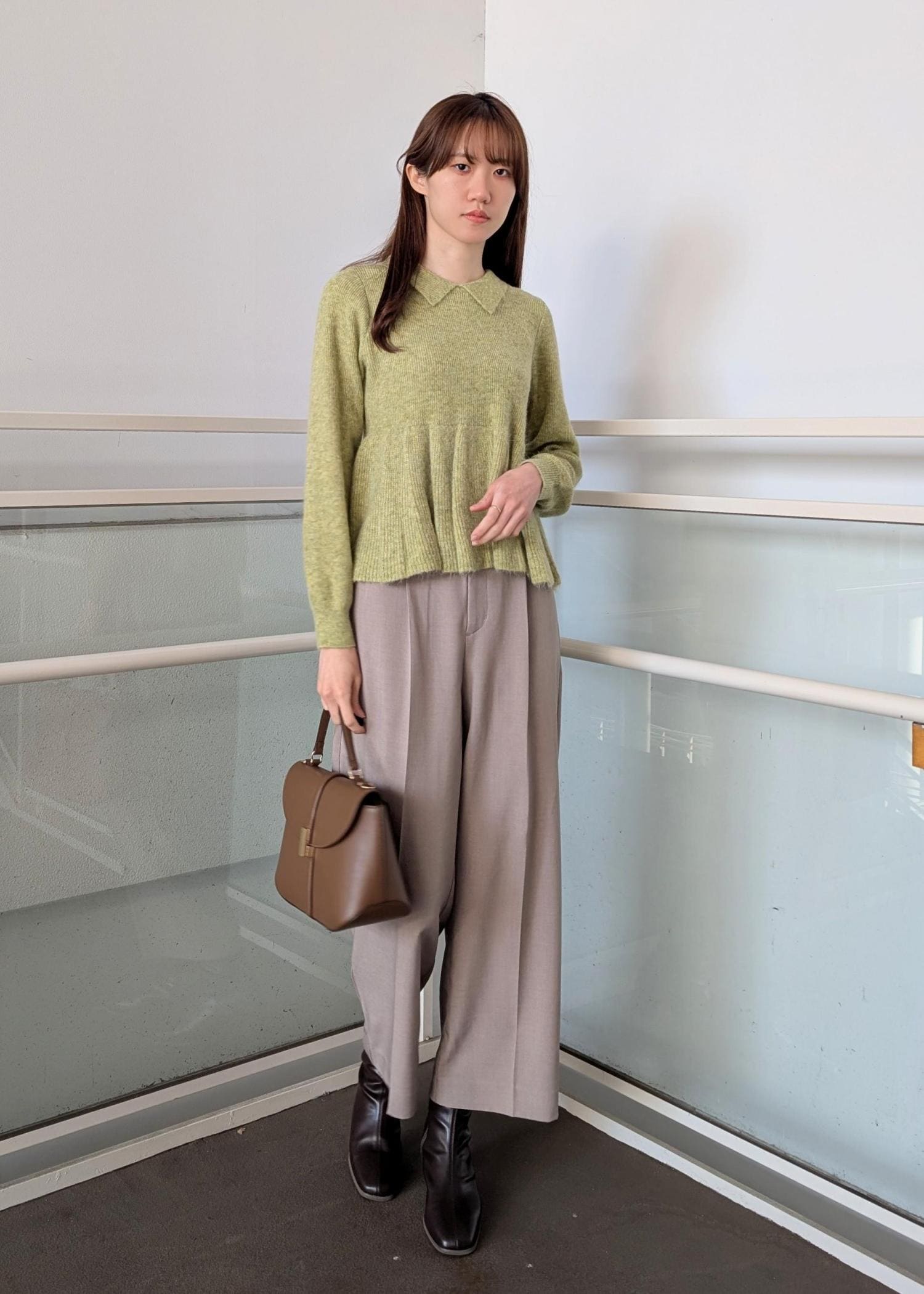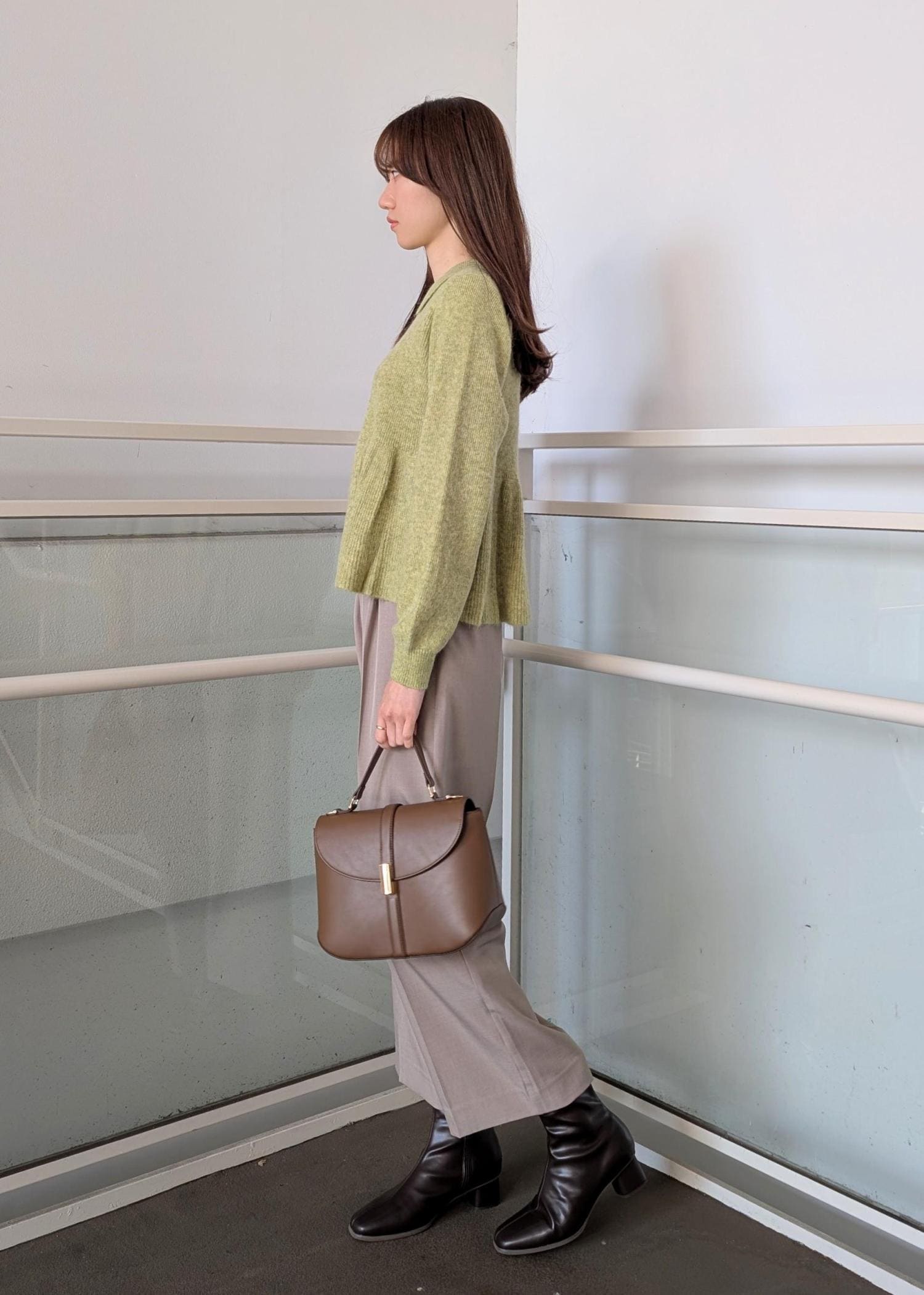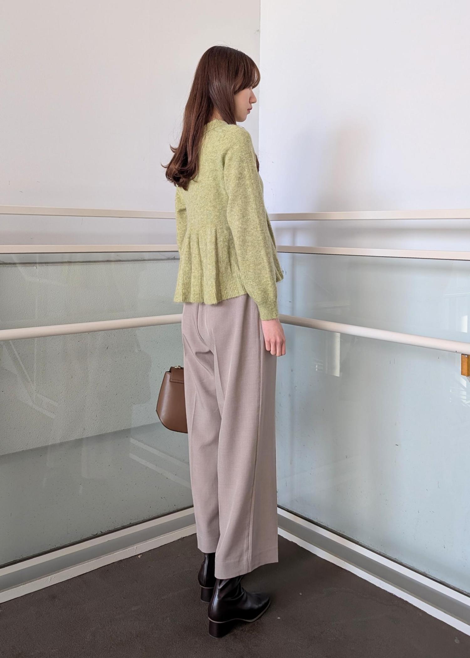 春らしいカラーとブラウンの小物でまとめました。ニットは高い位置に切り替えがあるのでスッキリとしたボトムスと合わせたコーディネートがおすすめです。