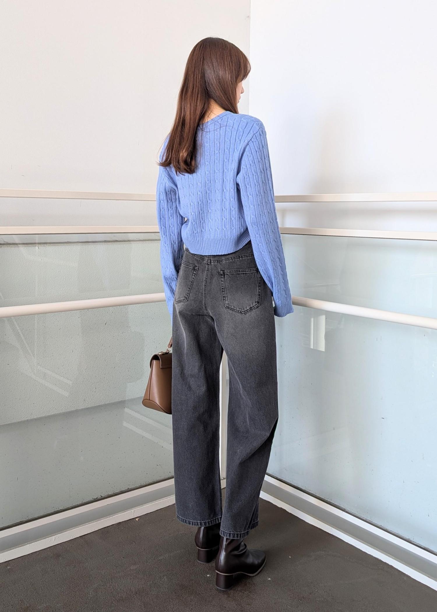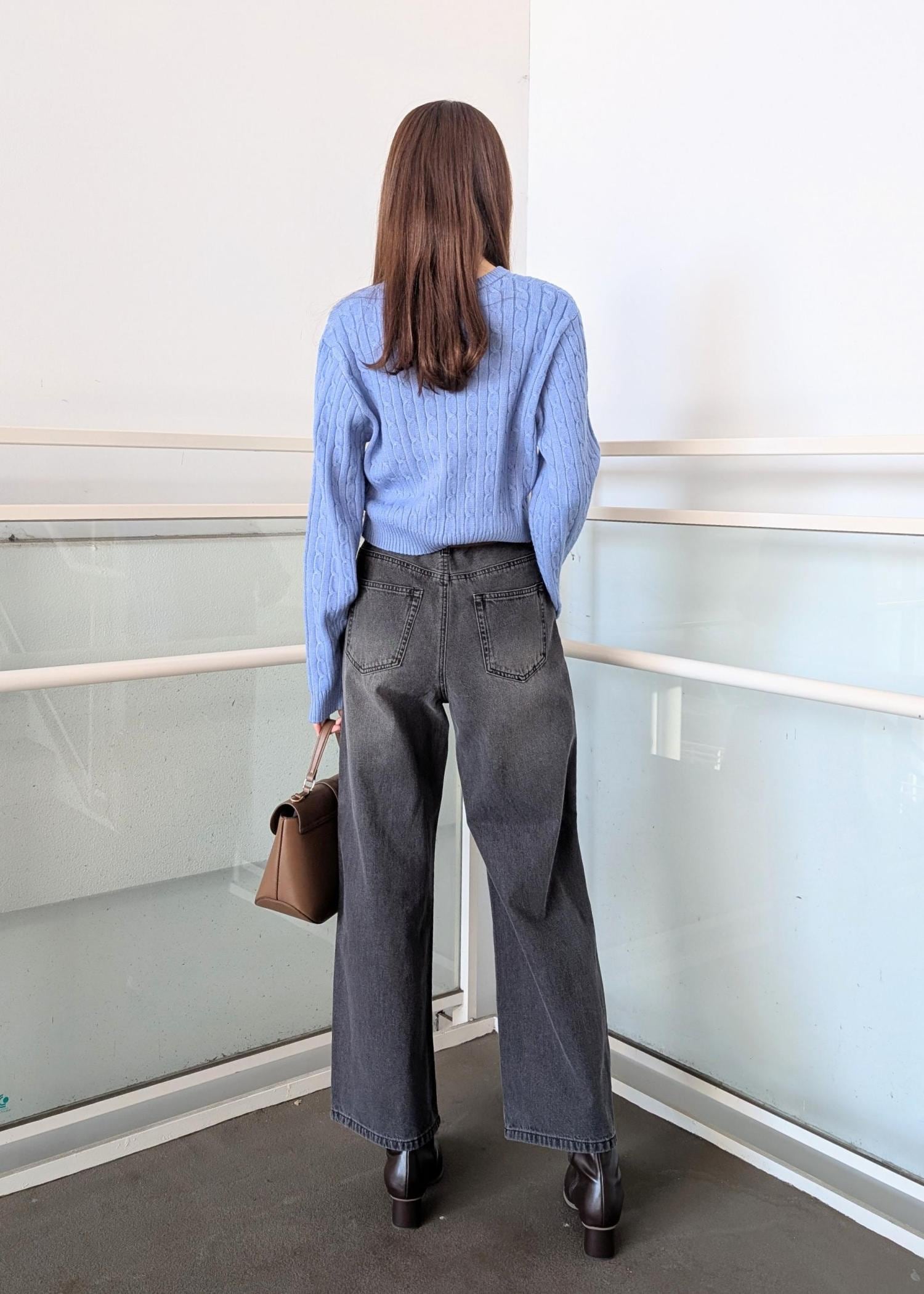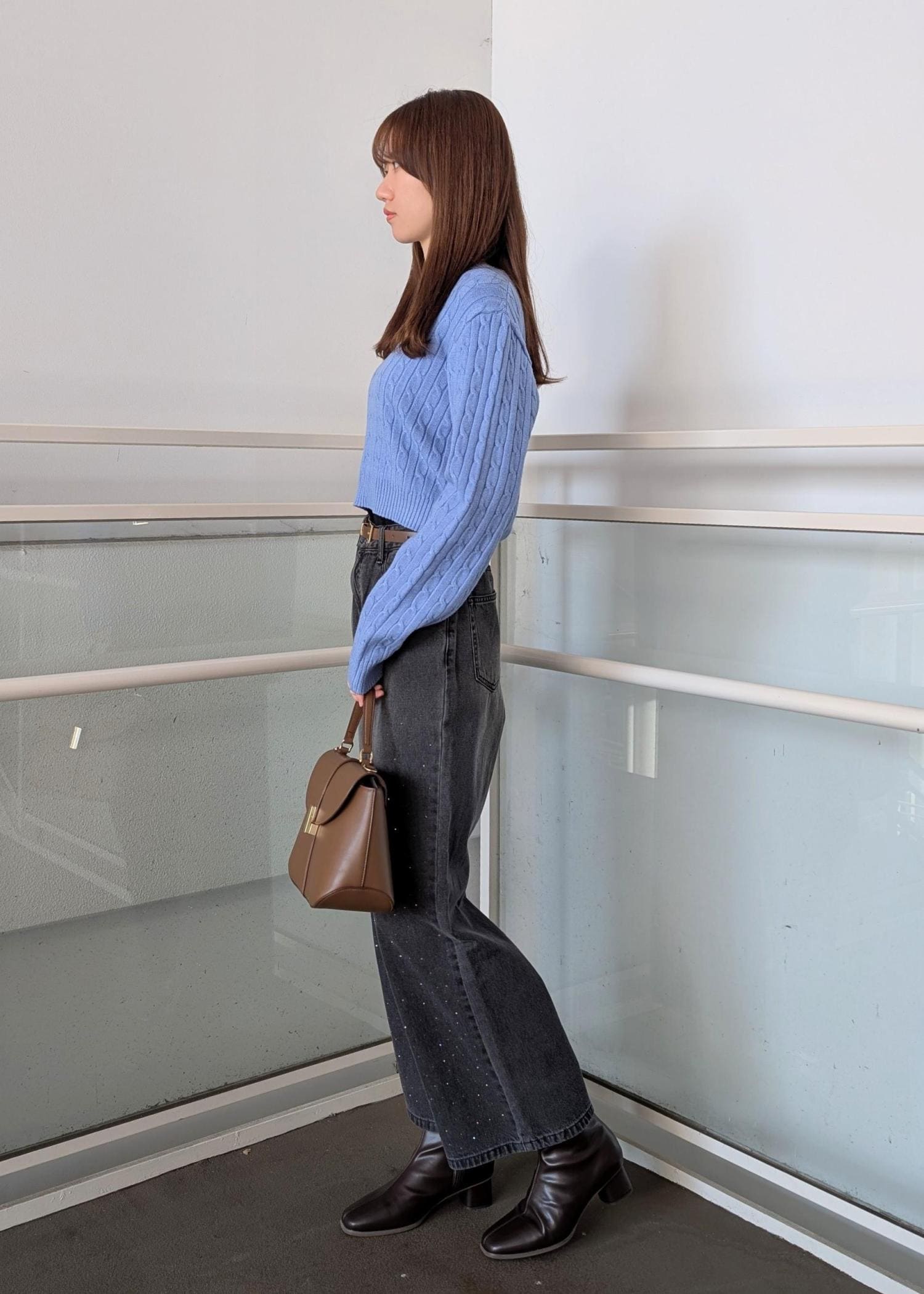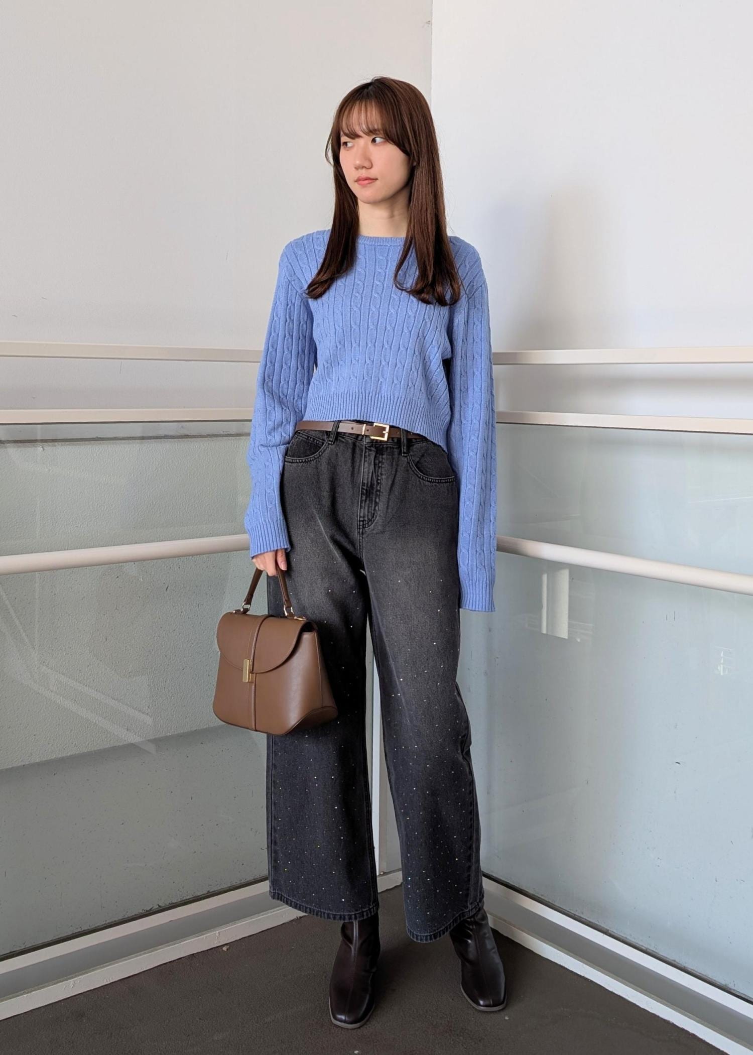 ゆったりとした袖部分とクロップド丈のメリハリが可愛いニットです。デニム合わせで春らしさを出しました。