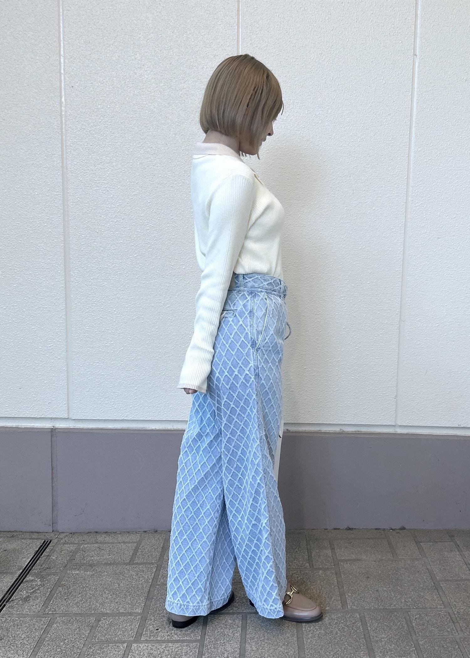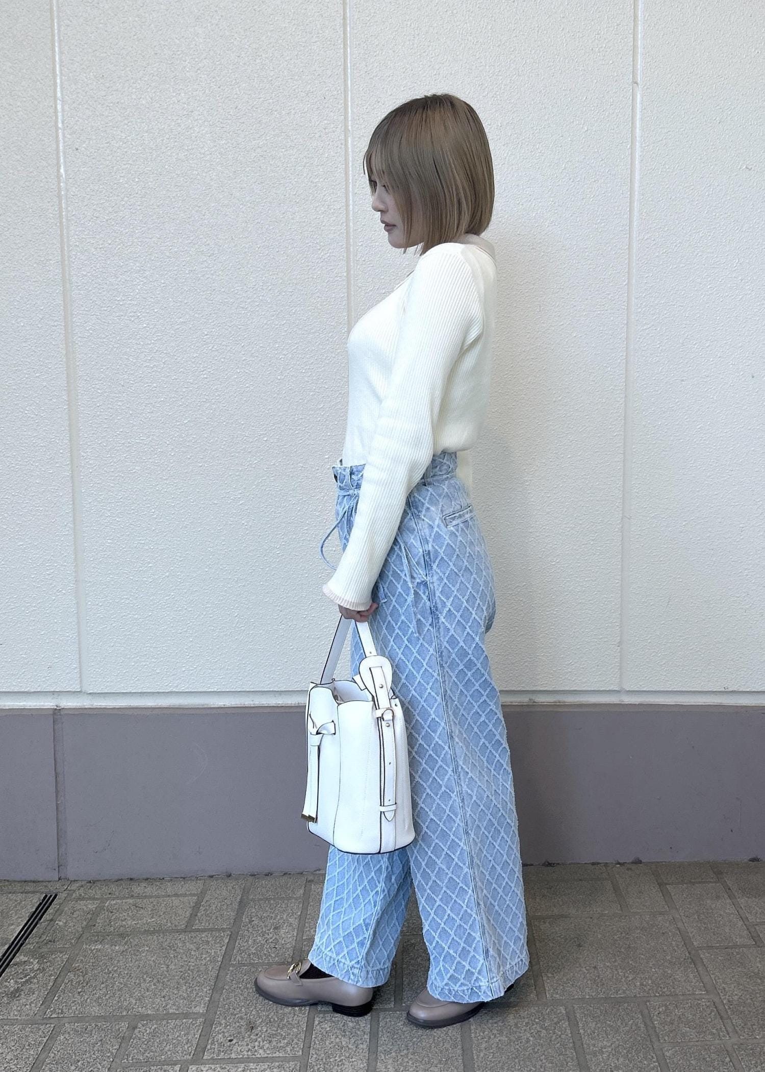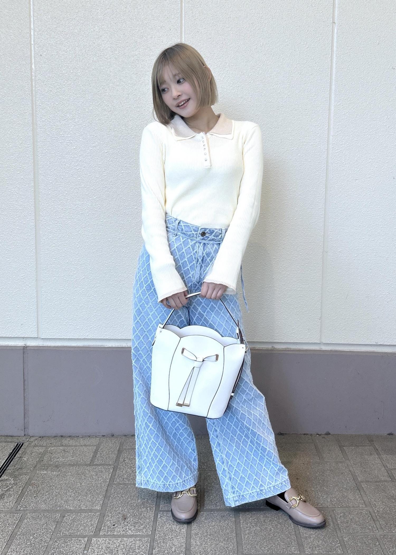リボンの可愛らしいデザインのデニムにフェミニンなトップスを合わせることで、女の子らしさを残し、あたたかさを感じさせてくれるおでかけコーデにしました!
