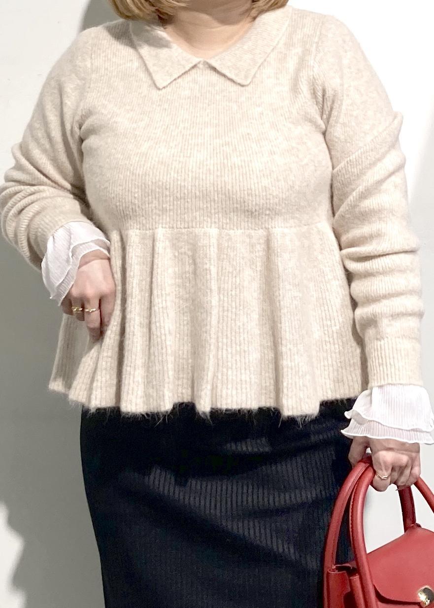 ペプラムデザインがかわいいニットのコーデです。