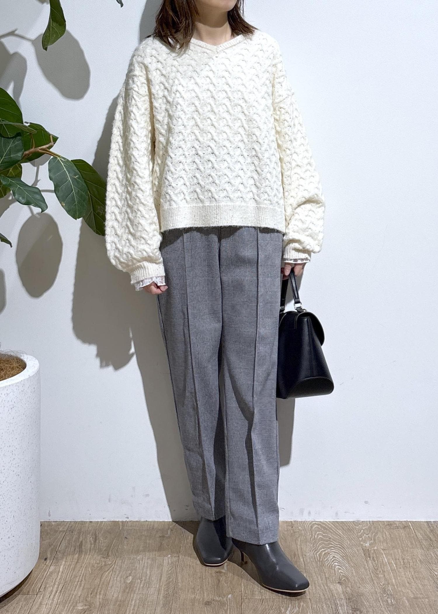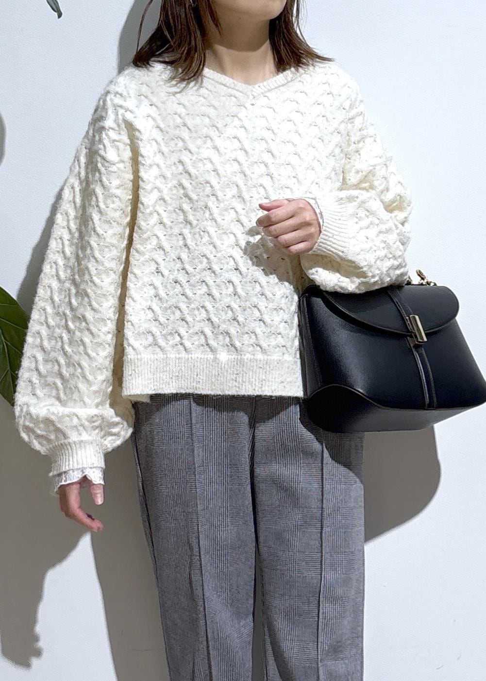 Vネックなので首回りをすっきり見せ、ブラウスやシアーインナーなどレイヤードスタイルも楽しめます。
