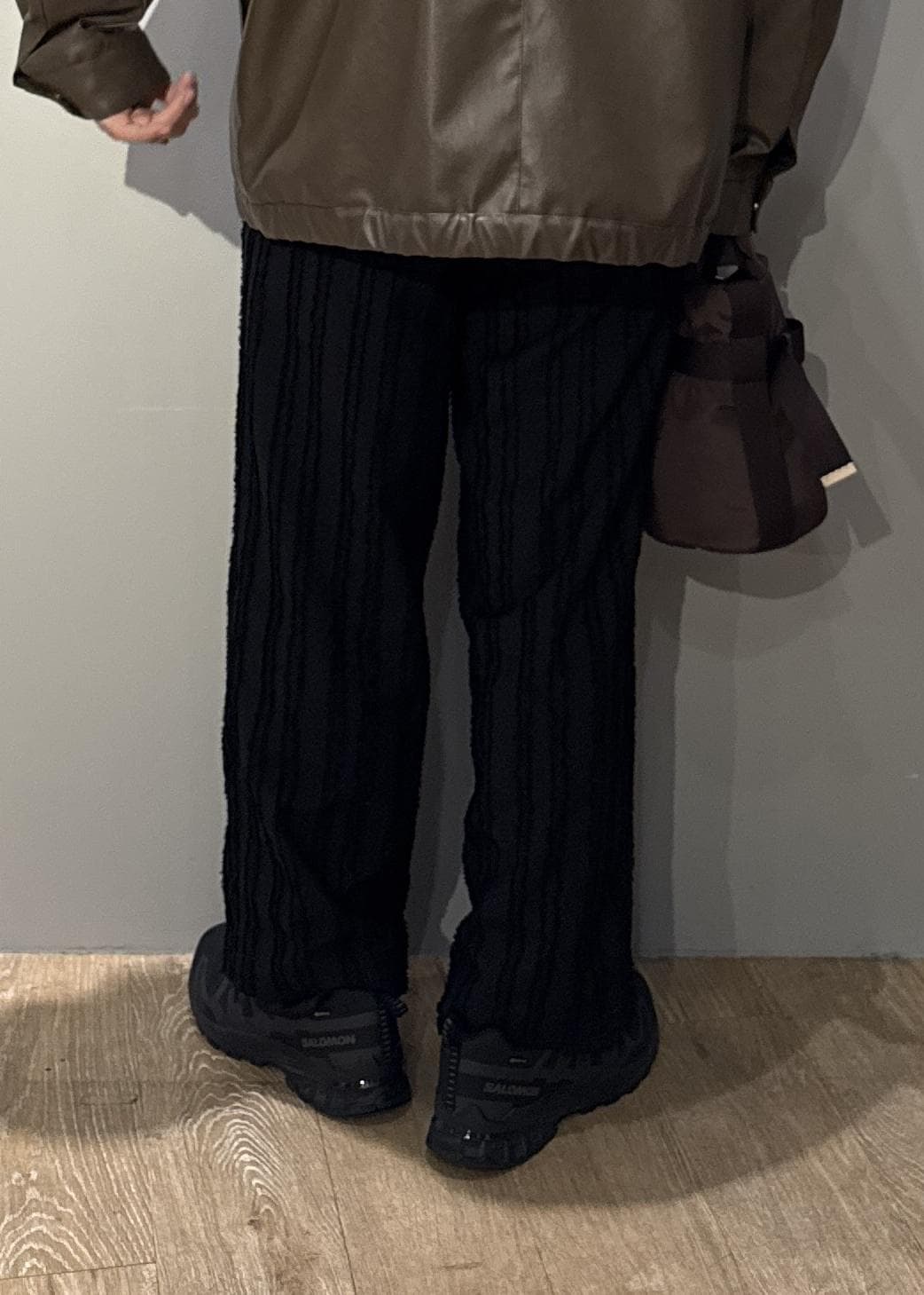 アウトレットJUNRED【セットアップ対応】テクスチャードファブリックインタックワイドパンツブラック / M¥3,960レビューフェザー感のあるストライプにプラスして光沢のあるラメ糸を織り込んだ