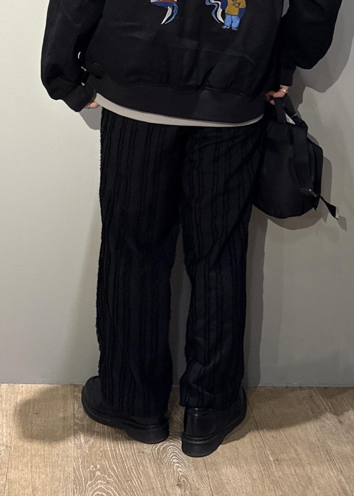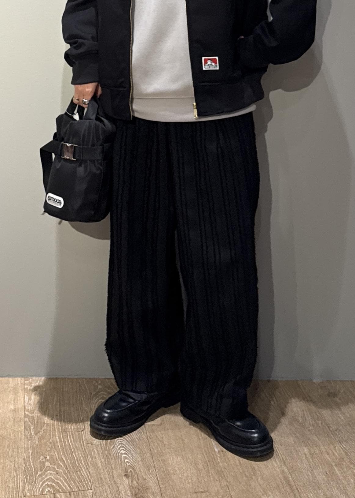 アウトレットJUNRED【セットアップ対応】テクスチャードファブリックインタックワイドパンツブラック / M¥3,960レビューフェザー感のあるストライプにプラスして光沢のあるラメ糸を織り込んだ