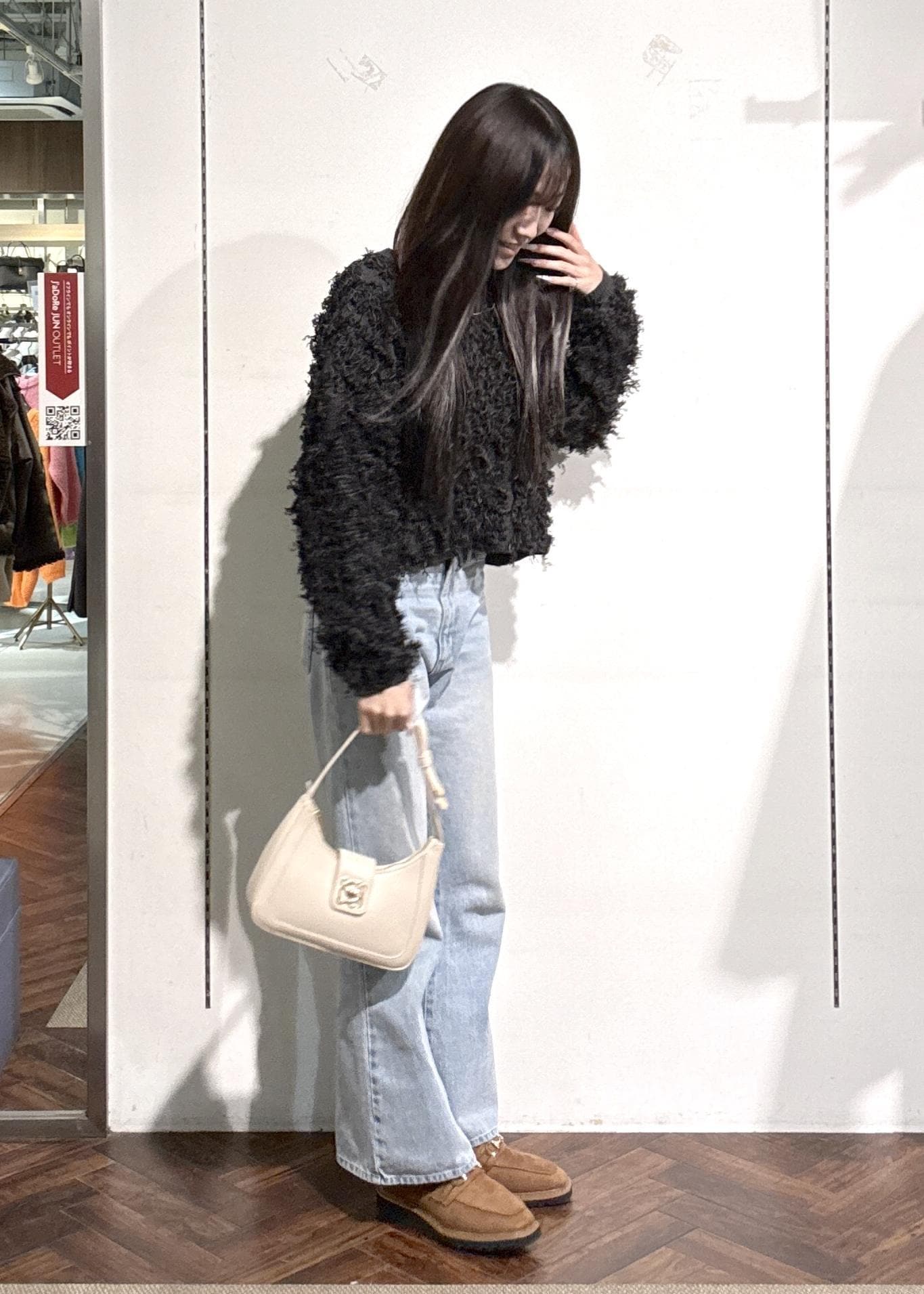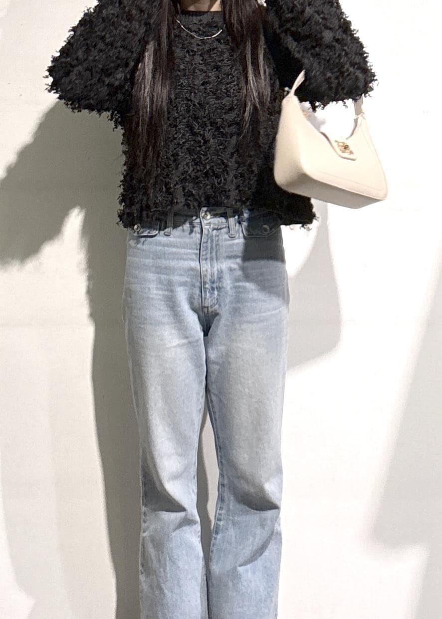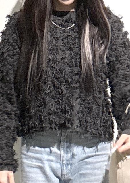 フサフサの毛足感が可愛い!旬のフリンジを1枚で取り入れられるニットプルオーバーです!丈感は短いですが何にでも合わせられるので色んなコーデを楽しめます^ ^♡