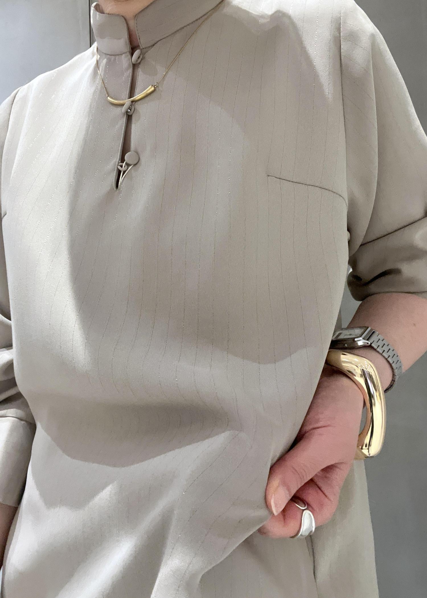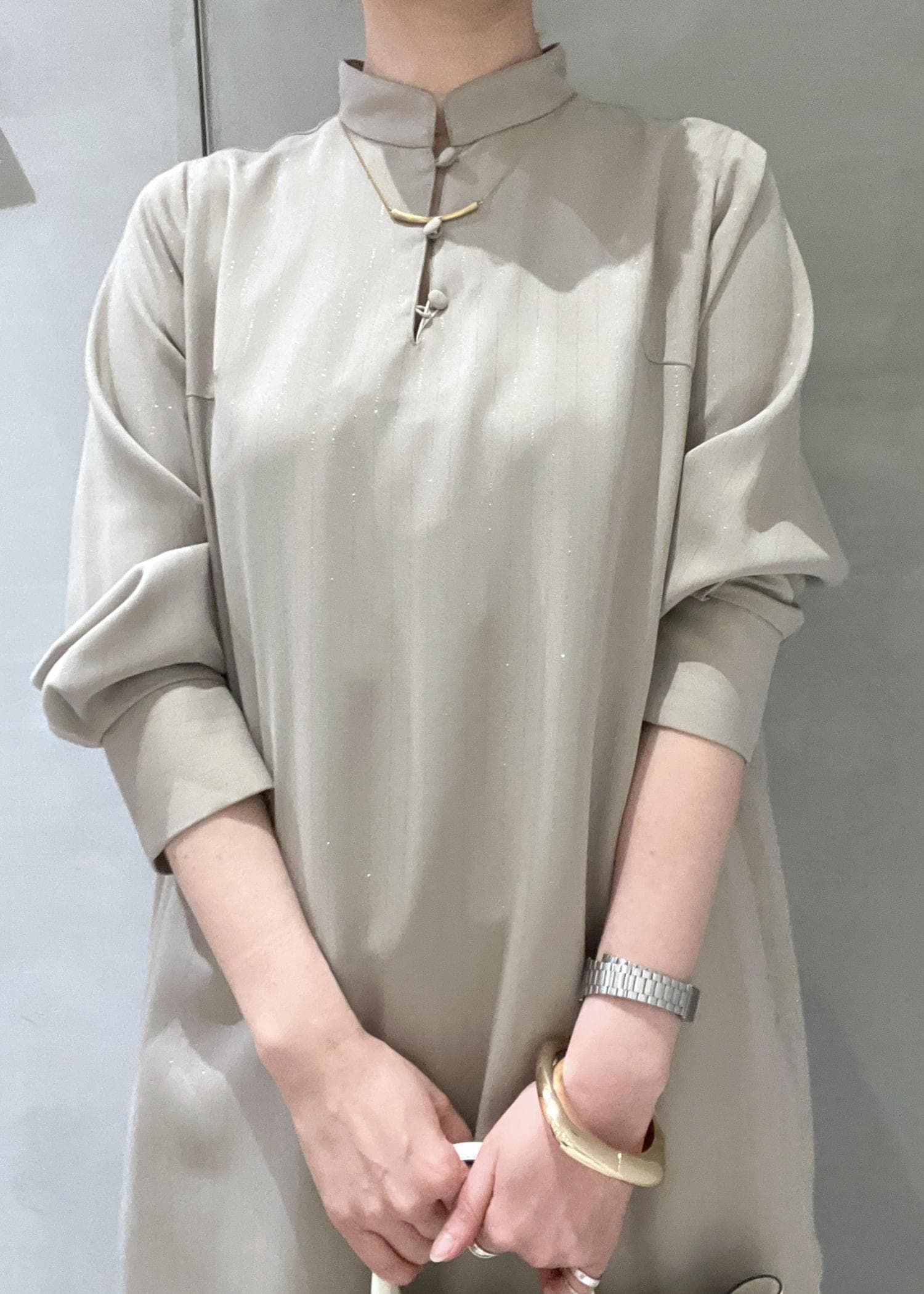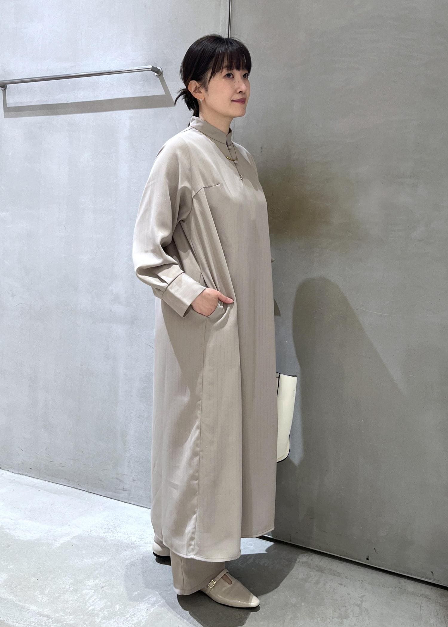 LE CERCLE par ropéラメストライプワンピースベージュ / F¥10,450レビューさらっとした落ち感のある素材で、身体のラインを拾いにくいのでスラっと見えます。細いピンストライプがラメ糸で入っていて動きによってキラッとさりげなく光るので華やかさもアップ!